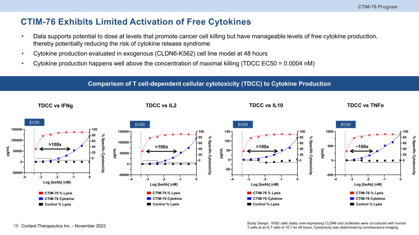 CTIM-76 Induces Specific Lysis CTIM-76 showed potent and specific killing of even those cell lines with very low CLDN6 expression Context Therapeutics Inc. - November 202317 K562-CLDN6 OV90 HEK CLDN6 Expression High Medium Low CTIM-76 (EC50) 0.0004 nM 0.049 nM 2.79 nM OV90 Cell LineK562-CLDN6 Cell Line HEK Cell Line -4 -3 -2 -1 0 0 50 100 Log [bsAb] (nM) % S pe ci fic C yt ot ox ic ity CTIM-76 Negative Ctrl -4 -2 0 2 4 -50 0 50 100 Log [bsAb] (nM) % S pe cif ic Cy to to xic ity -4 -2 0 2 4 -50 0 50 100 Log [bsAb] (nM) % S pe cif ic Cy to to xic ity CTIM-76 Negative Ctrl CTIM-76 Negative Ctrl CTIM-76 Program