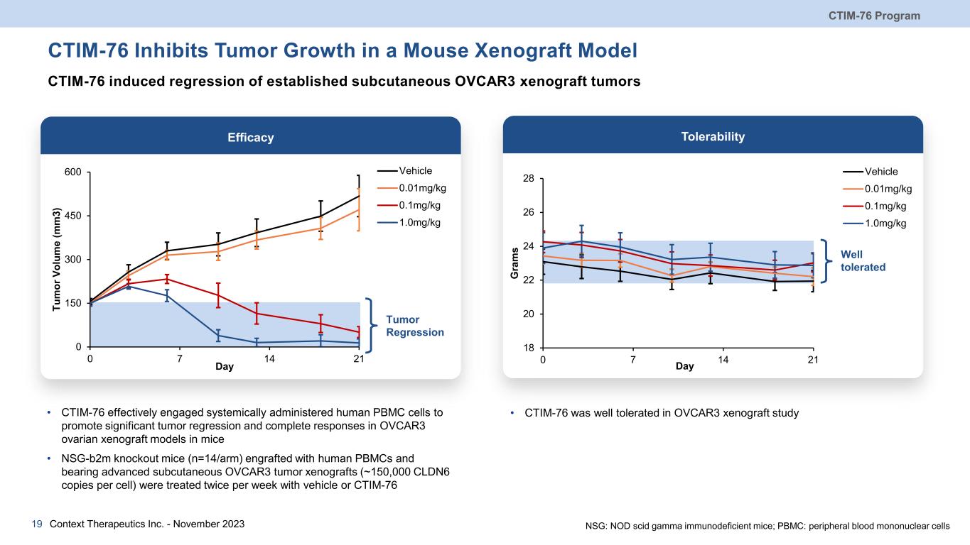 CTIM-76 Program Context Therapeutics Inc. - November 202318 CTIM-76 Exhibits Limited Activation of Free Cytokines • Data supports potential to dose at levels that promote cancer cell killing but have manageable levels of free cytokine production, thereby potentially reducing the risk of cytokine release syndrome • Cytokine production evaluated in exogenous (CLDN6-K562) cell line model at 48 hours • Cytokine production happens well above the concentration of maximal killing (TDCC EC50 = 0.0004 nM) CTIM-76 Cytokine Control % Lysis CTIM-76 % Lysis TDCC vs IL2 -4 -3 -2 -1 0 -50000 0 50000 100000 150000 0 20 40 60 80 100 Log [bsAb] (nM) pg /m L % Specific Cytotoxicity EC50 TDCC vs IFNg EC50 -4 -3 -2 -1 0 -50000 0 50000 100000 150000 0 20 40 60 80 100 Log [bsAb] (nM) pg /m L % Specific Cytotoxicity TDCC vs TNFα EC50 -4 -3 -2 -1 0 -500 0 500 1000 0 20 40 60 80 100 Log [bsAb] (nM) pg /m L % Specific Cytotoxicity TDCC vs IL10 EC50 -4 -3 -2 -1 0 -50 0 50 100 150 0 20 40 60 80 100 Log [bsAb] (nM) pg /m L % Specific Cytotoxicity Study Design: K562 cells stably over-expressing CLDN6 and luciferase were co-cultured with human T cells at an E:T ratio of 10:1 for 48 hours. Cytotoxicity was determined by luminescence imaging. CTIM-76 Cytokine Control % Lysis CTIM-76 % Lysis CTIM-76 Cytokine Control % Lysis CTIM-76 % Lysis CTIM-76 Cytokine Control % Lysis CTIM-76 % Lysis Comparison of T cell-dependent cellular cytotoxicity (TDCC) to Cytokine Production >100x >100x >100x ~100x