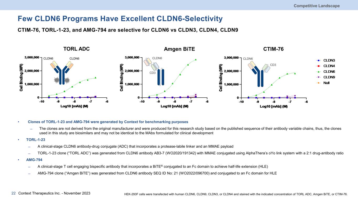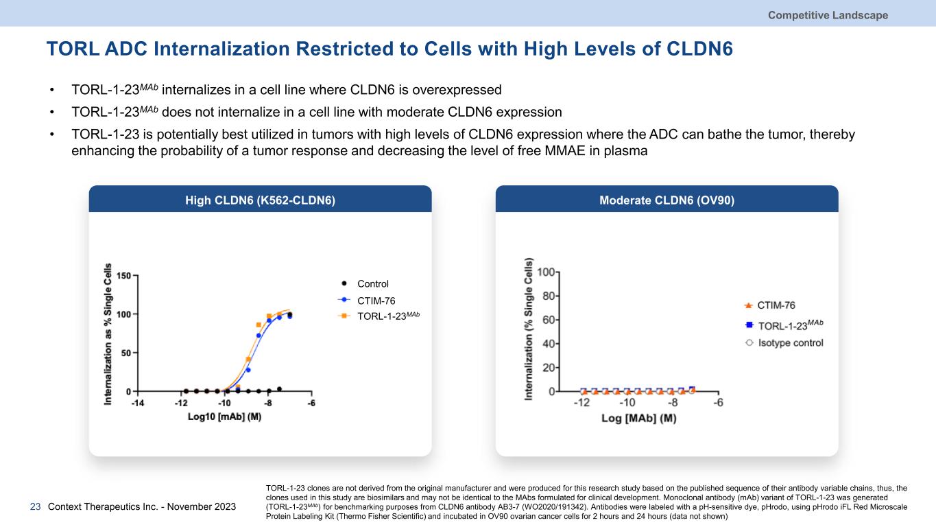 Few CLDN6 Programs Have Excellent CLDN6-Selectivity CTIM-76, TORL-1-23, and AMG-794 are selective for CLDN6 vs CLDN3, CLDN4, CLDN9 Competitive Landscape Context Therapeutics Inc. - November 202322 HEK-293F cells were transfected with human CLDN6, CLDN9, CLDN3, or CLDN4 and stained with the indicated concentration of TORL ADC, Amgen BiTE, or CTIM-76. TORL ADC Amgen BiTE CTIM-76 • Clones of TORL-1-23 and AMG-794 were generated by Context for benchmarking purposes ̶ The clones are not derived from the original manufacturer and were produced for this research study based on the published sequence of their antibody variable chains, thus, the clones used in this study are biosimilars and may not be identical to the MAbs formulated for clinical development • TORL-1-23 ̶ A clinical-stage CLDN6 antibody-drug conjugate (ADC) that incorporates a protease-labile linker and an MMAE payload ̶ TORL-1-23 clone (“TORL ADC”) was generated from CLDN6 antibody AB3-7 (WO2020/191342) with MMAE conjugated using AlphaThera’s oYo link system with a 2:1 drug-antibody ratio • AMG-794 ̶ A clinical-stage T cell engaging bispecific antibody that incorporates a BiTE® conjugated to an Fc domain to achieve half-life extension (HLE) ̶ AMG-794 clone (“Amgen BiTE”) was generated from CLDN6 antibody SEQ ID No: 21 (WO2022/096700) and conjugated to an Fc domain for HLE CLDN6 CD3 CLDN6 CD3 CLDN6 CLDN6