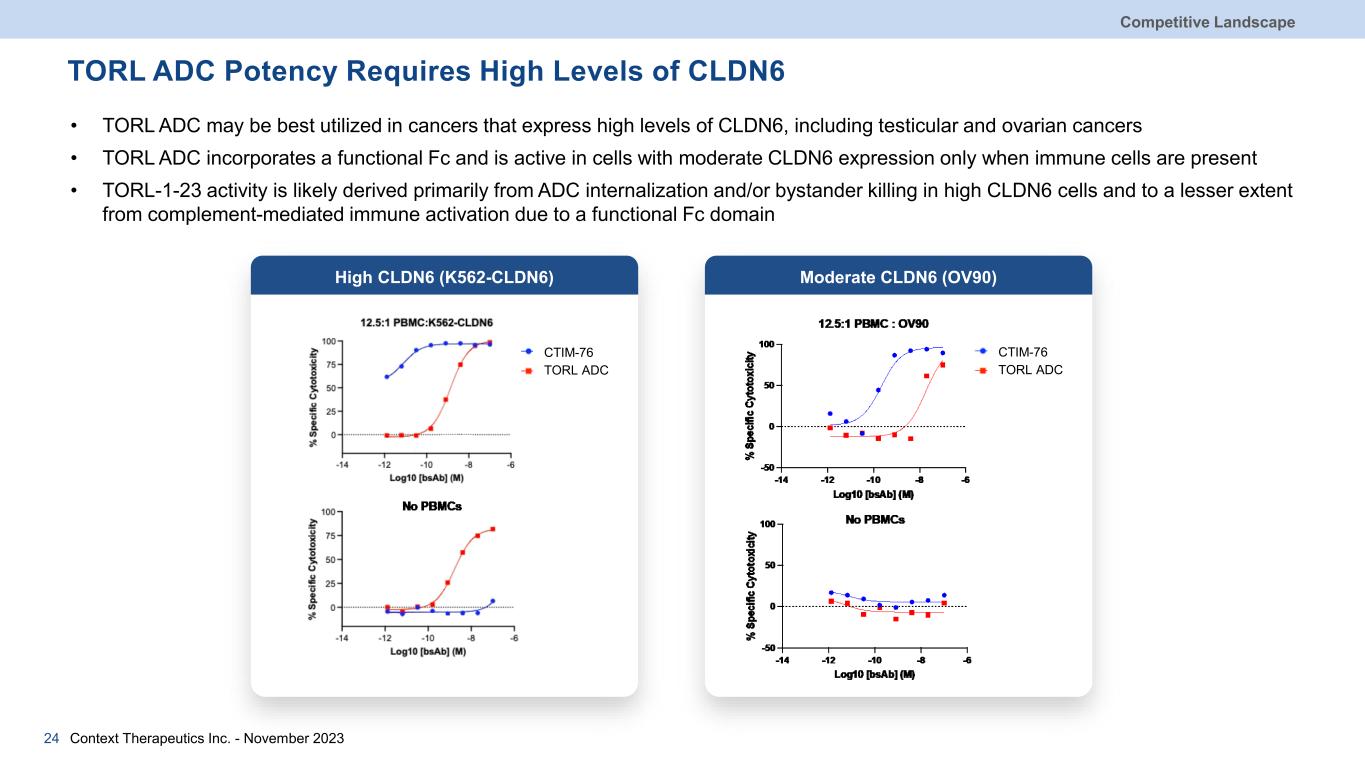 Competitive Landscape TORL ADC Internalization Restricted to Cells with High Levels of CLDN6 Context Therapeutics Inc. - November 202323 • TORL-1-23MAb internalizes in a cell line where CLDN6 is overexpressed • TORL-1-23MAb does not internalize in a cell line with moderate CLDN6 expression • TORL-1-23 is potentially best utilized in tumors with high levels of CLDN6 expression where the ADC can bathe the tumor, thereby enhancing the probability of a tumor response and decreasing the level of free MMAE in plasma High CLDN6 (K562-CLDN6) Moderate CLDN6 (OV90) TORL-1-23 clones are not derived from the original manufacturer and were produced for this research study based on the published sequence of their antibody variable chains, thus, the clones used in this study are biosimilars and may not be identical to the MAbs formulated for clinical development. Monoclonal antibody (mAb) variant of TORL-1-23 was generated (TORL-1-23MAb) for benchmarking purposes from CLDN6 antibody AB3-7 (WO2020/191342). Antibodies were labeled with a pH-sensitive dye, pHrodo, using pHrodo iFL Red Microscale Protein Labeling Kit (Thermo Fisher Scientific) and incubated in OV90 ovarian cancer cells for 2 hours and 24 hours (data not shown) TORL-1-23MAb CTIM-76 Control