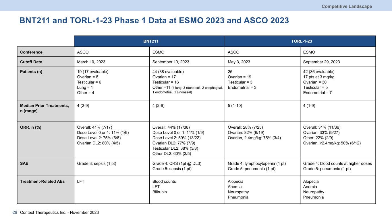 BNT211 and TORL-1-23 Phase 1 Data at ESMO 2023 and ASCO 2023 Competitive Landscape Context Therapeutics Inc. - November 202326 BNT211 TORL-1-23 Conference ASCO ESMO ASCO ESMO Cutoff Date March 10, 2023 September 10, 2023 May 3, 2023 September 29, 2023 Patients (n) 19 (17 evaluable) Ovarian = 8 Testicular = 6 Lung = 1 Other = 4 44 (38 evaluable) Ovarian = 17 Testicular = 16 Other =11 (4 lung, 3 round cell, 2 esophageal, 1 endometrial, 1 sinonasal) 25 Ovarian = 19 Testicular = 3 Endometrial = 3 42 (36 evaluable) 17 pts at 3 mg/kg Ovarian = 30 Testicular = 5 Endometrial = 7 Median Prior Treatments, n (range) 4 (2-9) 4 (2-9) 5 (1-10) 4 (1-9) ORR, n (%) Overall: 41% (7/17) Dose Level 0 or 1: 11% (1/9) Dose Level 2: 75% (6/8) Ovarian DL2: 80% (4/5) Overall: 44% (17/38) Dose Level 0 or 1: 11% (1/9) Dose Level 2: 59% (13/22) Ovarian DL2: 77% (7/9) Testicular DL2: 38% (3/8) Other DL2: 60% (3/5) Overall: 28% (7/25) Ovarian: 32% (6/19) Ovarian, 2.4mg/kg: 75% (3/4) Overall: 31% (11/36) Ovarian: 33% (9/27) Other: 22% (2/9) Ovarian, ≥2.4mg/kg: 50% (6/12) SAE Grade 3: sepsis (1 pt) Grade 4: CRS (1pt @ DL3) Grade 5: sepsis (1 pt) Grade 4: lymphocytopenia (1 pt) Grade 5: pneumonia (1 pt) Grade 4: blood counts at higher doses Grade 5: pneumonia (1 pt) Treatment-Related AEs LFT Blood counts LFT Bilirubin Alopecia Anemia Neuropathy Pneumonia Alopecia Anemia Neuropathy Pneumonia