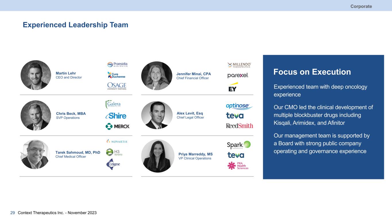 Corporate Experienced Leadership Team • Experienced team with deep oncology experience • Our CMO led the clinical development of multiple blockbuster drugs including Kisqali, Arimidex, and Afinitor • Our management team is supported by a Board with strong public company operating and governance experience Focus on Execution Martin Lehr CEO and Director Tarek Sahmoud, MD, PhD Chief Medical Officer Alex Levit, Esq Chief Legal Officer Jennifer Minai, CPA Chief Financial Officer Chris Beck, MBA SVP Operations Priya Marreddy, MS VP Clinical Operations Context Therapeutics Inc. - November 202329