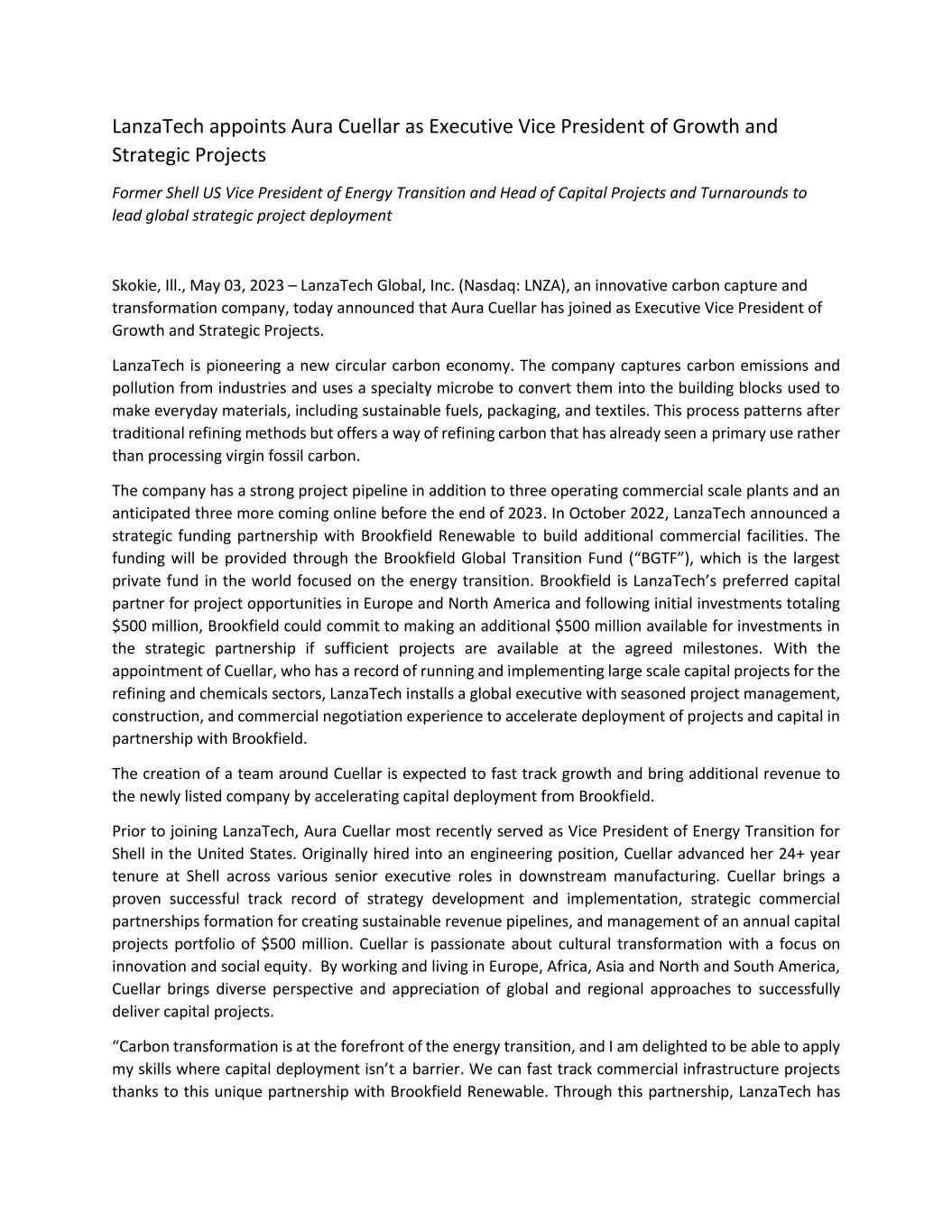 LanzaTech appoints Aura Cuellar as Executive Vice President of Growth and Strategic Projects Former Shell US Vice President of Energy Transition and Head of Capital Projects and Turnarounds to lead global strategic project deployment Skokie, Ill., May 03, 2023 – LanzaTech Global, Inc. (Nasdaq: LNZA), an innovative carbon capture and transformation company, today announced that Aura Cuellar has joined as Executive Vice President of Growth and Strategic Projects. LanzaTech is pioneering a new circular carbon economy. The company captures carbon emissions and pollution from industries and uses a specialty microbe to convert them into the building blocks used to make everyday materials, including sustainable fuels, packaging, and textiles. This process patterns after traditional refining methods but offers a way of refining carbon that has already seen a primary use rather than processing virgin fossil carbon. The company has a strong project pipeline in addition to three operating commercial scale plants and an anticipated three more coming online before the end of 2023. In October 2022, LanzaTech announced a strategic funding partnership with Brookfield Renewable to build additional commercial facilities. The funding will be provided through the Brookfield Global Transition Fund (“BGTF”), which is the largest private fund in the world focused on the energy transition. Brookfield is LanzaTech’s preferred capital partner for project opportunities in Europe and North America and following initial investments totaling $500 million, Brookfield could commit to making an additional $500 million available for investments in the strategic partnership if sufficient projects are available at the agreed milestones. With the appointment of Cuellar, who has a record of running and implementing large scale capital projects for the refining and chemicals sectors, LanzaTech installs a global executive with seasoned project management, construction, and commercial negotiation experience to accelerate deployment of projects and capital in partnership with Brookfield. The creation of a team around Cuellar is expected to fast track growth and bring additional revenue to the newly listed company by accelerating capital deployment from Brookfield. Prior to joining LanzaTech, Aura Cuellar most recently served as Vice President of Energy Transition for Shell in the United States. Originally hired into an engineering position, Cuellar advanced her 24+ year tenure at Shell across various senior executive roles in downstream manufacturing. Cuellar brings a proven successful track record of strategy development and implementation, strategic commercial partnerships formation for creating sustainable revenue pipelines, and management of an annual capital projects portfolio of $500 million. Cuellar is passionate about cultural transformation with a focus on innovation and social equity. By working and living in Europe, Africa, Asia and North and South America, Cuellar brings diverse perspective and appreciation of global and regional approaches to successfully deliver capital projects. “Carbon transformation is at the forefront of the energy transition, and I am delighted to be able to apply my skills where capital deployment isn’t a barrier. We can fast track commercial infrastructure projects thanks to this unique partnership with Brookfield Renewable. Through this partnership, LanzaTech has