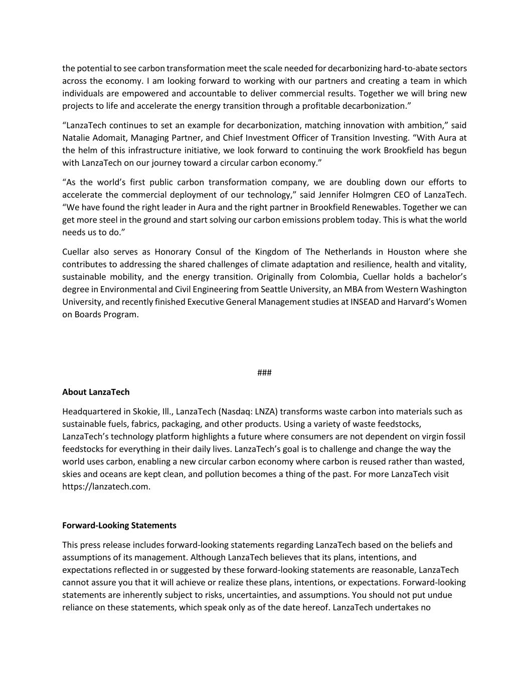 the potential to see carbon transformation meet the scale needed for decarbonizing hard-to-abate sectors across the economy. I am looking forward to working with our partners and creating a team in which individuals are empowered and accountable to deliver commercial results. Together we will bring new projects to life and accelerate the energy transition through a profitable decarbonization.” “LanzaTech continues to set an example for decarbonization, matching innovation with ambition,” said Natalie Adomait, Managing Partner, and Chief Investment Officer of Transition Investing. “With Aura at the helm of this infrastructure initiative, we look forward to continuing the work Brookfield has begun with LanzaTech on our journey toward a circular carbon economy.” “As the world’s first public carbon transformation company, we are doubling down our efforts to accelerate the commercial deployment of our technology,” said Jennifer Holmgren CEO of LanzaTech. “We have found the right leader in Aura and the right partner in Brookfield Renewables. Together we can get more steel in the ground and start solving our carbon emissions problem today. This is what the world needs us to do.” Cuellar also serves as Honorary Consul of the Kingdom of The Netherlands in Houston where she contributes to addressing the shared challenges of climate adaptation and resilience, health and vitality, sustainable mobility, and the energy transition. Originally from Colombia, Cuellar holds a bachelor’s degree in Environmental and Civil Engineering from Seattle University, an MBA from Western Washington University, and recently finished Executive General Management studies at INSEAD and Harvard’s Women on Boards Program. ### About LanzaTech Headquartered in Skokie, Ill., LanzaTech (Nasdaq: LNZA) transforms waste carbon into materials such as sustainable fuels, fabrics, packaging, and other products. Using a variety of waste feedstocks, LanzaTech’s technology platform highlights a future where consumers are not dependent on virgin fossil feedstocks for everything in their daily lives. LanzaTech’s goal is to challenge and change the way the world uses carbon, enabling a new circular carbon economy where carbon is reused rather than wasted, skies and oceans are kept clean, and pollution becomes a thing of the past. For more LanzaTech visit https://lanzatech.com. Forward-Looking Statements This press release includes forward-looking statements regarding LanzaTech based on the beliefs and assumptions of its management. Although LanzaTech believes that its plans, intentions, and expectations reflected in or suggested by these forward-looking statements are reasonable, LanzaTech cannot assure you that it will achieve or realize these plans, intentions, or expectations. Forward-looking statements are inherently subject to risks, uncertainties, and assumptions. You should not put undue reliance on these statements, which speak only as of the date hereof. LanzaTech undertakes no