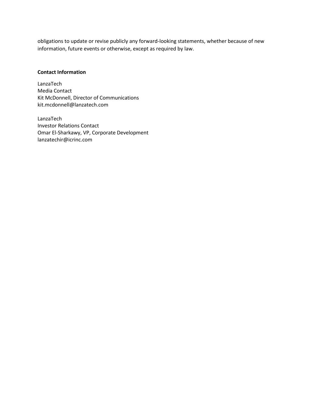 obligations to update or revise publicly any forward-looking statements, whether because of new information, future events or otherwise, except as required by law. Contact Information LanzaTech Media Contact Kit McDonnell, Director of Communications kit.mcdonnell@lanzatech.com LanzaTech Investor Relations Contact Omar El-Sharkawy, VP, Corporate Development lanzatechir@icrinc.com