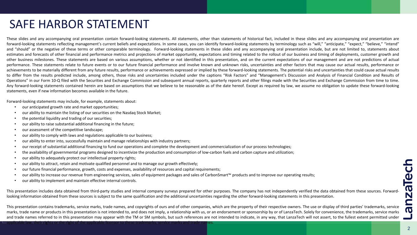 These slides and any accompanying oral presentation contain forward-looking statements. All statements, other than statements of historical fact, included in these slides and any accompanying oral presentation are forward-looking statements reflecting management’s current beliefs and expectations. In some cases, you can identify forward-looking statements by terminology such as “will,” “anticipate,” “expect,” “believe,” “intend” and “should” or the negative of these terms or other comparable terminology. Forward-looking statements in these slides and any accompanying oral presentation include, but are not limited to, statements about estimates and forecasts of other financial and performance metrics and projections of market opportunity, expectations and timing related to the rollout of our business and timing of deployments, customer growth and other business milestones. These statements are based on various assumptions, whether or not identified in this presentation, and on the current expectations of our management and are not predictions of actual performance. These statements relate to future events or to our future financial performance and involve known and unknown risks, uncertainties and other factors that may cause our actual results, performance or achievements to be materially different from any future results, performance or achievements expressed or implied by these forward-looking statements. The potential risks and uncertainties that could cause actual results to differ from the results predicted include, among others, those risks and uncertainties included under the captions “Risk Factors” and “Management’s Discussion and Analysis of Financial Condition and Results of Operations” in our Form 10-Q filed with the Securities and Exchange Commission and subsequent annual reports, quarterly reports and other filings made with the Securities and Exchange Commission from time to time. Any forward-looking statements contained herein are based on assumptions that we believe to be reasonable as of the date hereof. Except as required by law, we assume no obligation to update these forward-looking statements, even if new information becomes available in the future. Forward-looking statements may include, for example, statements about: • our anticipated growth rate and market opportunities; • our ability to maintain the listing of our securities on the Nasdaq Stock Market; • the potential liquidity and trading of our securities; • our ability to raise substantial additional financing in the future; • our assessment of the competitive landscape; • our ability to comply with laws and regulations applicable to our business; • our ability to enter into, successfully maintain and manage relationships with industry partners; • our receipt of substantial additional financing to fund our operations and complete the development and commercialization of our process technologies; • the availability of governmental programs designed to incentivize the production and consumption of low-carbon fuels and carbon capture and utilization; • our ability to adequately protect our intellectual property rights; • our ability to attract, retain and motivate qualified personnel and to manage our growth effectively; • our future financial performance, growth, costs and expenses, availability of resources and capital requirements; • our ability to increase our revenue from engineering services, sales of equipment packages and sales of CarbonSmart products and to improve our operating results; • our ability to implement and maintain effective internal controls. This presentation includes data obtained from third-party studies and internal company surveys prepared for other purposes. The company has not independently verified the data obtained from these sources. Forward- looking information obtained from these sources is subject to the same qualification and the additional uncertainties regarding the other forward-looking statements in this presentation. This presentation contains trademarks, service marks, trade names, and copyrights of ours and of other companies, which are the property of their respective owners. The use or display of third parties’ trademarks, service marks, trade name or products in this presentation is not intended to, and does not imply, a relationship with us, or an endorsement or sponsorship by or of LanzaTech. Solely for convenience, the trademarks, service marks and trade names referred to in this presentation may appear with the TM or SM symbols, but such references are not intended to indicate, in any way, that LanzaTech will not assert, to the fullest extent permitted under applicable law, their rights or the right of the applicable licensor to these trademarks, service marks and trade names. SAFE HARBOR STATEMENT 2