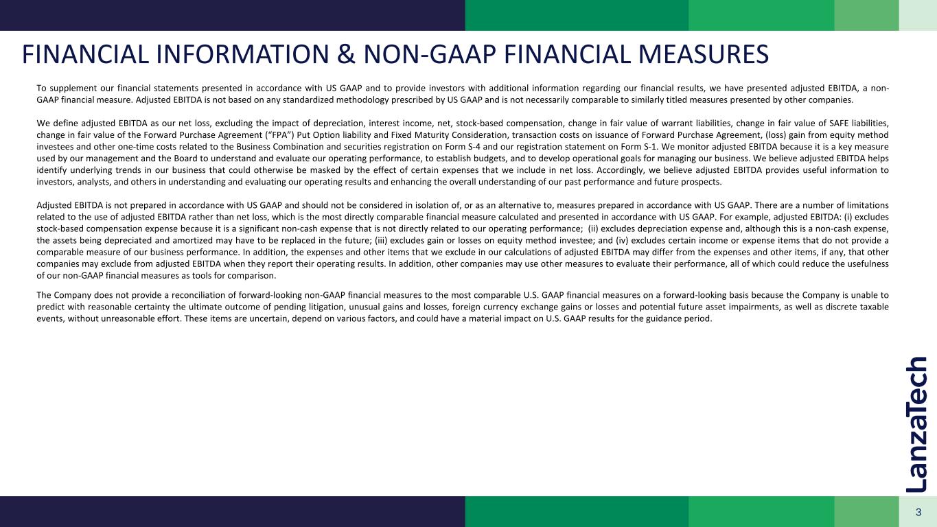FINANCIAL INFORMATION & NON-GAAP FINANCIAL MEASURES 3 To supplement our financial statements presented in accordance with US GAAP and to provide investors with additional information regarding our financial results, we have presented adjusted EBITDA, a non- GAAP financial measure. Adjusted EBITDA is not based on any standardized methodology prescribed by US GAAP and is not necessarily comparable to similarly titled measures presented by other companies. We define adjusted EBITDA as our net loss, excluding the impact of depreciation, interest income, net, stock-based compensation, change in fair value of warrant liabilities, change in fair value of SAFE liabilities, change in fair value of the Forward Purchase Agreement (“FPA”) Put Option liability and Fixed Maturity Consideration, transaction costs on issuance of Forward Purchase Agreement, (loss) gain from equity method investees and other one-time costs related to the Business Combination and securities registration on Form S-4 and our registration statement on Form S-1. We monitor adjusted EBITDA because it is a key measure used by our management and the Board to understand and evaluate our operating performance, to establish budgets, and to develop operational goals for managing our business. We believe adjusted EBITDA helps identify underlying trends in our business that could otherwise be masked by the effect of certain expenses that we include in net loss. Accordingly, we believe adjusted EBITDA provides useful information to investors, analysts, and others in understanding and evaluating our operating results and enhancing the overall understanding of our past performance and future prospects. Adjusted EBITDA is not prepared in accordance with US GAAP and should not be considered in isolation of, or as an alternative to, measures prepared in accordance with US GAAP. There are a number of limitations related to the use of adjusted EBITDA rather than net loss, which is the most directly comparable financial measure calculated and presented in accordance with US GAAP. For example, adjusted EBITDA: (i) excludes stock-based compensation expense because it is a significant non-cash expense that is not directly related to our operating performance; (ii) excludes depreciation expense and, although this is a non-cash expense, the assets being depreciated and amortized may have to be replaced in the future; (iii) excludes gain or losses on equity method investee; and (iv) excludes certain income or expense items that do not provide a comparable measure of our business performance. In addition, the expenses and other items that we exclude in our calculations of adjusted EBITDA may differ from the expenses and other items, if any, that other companies may exclude from adjusted EBITDA when they report their operating results. In addition, other companies may use other measures to evaluate their performance, all of which could reduce the usefulness of our non-GAAP financial measures as tools for comparison. The Company does not provide a reconciliation of forward-looking non-GAAP financial measures to the most comparable U.S. GAAP financial measures on a forward-looking basis because the Company is unable to predict with reasonable certainty the ultimate outcome of pending litigation, unusual gains and losses, foreign currency exchange gains or losses and potential future asset impairments, as well as discrete taxable events, without unreasonable effort. These items are uncertain, depend on various factors, and could have a material impact on U.S. GAAP results for the guidance period.