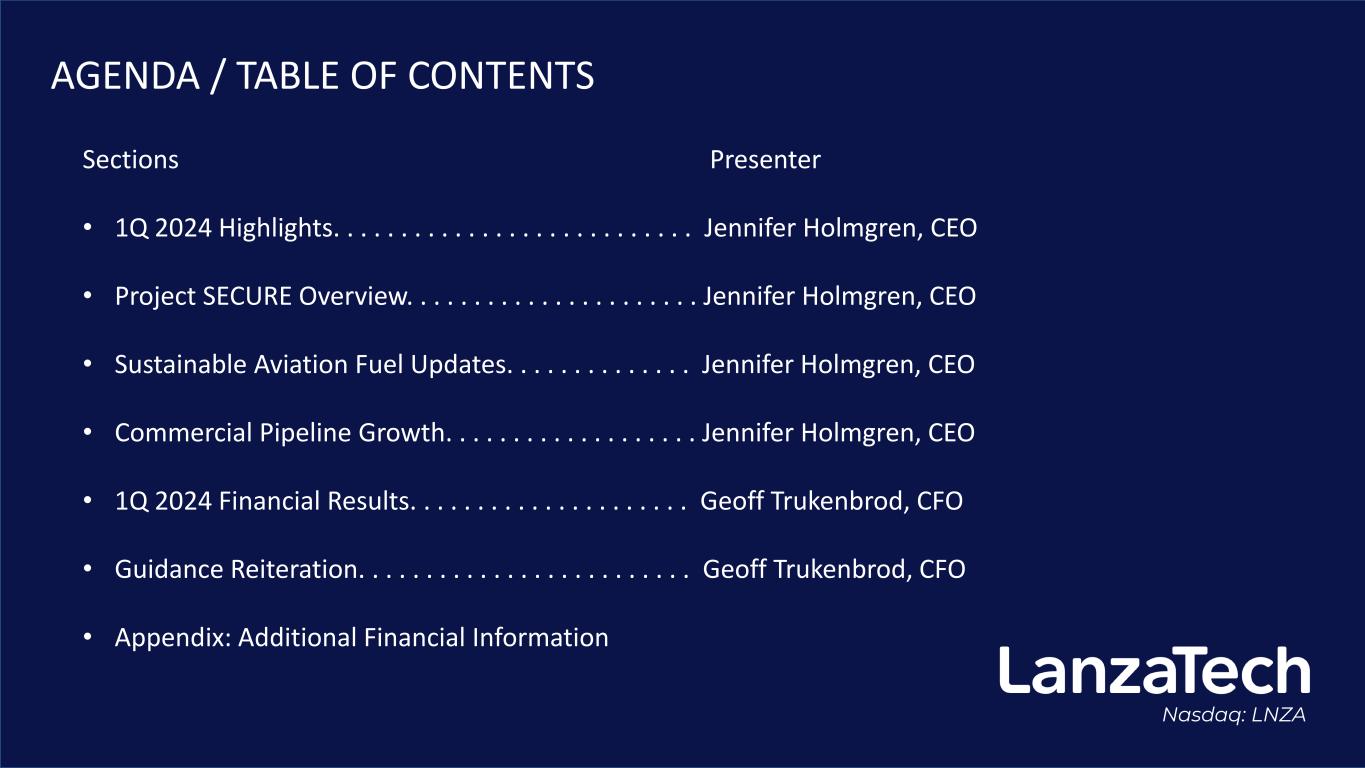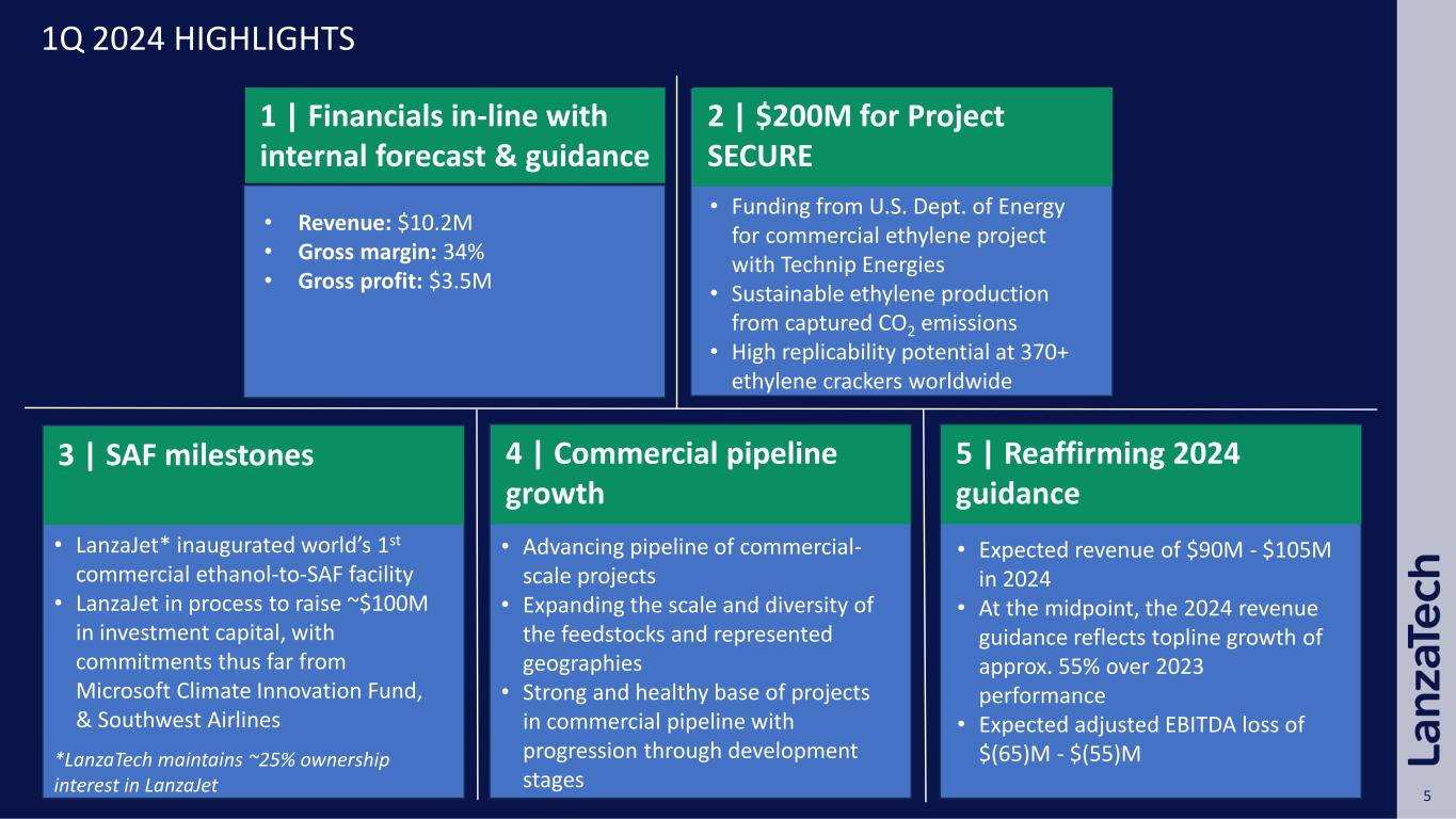 4 Biorefining: CCT Plants AGENDA / TABLE OF CONTENTS Sections Presenter • 1Q 2024 Highlights. . . . . . . . . . . . . . . . . . . . . . . . . . . Jennifer Holmgren, CEO • Project SECURE Overview. . . . . . . . . . . . . . . . . . . . . . Jennifer Holmgren, CEO • Sustainable Aviation Fuel Updates. . . . . . . . . . . . . . Jennifer Holmgren, CEO • Commercial Pipeline Growth. . . . . . . . . . . . . . . . . . . Jennifer Holmgren, CEO • 1Q 2024 Financial Results. . . . . . . . . . . . . . . . . . . . . Geoff Trukenbrod, CFO • Guidance Reiteration. . . . . . . . . . . . . . . . . . . . . . . . . Geoff Trukenbrod, CFO • Appendix: Additional Financial Information Nasdaq: LNZA