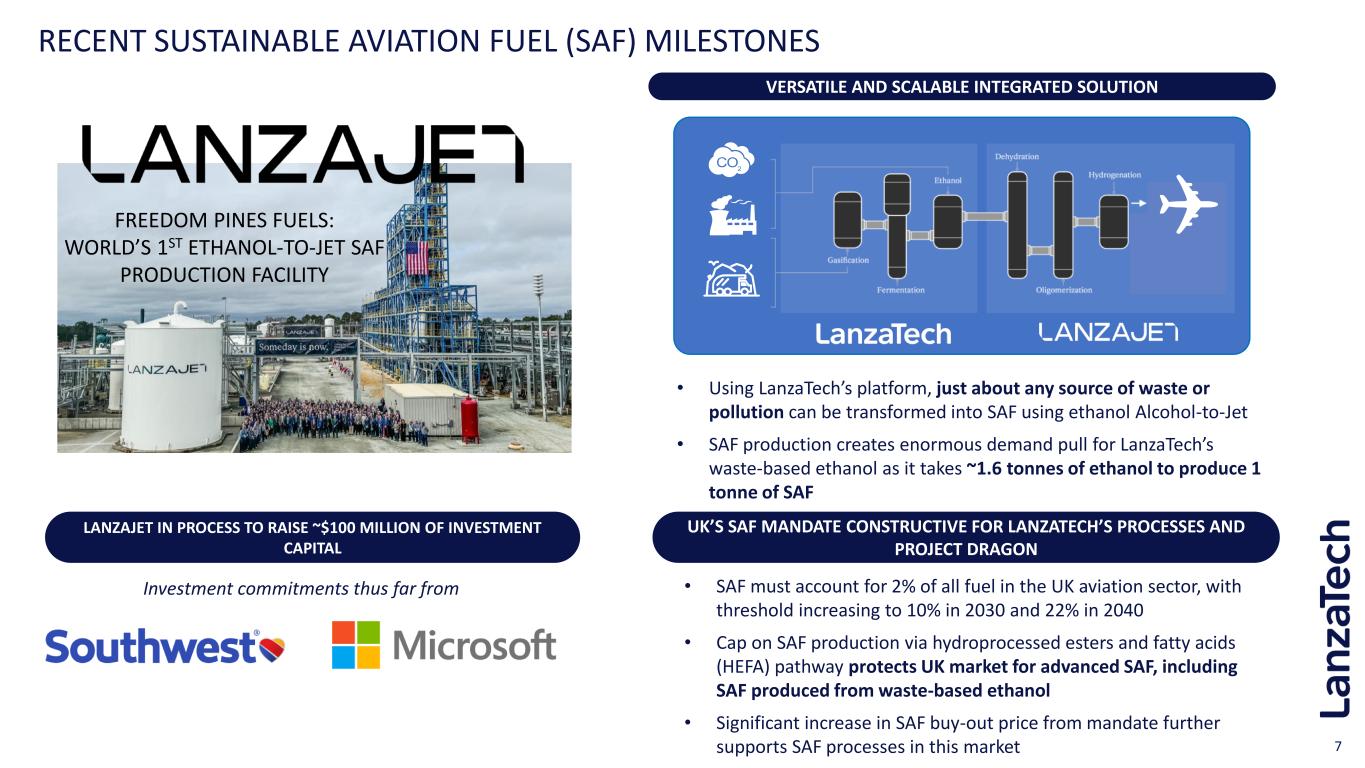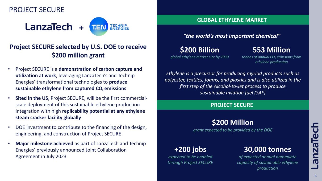 6 PROJECT SECURE Project SECURE selected by U.S. DOE to receive $200 million grant • Project SECURE is a demonstration of carbon capture and utilization at work, leveraging LanzaTech’s and Technip Energies’ transformational technologies to produce sustainable ethylene from captured CO2 emissions • Sited in the US, Project SECURE, will be the first commercial- scale deployment of this sustainable ethylene production integration with high replicability potential at any ethylene steam cracker facility globally • DOE investment to contribute to the financing of the design, engineering, and construction of Project SECURE • Major milestone achieved as part of LanzaTech and Technip Energies’ previously announced Joint Collaboration Agreement in July 2023 GLOBAL ETHYLENE MARKET “the world’s most important chemical” $200 Billion global ethylene market size by 2030 PROJECT SECURE 553 Million tonnes of annual CO2 emissions from ethylene production Ethylene is a precursor for producing myriad products such as polyester, textiles, foams, and plastics and is also utilized in the first step of the Alcohol-to-Jet process to produce sustainable aviation fuel​ (SAF) $200 Million grant expected to be provided by the DOE +200 jobs expected to be enabled through Project SECURE 30,000 tonnes of expected annual nameplate capacity of sustainable ethylene production +