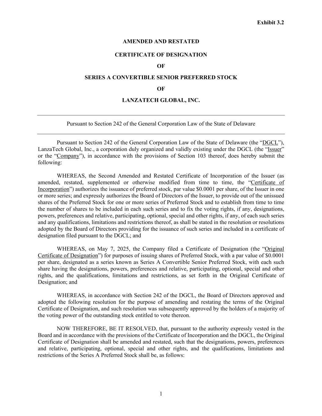 Exhibit 3.2 1 AMENDED AND RESTATED CERTIFICATE OF DESIGNATION OF SERIES A CONVERTIBLE SENIOR PREFERRED STOCK OF LANZATECH GLOBAL, INC. Pursuant to Section 242 of the General Corporation Law of the State of Delaware Pursuant to Section 242 of the General Corporation Law of the State of Delaware (the “DGCL”), LanzaTech Global, Inc., a corporation duly organized and validly existing under the DGCL (the “Issuer” or the “Company”), in accordance with the provisions of Section 103 thereof, does hereby submit the following: WHEREAS, the Second Amended and Restated Certificate of Incorporation of the Issuer (as amended, restated, supplemented or otherwise modified from time to time, the “Certificate of Incorporation”) authorizes the issuance of preferred stock, par value $0.0001 per share, of the Issuer in one or more series; and expressly authorizes the Board of Directors of the Issuer, to provide out of the unissued shares of the Preferred Stock for one or more series of Preferred Stock and to establish from time to time the number of shares to be included in each such series and to fix the voting rights, if any, designations, powers, preferences and relative, participating, optional, special and other rights, if any, of each such series and any qualifications, limitations and restrictions thereof, as shall be stated in the resolution or resolutions adopted by the Board of Directors providing for the issuance of such series and included in a certificate of designation filed pursuant to the DGCL; and WHEREAS, on May 7, 2025, the Company filed a Certificate of Designation (the “Original Certificate of Designation”) for purposes of issuing shares of Preferred Stock, with a par value of $0.0001 per share, designated as a series known as Series A Convertible Senior Preferred Stock, with each such share having the designations, powers, preferences and relative, participating, optional, special and other rights, and the qualifications, limitations and restrictions, as set forth in the Original Certificate of Designation; and WHEREAS, in accordance with Section 242 of the DGCL, the Board of Directors approved and adopted the following resolution for the purpose of amending and restating the terms of the Original Certificate of Designation, and such resolution was subsequently approved by the holders of a majority of the voting power of the outstanding stock entitled to vote thereon. NOW THEREFORE, BE IT RESOLVED, that, pursuant to the authority expressly vested in the Board and in accordance with the provisions of the Certificate of Incorporation and the DGCL, the Original Certificate of Designation shall be amended and restated, such that the designations, powers, preferences and relative, participating, optional, special and other rights, and the qualifications, limitations and restrictions of the Series A Preferred Stock shall be, as follows: