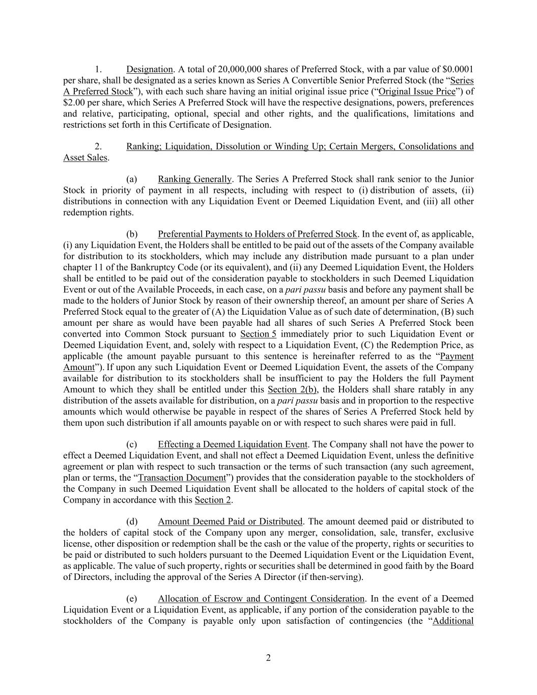 2 1. Designation. A total of 20,000,000 shares of Preferred Stock, with a par value of $0.0001 per share, shall be designated as a series known as Series A Convertible Senior Preferred Stock (the “Series A Preferred Stock”), with each such share having an initial original issue price (“Original Issue Price”) of $2.00 per share, which Series A Preferred Stock will have the respective designations, powers, preferences and relative, participating, optional, special and other rights, and the qualifications, limitations and restrictions set forth in this Certificate of Designation. 2. Ranking; Liquidation, Dissolution or Winding Up; Certain Mergers, Consolidations and Asset Sales. (a) Ranking Generally. The Series A Preferred Stock shall rank senior to the Junior Stock in priority of payment in all respects, including with respect to (i) distribution of assets, (ii) distributions in connection with any Liquidation Event or Deemed Liquidation Event, and (iii) all other redemption rights. (b) Preferential Payments to Holders of Preferred Stock. In the event of, as applicable, (i) any Liquidation Event, the Holders shall be entitled to be paid out of the assets of the Company available for distribution to its stockholders, which may include any distribution made pursuant to a plan under chapter 11 of the Bankruptcy Code (or its equivalent), and (ii) any Deemed Liquidation Event, the Holders shall be entitled to be paid out of the consideration payable to stockholders in such Deemed Liquidation Event or out of the Available Proceeds, in each case, on a pari passu basis and before any payment shall be made to the holders of Junior Stock by reason of their ownership thereof, an amount per share of Series A Preferred Stock equal to the greater of (A) the Liquidation Value as of such date of determination, (B) such amount per share as would have been payable had all shares of such Series A Preferred Stock been converted into Common Stock pursuant to Section 5 immediately prior to such Liquidation Event or Deemed Liquidation Event, and, solely with respect to a Liquidation Event, (C) the Redemption Price, as applicable (the amount payable pursuant to this sentence is hereinafter referred to as the “Payment Amount”). If upon any such Liquidation Event or Deemed Liquidation Event, the assets of the Company available for distribution to its stockholders shall be insufficient to pay the Holders the full Payment Amount to which they shall be entitled under this Section 2(b), the Holders shall share ratably in any distribution of the assets available for distribution, on a pari passu basis and in proportion to the respective amounts which would otherwise be payable in respect of the shares of Series A Preferred Stock held by them upon such distribution if all amounts payable on or with respect to such shares were paid in full. (c) Effecting a Deemed Liquidation Event. The Company shall not have the power to effect a Deemed Liquidation Event, and shall not effect a Deemed Liquidation Event, unless the definitive agreement or plan with respect to such transaction or the terms of such transaction (any such agreement, plan or terms, the “Transaction Document”) provides that the consideration payable to the stockholders of the Company in such Deemed Liquidation Event shall be allocated to the holders of capital stock of the Company in accordance with this Section 2. (d) Amount Deemed Paid or Distributed. The amount deemed paid or distributed to the holders of capital stock of the Company upon any merger, consolidation, sale, transfer, exclusive license, other disposition or redemption shall be the cash or the value of the property, rights or securities to be paid or distributed to such holders pursuant to the Deemed Liquidation Event or the Liquidation Event, as applicable. The value of such property, rights or securities shall be determined in good faith by the Board of Directors, including the approval of the Series A Director (if then-serving). (e) Allocation of Escrow and Contingent Consideration. In the event of a Deemed Liquidation Event or a Liquidation Event, as applicable, if any portion of the consideration payable to the stockholders of the Company is payable only upon satisfaction of contingencies (the “Additional