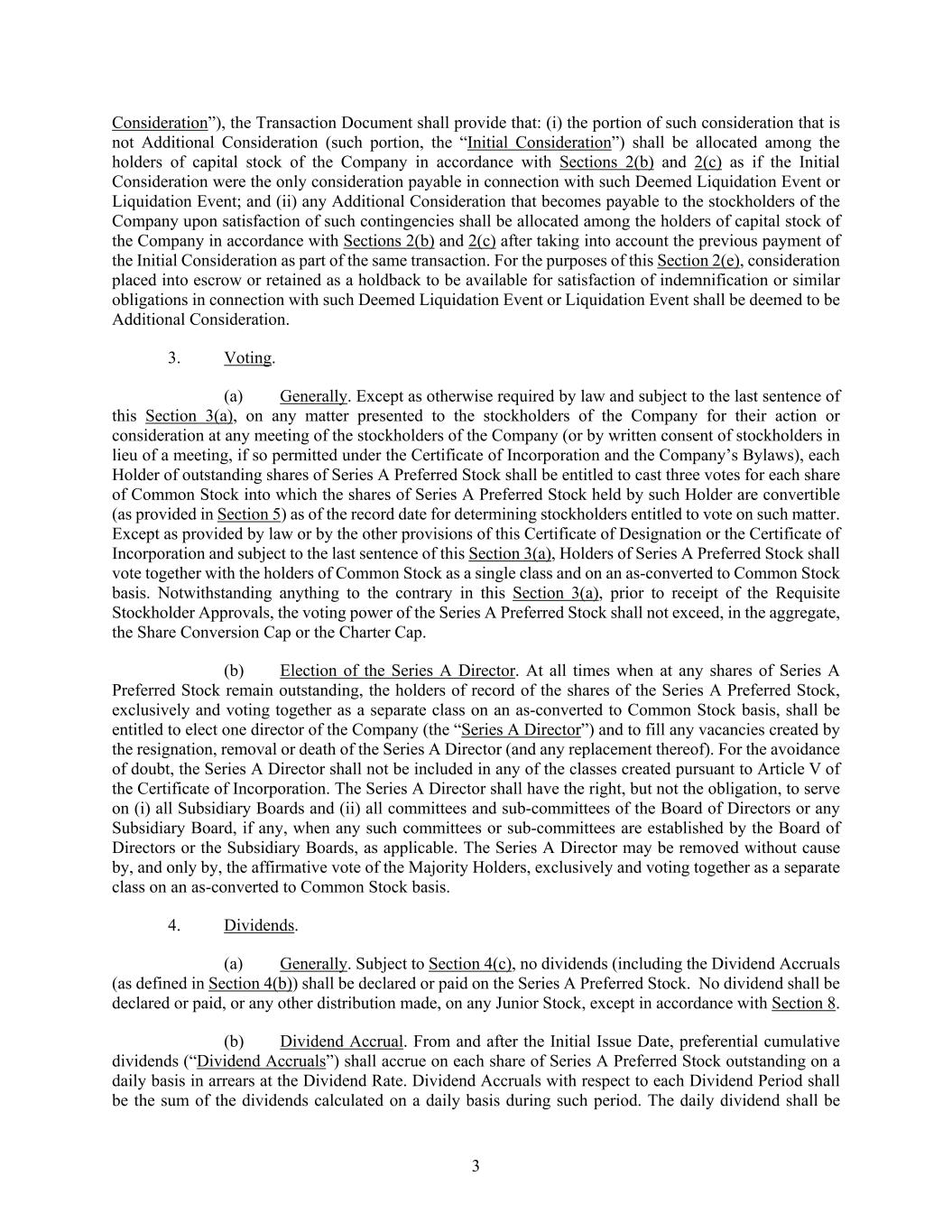 3 Consideration”), the Transaction Document shall provide that: (i) the portion of such consideration that is not Additional Consideration (such portion, the “Initial Consideration”) shall be allocated among the holders of capital stock of the Company in accordance with Sections 2(b) and 2(c) as if the Initial Consideration were the only consideration payable in connection with such Deemed Liquidation Event or Liquidation Event; and (ii) any Additional Consideration that becomes payable to the stockholders of the Company upon satisfaction of such contingencies shall be allocated among the holders of capital stock of the Company in accordance with Sections 2(b) and 2(c) after taking into account the previous payment of the Initial Consideration as part of the same transaction. For the purposes of this Section 2(e), consideration placed into escrow or retained as a holdback to be available for satisfaction of indemnification or similar obligations in connection with such Deemed Liquidation Event or Liquidation Event shall be deemed to be Additional Consideration. 3. Voting. (a) Generally. Except as otherwise required by law and subject to the last sentence of this Section 3(a), on any matter presented to the stockholders of the Company for their action or consideration at any meeting of the stockholders of the Company (or by written consent of stockholders in lieu of a meeting, if so permitted under the Certificate of Incorporation and the Company’s Bylaws), each Holder of outstanding shares of Series A Preferred Stock shall be entitled to cast three votes for each share of Common Stock into which the shares of Series A Preferred Stock held by such Holder are convertible (as provided in Section 5) as of the record date for determining stockholders entitled to vote on such matter. Except as provided by law or by the other provisions of this Certificate of Designation or the Certificate of Incorporation and subject to the last sentence of this Section 3(a), Holders of Series A Preferred Stock shall vote together with the holders of Common Stock as a single class and on an as-converted to Common Stock basis. Notwithstanding anything to the contrary in this Section 3(a), prior to receipt of the Requisite Stockholder Approvals, the voting power of the Series A Preferred Stock shall not exceed, in the aggregate, the Share Conversion Cap or the Charter Cap. (b) Election of the Series A Director. At all times when at any shares of Series A Preferred Stock remain outstanding, the holders of record of the shares of the Series A Preferred Stock, exclusively and voting together as a separate class on an as-converted to Common Stock basis, shall be entitled to elect one director of the Company (the “Series A Director”) and to fill any vacancies created by the resignation, removal or death of the Series A Director (and any replacement thereof). For the avoidance of doubt, the Series A Director shall not be included in any of the classes created pursuant to Article V of the Certificate of Incorporation. The Series A Director shall have the right, but not the obligation, to serve on (i) all Subsidiary Boards and (ii) all committees and sub-committees of the Board of Directors or any Subsidiary Board, if any, when any such committees or sub-committees are established by the Board of Directors or the Subsidiary Boards, as applicable. The Series A Director may be removed without cause by, and only by, the affirmative vote of the Majority Holders, exclusively and voting together as a separate class on an as-converted to Common Stock basis. 4. Dividends. (a) Generally. Subject to Section 4(c), no dividends (including the Dividend Accruals (as defined in Section 4(b)) shall be declared or paid on the Series A Preferred Stock. No dividend shall be declared or paid, or any other distribution made, on any Junior Stock, except in accordance with Section 8. (b) Dividend Accrual. From and after the Initial Issue Date, preferential cumulative dividends (“Dividend Accruals”) shall accrue on each share of Series A Preferred Stock outstanding on a daily basis in arrears at the Dividend Rate. Dividend Accruals with respect to each Dividend Period shall be the sum of the dividends calculated on a daily basis during such period. The daily dividend shall be