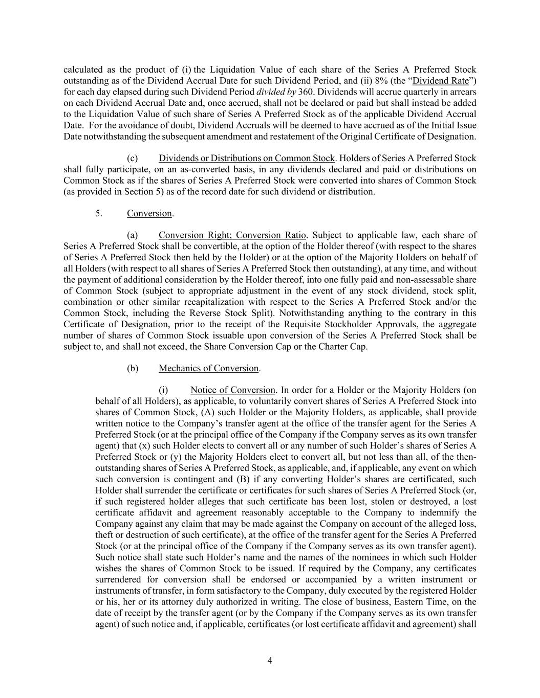 4 calculated as the product of (i) the Liquidation Value of each share of the Series A Preferred Stock outstanding as of the Dividend Accrual Date for such Dividend Period, and (ii) 8% (the “Dividend Rate”) for each day elapsed during such Dividend Period divided by 360. Dividends will accrue quarterly in arrears on each Dividend Accrual Date and, once accrued, shall not be declared or paid but shall instead be added to the Liquidation Value of such share of Series A Preferred Stock as of the applicable Dividend Accrual Date. For the avoidance of doubt, Dividend Accruals will be deemed to have accrued as of the Initial Issue Date notwithstanding the subsequent amendment and restatement of the Original Certificate of Designation. (c) Dividends or Distributions on Common Stock. Holders of Series A Preferred Stock shall fully participate, on an as-converted basis, in any dividends declared and paid or distributions on Common Stock as if the shares of Series A Preferred Stock were converted into shares of Common Stock (as provided in Section 5) as of the record date for such dividend or distribution. 5. Conversion. (a) Conversion Right; Conversion Ratio. Subject to applicable law, each share of Series A Preferred Stock shall be convertible, at the option of the Holder thereof (with respect to the shares of Series A Preferred Stock then held by the Holder) or at the option of the Majority Holders on behalf of all Holders (with respect to all shares of Series A Preferred Stock then outstanding), at any time, and without the payment of additional consideration by the Holder thereof, into one fully paid and non-assessable share of Common Stock (subject to appropriate adjustment in the event of any stock dividend, stock split, combination or other similar recapitalization with respect to the Series A Preferred Stock and/or the Common Stock, including the Reverse Stock Split). Notwithstanding anything to the contrary in this Certificate of Designation, prior to the receipt of the Requisite Stockholder Approvals, the aggregate number of shares of Common Stock issuable upon conversion of the Series A Preferred Stock shall be subject to, and shall not exceed, the Share Conversion Cap or the Charter Cap. (b) Mechanics of Conversion. (i) Notice of Conversion. In order for a Holder or the Majority Holders (on behalf of all Holders), as applicable, to voluntarily convert shares of Series A Preferred Stock into shares of Common Stock, (A) such Holder or the Majority Holders, as applicable, shall provide written notice to the Company’s transfer agent at the office of the transfer agent for the Series A Preferred Stock (or at the principal office of the Company if the Company serves as its own transfer agent) that (x) such Holder elects to convert all or any number of such Holder’s shares of Series A Preferred Stock or (y) the Majority Holders elect to convert all, but not less than all, of the then- outstanding shares of Series A Preferred Stock, as applicable, and, if applicable, any event on which such conversion is contingent and (B) if any converting Holder’s shares are certificated, such Holder shall surrender the certificate or certificates for such shares of Series A Preferred Stock (or, if such registered holder alleges that such certificate has been lost, stolen or destroyed, a lost certificate affidavit and agreement reasonably acceptable to the Company to indemnify the Company against any claim that may be made against the Company on account of the alleged loss, theft or destruction of such certificate), at the office of the transfer agent for the Series A Preferred Stock (or at the principal office of the Company if the Company serves as its own transfer agent). Such notice shall state such Holder’s name and the names of the nominees in which such Holder wishes the shares of Common Stock to be issued. If required by the Company, any certificates surrendered for conversion shall be endorsed or accompanied by a written instrument or instruments of transfer, in form satisfactory to the Company, duly executed by the registered Holder or his, her or its attorney duly authorized in writing. The close of business, Eastern Time, on the date of receipt by the transfer agent (or by the Company if the Company serves as its own transfer agent) of such notice and, if applicable, certificates (or lost certificate affidavit and agreement) shall