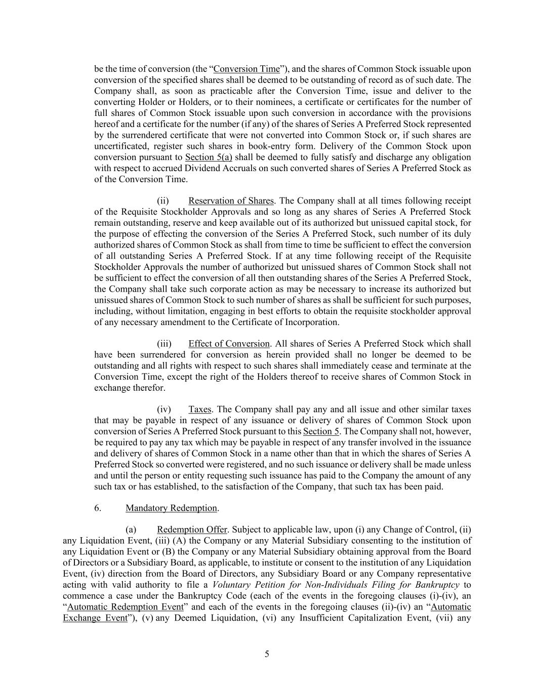 5 be the time of conversion (the “Conversion Time”), and the shares of Common Stock issuable upon conversion of the specified shares shall be deemed to be outstanding of record as of such date. The Company shall, as soon as practicable after the Conversion Time, issue and deliver to the converting Holder or Holders, or to their nominees, a certificate or certificates for the number of full shares of Common Stock issuable upon such conversion in accordance with the provisions hereof and a certificate for the number (if any) of the shares of Series A Preferred Stock represented by the surrendered certificate that were not converted into Common Stock or, if such shares are uncertificated, register such shares in book-entry form. Delivery of the Common Stock upon conversion pursuant to Section 5(a) shall be deemed to fully satisfy and discharge any obligation with respect to accrued Dividend Accruals on such converted shares of Series A Preferred Stock as of the Conversion Time. (ii) Reservation of Shares. The Company shall at all times following receipt of the Requisite Stockholder Approvals and so long as any shares of Series A Preferred Stock remain outstanding, reserve and keep available out of its authorized but unissued capital stock, for the purpose of effecting the conversion of the Series A Preferred Stock, such number of its duly authorized shares of Common Stock as shall from time to time be sufficient to effect the conversion of all outstanding Series A Preferred Stock. If at any time following receipt of the Requisite Stockholder Approvals the number of authorized but unissued shares of Common Stock shall not be sufficient to effect the conversion of all then outstanding shares of the Series A Preferred Stock, the Company shall take such corporate action as may be necessary to increase its authorized but unissued shares of Common Stock to such number of shares as shall be sufficient for such purposes, including, without limitation, engaging in best efforts to obtain the requisite stockholder approval of any necessary amendment to the Certificate of Incorporation. (iii) Effect of Conversion. All shares of Series A Preferred Stock which shall have been surrendered for conversion as herein provided shall no longer be deemed to be outstanding and all rights with respect to such shares shall immediately cease and terminate at the Conversion Time, except the right of the Holders thereof to receive shares of Common Stock in exchange therefor. (iv) Taxes. The Company shall pay any and all issue and other similar taxes that may be payable in respect of any issuance or delivery of shares of Common Stock upon conversion of Series A Preferred Stock pursuant to this Section 5. The Company shall not, however, be required to pay any tax which may be payable in respect of any transfer involved in the issuance and delivery of shares of Common Stock in a name other than that in which the shares of Series A Preferred Stock so converted were registered, and no such issuance or delivery shall be made unless and until the person or entity requesting such issuance has paid to the Company the amount of any such tax or has established, to the satisfaction of the Company, that such tax has been paid. 6. Mandatory Redemption. (a) Redemption Offer. Subject to applicable law, upon (i) any Change of Control, (ii) any Liquidation Event, (iii) (A) the Company or any Material Subsidiary consenting to the institution of any Liquidation Event or (B) the Company or any Material Subsidiary obtaining approval from the Board of Directors or a Subsidiary Board, as applicable, to institute or consent to the institution of any Liquidation Event, (iv) direction from the Board of Directors, any Subsidiary Board or any Company representative acting with valid authority to file a Voluntary Petition for Non-Individuals Filing for Bankruptcy to commence a case under the Bankruptcy Code (each of the events in the foregoing clauses (i)-(iv), an “Automatic Redemption Event” and each of the events in the foregoing clauses (ii)-(iv) an “Automatic Exchange Event”), (v) any Deemed Liquidation, (vi) any Insufficient Capitalization Event, (vii) any