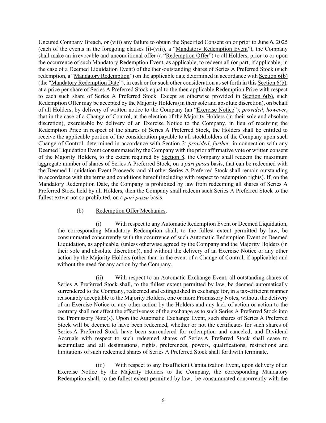 6 Uncured Company Breach, or (viii) any failure to obtain the Specified Consent on or prior to June 6, 2025 (each of the events in the foregoing clauses (i)-(viii), a “Mandatory Redemption Event”), the Company shall make an irrevocable and unconditional offer (a “Redemption Offer”) to all Holders, prior to or upon the occurrence of such Mandatory Redemption Event, as applicable, to redeem all (or part, if applicable, in the case of a Deemed Liquidation Event) of the then-outstanding shares of Series A Preferred Stock (such redemption, a “Mandatory Redemption”) on the applicable date determined in accordance with Section 6(b) (the “Mandatory Redemption Date”), in cash or for such other consideration as set forth in this Section 6(b), at a price per share of Series A Preferred Stock equal to the then applicable Redemption Price with respect to each such share of Series A Preferred Stock. Except as otherwise provided in Section 6(b), such Redemption Offer may be accepted by the Majority Holders (in their sole and absolute discretion), on behalf of all Holders, by delivery of written notice to the Company (an “Exercise Notice”); provided, however, that in the case of a Change of Control, at the election of the Majority Holders (in their sole and absolute discretion), exercisable by delivery of an Exercise Notice to the Company, in lieu of receiving the Redemption Price in respect of the shares of Series A Preferred Stock, the Holders shall be entitled to receive the applicable portion of the consideration payable to all stockholders of the Company upon such Change of Control, determined in accordance with Section 2; provided, further, in connection with any Deemed Liquidation Event consummated by the Company with the prior affirmative vote or written consent of the Majority Holders, to the extent required by Section 8, the Company shall redeem the maximum aggregate number of shares of Series A Preferred Stock, on a pari passu basis, that can be redeemed with the Deemed Liquidation Event Proceeds, and all other Series A Preferred Stock shall remain outstanding in accordance with the terms and conditions hereof (including with respect to redemption rights). If, on the Mandatory Redemption Date, the Company is prohibited by law from redeeming all shares of Series A Preferred Stock held by all Holders, then the Company shall redeem such Series A Preferred Stock to the fullest extent not so prohibited, on a pari passu basis. (b) Redemption Offer Mechanics. (i) With respect to any Automatic Redemption Event or Deemed Liquidation, the corresponding Mandatory Redemption shall, to the fullest extent permitted by law, be consummated concurrently with the occurrence of such Automatic Redemption Event or Deemed Liquidation, as applicable, (unless otherwise agreed by the Company and the Majority Holders (in their sole and absolute discretion)), and without the delivery of an Exercise Notice or any other action by the Majority Holders (other than in the event of a Change of Control, if applicable) and without the need for any action by the Company. (ii) With respect to an Automatic Exchange Event, all outstanding shares of Series A Preferred Stock shall, to the fullest extent permitted by law, be deemed automatically surrendered to the Company, redeemed and extinguished in exchange for, in a tax-efficient manner reasonably acceptable to the Majority Holders, one or more Promissory Notes, without the delivery of an Exercise Notice or any other action by the Holders and any lack of action or action to the contrary shall not affect the effectiveness of the exchange as to such Series A Preferred Stock into the Promissory Note(s). Upon the Automatic Exchange Event, such shares of Series A Preferred Stock will be deemed to have been redeemed, whether or not the certificates for such shares of Series A Preferred Stock have been surrendered for redemption and canceled, and Dividend Accruals with respect to such redeemed shares of Series A Preferred Stock shall cease to accumulate and all designations, rights, preferences, powers, qualifications, restrictions and limitations of such redeemed shares of Series A Preferred Stock shall forthwith terminate. (iii) With respect to any Insufficient Capitalization Event, upon delivery of an Exercise Notice by the Majority Holders to the Company, the corresponding Mandatory Redemption shall, to the fullest extent permitted by law, be consummated concurrently with the