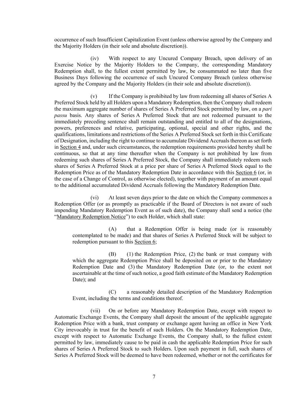 7 occurrence of such Insufficient Capitalization Event (unless otherwise agreed by the Company and the Majority Holders (in their sole and absolute discretion)). (iv) With respect to any Uncured Company Breach, upon delivery of an Exercise Notice by the Majority Holders to the Company, the corresponding Mandatory Redemption shall, to the fullest extent permitted by law, be consummated no later than five Business Days following the occurrence of such Uncured Company Breach (unless otherwise agreed by the Company and the Majority Holders (in their sole and absolute discretion)). (v) If the Company is prohibited by law from redeeming all shares of Series A Preferred Stock held by all Holders upon a Mandatory Redemption, then the Company shall redeem the maximum aggregate number of shares of Series A Preferred Stock permitted by law, on a pari passu basis. Any shares of Series A Preferred Stock that are not redeemed pursuant to the immediately preceding sentence shall remain outstanding and entitled to all of the designations, powers, preferences and relative, participating, optional, special and other rights, and the qualifications, limitations and restrictions of the Series A Preferred Stock set forth in this Certificate of Designation, including the right to continue to accumulate Dividend Accruals thereon as set forth in Section 4 and, under such circumstances, the redemption requirements provided hereby shall be continuous, so that at any time thereafter when the Company is not prohibited by law from redeeming such shares of Series A Preferred Stock, the Company shall immediately redeem such shares of Series A Preferred Stock at a price per share of Series A Preferred Stock equal to the Redemption Price as of the Mandatory Redemption Date in accordance with this Section 6 (or, in the case of a Change of Control, as otherwise elected), together with payment of an amount equal to the additional accumulated Dividend Accruals following the Mandatory Redemption Date. (vi) At least seven days prior to the date on which the Company commences a Redemption Offer (or as promptly as practicable if the Board of Directors is not aware of such impending Mandatory Redemption Event as of such date), the Company shall send a notice (the “Mandatory Redemption Notice”) to each Holder, which shall state: (A) that a Redemption Offer is being made (or is reasonably contemplated to be made) and that shares of Series A Preferred Stock will be subject to redemption pursuant to this Section 6; (B) (1) the Redemption Price, (2) the bank or trust company with which the aggregate Redemption Price shall be deposited on or prior to the Mandatory Redemption Date and (3) the Mandatory Redemption Date (or, to the extent not ascertainable at the time of such notice, a good faith estimate of the Mandatory Redemption Date); and (C) a reasonably detailed description of the Mandatory Redemption Event, including the terms and conditions thereof. (vii) On or before any Mandatory Redemption Date, except with respect to Automatic Exchange Events, the Company shall deposit the amount of the applicable aggregate Redemption Price with a bank, trust company or exchange agent having an office in New York City irrevocably in trust for the benefit of such Holders. On the Mandatory Redemption Date, except with respect to Automatic Exchange Events, the Company shall, to the fullest extent permitted by law, immediately cause to be paid in cash the applicable Redemption Price for such shares of Series A Preferred Stock to such Holders. Upon such payment in full, such shares of Series A Preferred Stock will be deemed to have been redeemed, whether or not the certificates for
