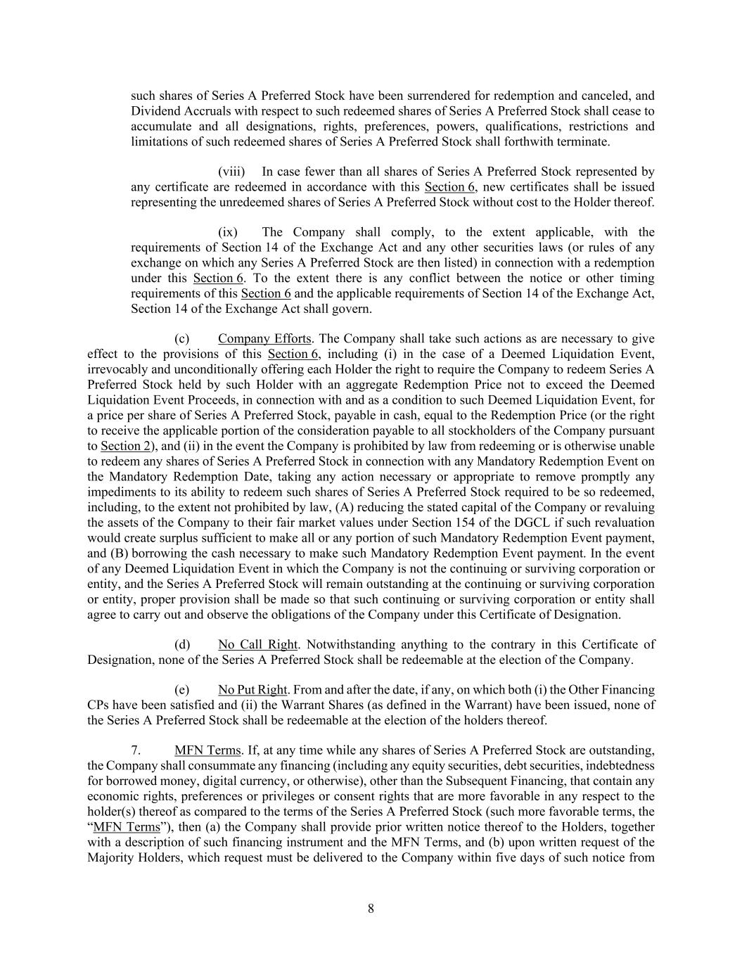 8 such shares of Series A Preferred Stock have been surrendered for redemption and canceled, and Dividend Accruals with respect to such redeemed shares of Series A Preferred Stock shall cease to accumulate and all designations, rights, preferences, powers, qualifications, restrictions and limitations of such redeemed shares of Series A Preferred Stock shall forthwith terminate. (viii) In case fewer than all shares of Series A Preferred Stock represented by any certificate are redeemed in accordance with this Section 6, new certificates shall be issued representing the unredeemed shares of Series A Preferred Stock without cost to the Holder thereof. (ix) The Company shall comply, to the extent applicable, with the requirements of Section 14 of the Exchange Act and any other securities laws (or rules of any exchange on which any Series A Preferred Stock are then listed) in connection with a redemption under this Section 6. To the extent there is any conflict between the notice or other timing requirements of this Section 6 and the applicable requirements of Section 14 of the Exchange Act, Section 14 of the Exchange Act shall govern. (c) Company Efforts. The Company shall take such actions as are necessary to give effect to the provisions of this Section 6, including (i) in the case of a Deemed Liquidation Event, irrevocably and unconditionally offering each Holder the right to require the Company to redeem Series A Preferred Stock held by such Holder with an aggregate Redemption Price not to exceed the Deemed Liquidation Event Proceeds, in connection with and as a condition to such Deemed Liquidation Event, for a price per share of Series A Preferred Stock, payable in cash, equal to the Redemption Price (or the right to receive the applicable portion of the consideration payable to all stockholders of the Company pursuant to Section 2), and (ii) in the event the Company is prohibited by law from redeeming or is otherwise unable to redeem any shares of Series A Preferred Stock in connection with any Mandatory Redemption Event on the Mandatory Redemption Date, taking any action necessary or appropriate to remove promptly any impediments to its ability to redeem such shares of Series A Preferred Stock required to be so redeemed, including, to the extent not prohibited by law, (A) reducing the stated capital of the Company or revaluing the assets of the Company to their fair market values under Section 154 of the DGCL if such revaluation would create surplus sufficient to make all or any portion of such Mandatory Redemption Event payment, and (B) borrowing the cash necessary to make such Mandatory Redemption Event payment. In the event of any Deemed Liquidation Event in which the Company is not the continuing or surviving corporation or entity, and the Series A Preferred Stock will remain outstanding at the continuing or surviving corporation or entity, proper provision shall be made so that such continuing or surviving corporation or entity shall agree to carry out and observe the obligations of the Company under this Certificate of Designation. (d) No Call Right. Notwithstanding anything to the contrary in this Certificate of Designation, none of the Series A Preferred Stock shall be redeemable at the election of the Company. (e) No Put Right. From and after the date, if any, on which both (i) the Other Financing CPs have been satisfied and (ii) the Warrant Shares (as defined in the Warrant) have been issued, none of the Series A Preferred Stock shall be redeemable at the election of the holders thereof. 7. MFN Terms. If, at any time while any shares of Series A Preferred Stock are outstanding, the Company shall consummate any financing (including any equity securities, debt securities, indebtedness for borrowed money, digital currency, or otherwise), other than the Subsequent Financing, that contain any economic rights, preferences or privileges or consent rights that are more favorable in any respect to the holder(s) thereof as compared to the terms of the Series A Preferred Stock (such more favorable terms, the “MFN Terms”), then (a) the Company shall provide prior written notice thereof to the Holders, together with a description of such financing instrument and the MFN Terms, and (b) upon written request of the Majority Holders, which request must be delivered to the Company within five days of such notice from