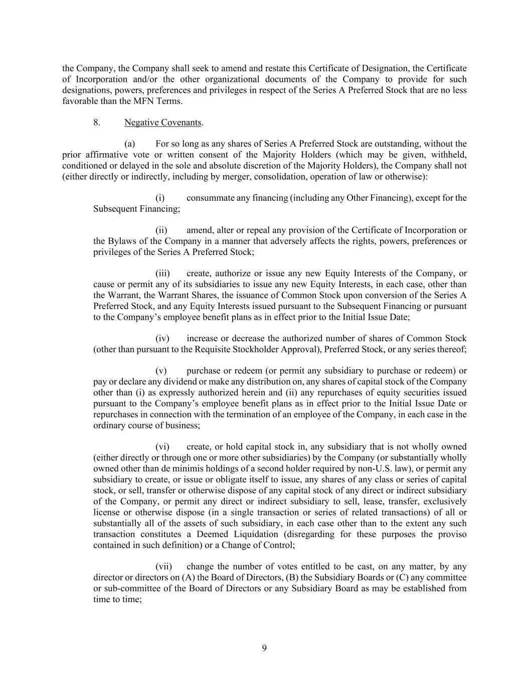 9 the Company, the Company shall seek to amend and restate this Certificate of Designation, the Certificate of Incorporation and/or the other organizational documents of the Company to provide for such designations, powers, preferences and privileges in respect of the Series A Preferred Stock that are no less favorable than the MFN Terms. 8. Negative Covenants. (a) For so long as any shares of Series A Preferred Stock are outstanding, without the prior affirmative vote or written consent of the Majority Holders (which may be given, withheld, conditioned or delayed in the sole and absolute discretion of the Majority Holders), the Company shall not (either directly or indirectly, including by merger, consolidation, operation of law or otherwise): (i) consummate any financing (including any Other Financing), except for the Subsequent Financing; (ii) amend, alter or repeal any provision of the Certificate of Incorporation or the Bylaws of the Company in a manner that adversely affects the rights, powers, preferences or privileges of the Series A Preferred Stock; (iii) create, authorize or issue any new Equity Interests of the Company, or cause or permit any of its subsidiaries to issue any new Equity Interests, in each case, other than the Warrant, the Warrant Shares, the issuance of Common Stock upon conversion of the Series A Preferred Stock, and any Equity Interests issued pursuant to the Subsequent Financing or pursuant to the Company’s employee benefit plans as in effect prior to the Initial Issue Date; (iv) increase or decrease the authorized number of shares of Common Stock (other than pursuant to the Requisite Stockholder Approval), Preferred Stock, or any series thereof; (v) purchase or redeem (or permit any subsidiary to purchase or redeem) or pay or declare any dividend or make any distribution on, any shares of capital stock of the Company other than (i) as expressly authorized herein and (ii) any repurchases of equity securities issued pursuant to the Company’s employee benefit plans as in effect prior to the Initial Issue Date or repurchases in connection with the termination of an employee of the Company, in each case in the ordinary course of business; (vi) create, or hold capital stock in, any subsidiary that is not wholly owned (either directly or through one or more other subsidiaries) by the Company (or substantially wholly owned other than de minimis holdings of a second holder required by non-U.S. law), or permit any subsidiary to create, or issue or obligate itself to issue, any shares of any class or series of capital stock, or sell, transfer or otherwise dispose of any capital stock of any direct or indirect subsidiary of the Company, or permit any direct or indirect subsidiary to sell, lease, transfer, exclusively license or otherwise dispose (in a single transaction or series of related transactions) of all or substantially all of the assets of such subsidiary, in each case other than to the extent any such transaction constitutes a Deemed Liquidation (disregarding for these purposes the proviso contained in such definition) or a Change of Control; (vii) change the number of votes entitled to be cast, on any matter, by any director or directors on (A) the Board of Directors, (B) the Subsidiary Boards or (C) any committee or sub-committee of the Board of Directors or any Subsidiary Board as may be established from time to time;