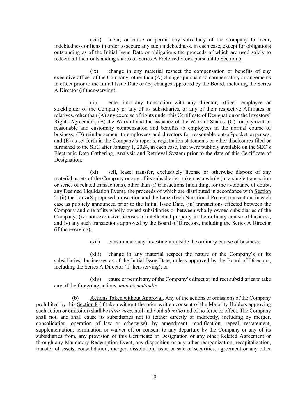 10 (viii) incur, or cause or permit any subsidiary of the Company to incur, indebtedness or liens in order to secure any such indebtedness, in each case, except for obligations outstanding as of the Initial Issue Date or obligations the proceeds of which are used solely to redeem all then-outstanding shares of Series A Preferred Stock pursuant to Section 6; (ix) change in any material respect the compensation or benefits of any executive officer of the Company, other than (A) changes pursuant to compensatory arrangements in effect prior to the Initial Issue Date or (B) changes approved by the Board, including the Series A Director (if then-serving); (x) enter into any transaction with any director, officer, employee or stockholder of the Company or any of its subsidiaries, or any of their respective Affiliates or relatives, other than (A) any exercise of rights under this Certificate of Designation or the Investors’ Rights Agreement, (B) the Warrant and the issuance of the Warrant Shares, (C) for payment of reasonable and customary compensation and benefits to employees in the normal course of business, (D) reimbursement to employees and directors for reasonable out-of-pocket expenses, and (E) as set forth in the Company’s reports, registration statements or other disclosures filed or furnished to the SEC after January 1, 2024, in each case, that were publicly available on the SEC’s Electronic Data Gathering, Analysis and Retrieval System prior to the date of this Certificate of Designation; (xi) sell, lease, transfer, exclusively license or otherwise dispose of any material assets of the Company or any of its subsidiaries, taken as a whole (in a single transaction or series of related transactions), other than (i) transactions (including, for the avoidance of doubt, any Deemed Liquidation Event), the proceeds of which are distributed in accordance with Section 2, (ii) the LanzaX proposed transaction and the LanzaTech Nutritional Protein transaction, in each case as publicly announced prior to the Initial Issue Date, (iii) transactions effected between the Company and one of its wholly-owned subsidiaries or between wholly-owned subsidiaries of the Company, (iv) non-exclusive licenses of intellectual property in the ordinary course of business, and (v) any such transactions approved by the Board of Directors, including the Series A Director (if then-serving); (xii) consummate any Investment outside the ordinary course of business; (xiii) change in any material respect the nature of the Company’s or its subsidiaries’ businesses as of the Initial Issue Date, unless approved by the Board of Directors, including the Series A Director (if then-serving); or (xiv) cause or permit any of the Company’s direct or indirect subsidiaries to take any of the foregoing actions, mutatis mutandis. (b) Actions Taken without Approval. Any of the actions or omissions of the Company prohibited by this Section 8 (if taken without the prior written consent of the Majority Holders approving such action or omission) shall be ultra vires, null and void ab initio and of no force or effect. The Company shall not, and shall cause its subsidiaries not to (either directly or indirectly, including by merger, consolidation, operation of law or otherwise), by amendment, modification, repeal, restatement, supplementation, termination or waiver of, or consent to any departure by the Company or any of its subsidiaries from, any provision of this Certificate of Designation or any other Related Agreement or through any Mandatory Redemption Event, any disposition or any other reorganization, recapitalization, transfer of assets, consolidation, merger, dissolution, issue or sale of securities, agreement or any other