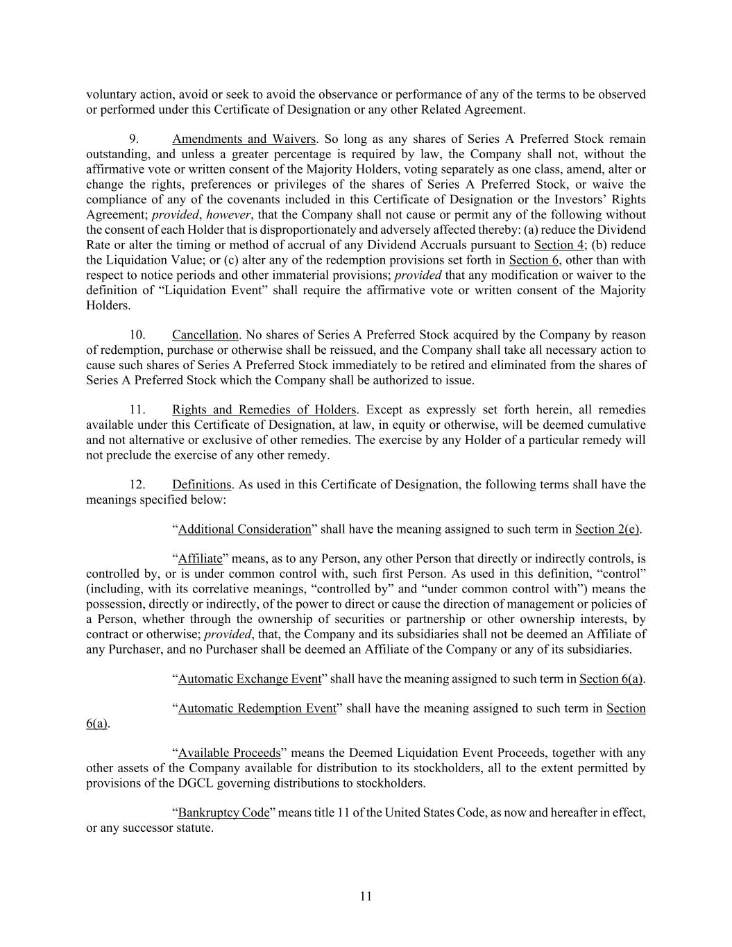 11 voluntary action, avoid or seek to avoid the observance or performance of any of the terms to be observed or performed under this Certificate of Designation or any other Related Agreement. 9. Amendments and Waivers. So long as any shares of Series A Preferred Stock remain outstanding, and unless a greater percentage is required by law, the Company shall not, without the affirmative vote or written consent of the Majority Holders, voting separately as one class, amend, alter or change the rights, preferences or privileges of the shares of Series A Preferred Stock, or waive the compliance of any of the covenants included in this Certificate of Designation or the Investors’ Rights Agreement; provided, however, that the Company shall not cause or permit any of the following without the consent of each Holder that is disproportionately and adversely affected thereby: (a) reduce the Dividend Rate or alter the timing or method of accrual of any Dividend Accruals pursuant to Section 4; (b) reduce the Liquidation Value; or (c) alter any of the redemption provisions set forth in Section 6, other than with respect to notice periods and other immaterial provisions; provided that any modification or waiver to the definition of “Liquidation Event” shall require the affirmative vote or written consent of the Majority Holders. 10. Cancellation. No shares of Series A Preferred Stock acquired by the Company by reason of redemption, purchase or otherwise shall be reissued, and the Company shall take all necessary action to cause such shares of Series A Preferred Stock immediately to be retired and eliminated from the shares of Series A Preferred Stock which the Company shall be authorized to issue. 11. Rights and Remedies of Holders. Except as expressly set forth herein, all remedies available under this Certificate of Designation, at law, in equity or otherwise, will be deemed cumulative and not alternative or exclusive of other remedies. The exercise by any Holder of a particular remedy will not preclude the exercise of any other remedy. 12. Definitions. As used in this Certificate of Designation, the following terms shall have the meanings specified below: “Additional Consideration” shall have the meaning assigned to such term in Section 2(e). “Affiliate” means, as to any Person, any other Person that directly or indirectly controls, is controlled by, or is under common control with, such first Person. As used in this definition, “control” (including, with its correlative meanings, “controlled by” and “under common control with”) means the possession, directly or indirectly, of the power to direct or cause the direction of management or policies of a Person, whether through the ownership of securities or partnership or other ownership interests, by contract or otherwise; provided, that, the Company and its subsidiaries shall not be deemed an Affiliate of any Purchaser, and no Purchaser shall be deemed an Affiliate of the Company or any of its subsidiaries. “Automatic Exchange Event” shall have the meaning assigned to such term in Section 6(a). “Automatic Redemption Event” shall have the meaning assigned to such term in Section 6(a). “Available Proceeds” means the Deemed Liquidation Event Proceeds, together with any other assets of the Company available for distribution to its stockholders, all to the extent permitted by provisions of the DGCL governing distributions to stockholders. “Bankruptcy Code” means title 11 of the United States Code, as now and hereafter in effect, or any successor statute.