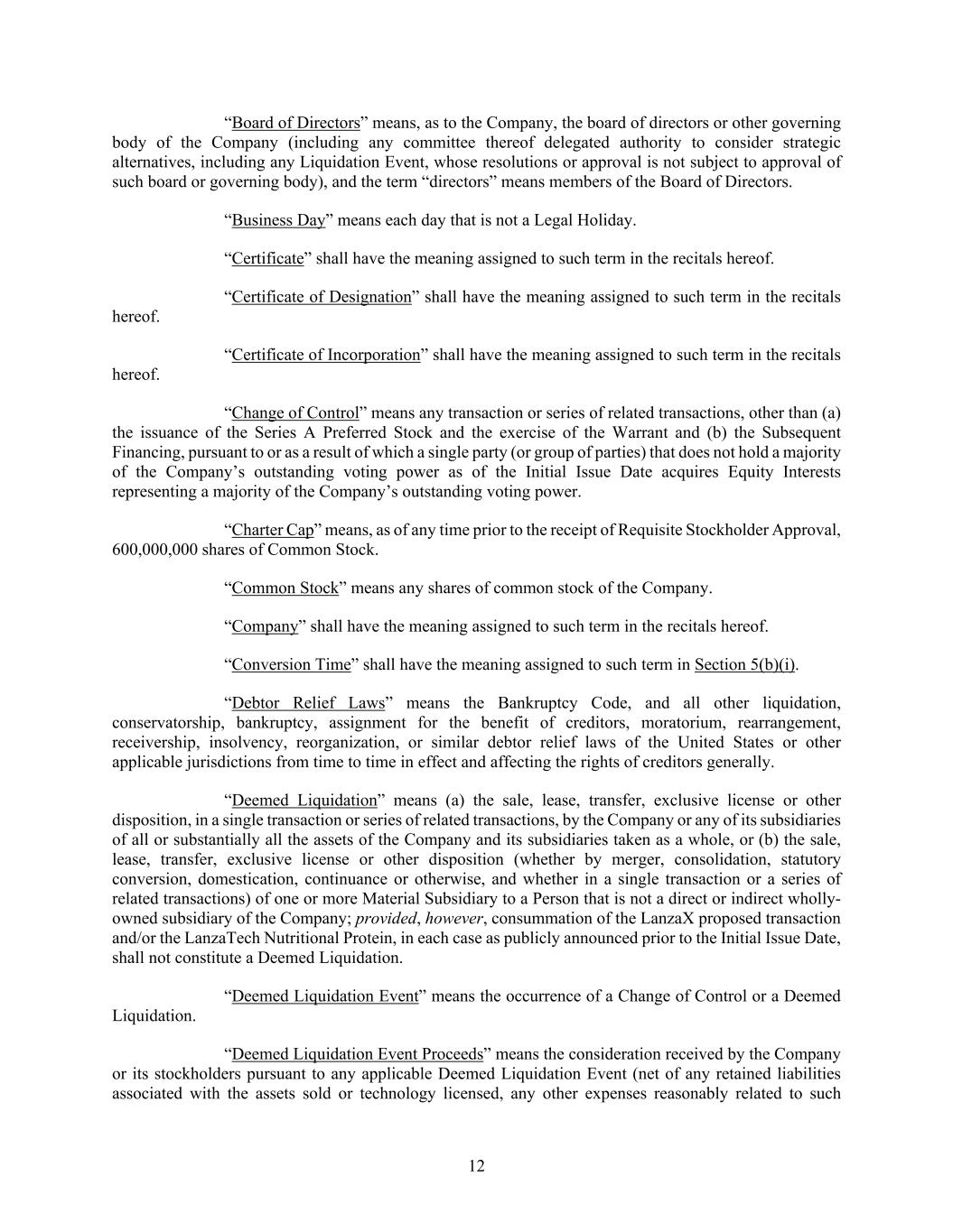 12 “Board of Directors” means, as to the Company, the board of directors or other governing body of the Company (including any committee thereof delegated authority to consider strategic alternatives, including any Liquidation Event, whose resolutions or approval is not subject to approval of such board or governing body), and the term “directors” means members of the Board of Directors. “Business Day” means each day that is not a Legal Holiday. “Certificate” shall have the meaning assigned to such term in the recitals hereof. “Certificate of Designation” shall have the meaning assigned to such term in the recitals hereof. “Certificate of Incorporation” shall have the meaning assigned to such term in the recitals hereof. “Change of Control” means any transaction or series of related transactions, other than (a) the issuance of the Series A Preferred Stock and the exercise of the Warrant and (b) the Subsequent Financing, pursuant to or as a result of which a single party (or group of parties) that does not hold a majority of the Company’s outstanding voting power as of the Initial Issue Date acquires Equity Interests representing a majority of the Company’s outstanding voting power. “Charter Cap” means, as of any time prior to the receipt of Requisite Stockholder Approval, 600,000,000 shares of Common Stock. “Common Stock” means any shares of common stock of the Company. “Company” shall have the meaning assigned to such term in the recitals hereof. “Conversion Time” shall have the meaning assigned to such term in Section 5(b)(i). “Debtor Relief Laws” means the Bankruptcy Code, and all other liquidation, conservatorship, bankruptcy, assignment for the benefit of creditors, moratorium, rearrangement, receivership, insolvency, reorganization, or similar debtor relief laws of the United States or other applicable jurisdictions from time to time in effect and affecting the rights of creditors generally. “Deemed Liquidation” means (a) the sale, lease, transfer, exclusive license or other disposition, in a single transaction or series of related transactions, by the Company or any of its subsidiaries of all or substantially all the assets of the Company and its subsidiaries taken as a whole, or (b) the sale, lease, transfer, exclusive license or other disposition (whether by merger, consolidation, statutory conversion, domestication, continuance or otherwise, and whether in a single transaction or a series of related transactions) of one or more Material Subsidiary to a Person that is not a direct or indirect wholly- owned subsidiary of the Company; provided, however, consummation of the LanzaX proposed transaction and/or the LanzaTech Nutritional Protein, in each case as publicly announced prior to the Initial Issue Date, shall not constitute a Deemed Liquidation. “Deemed Liquidation Event” means the occurrence of a Change of Control or a Deemed Liquidation. “Deemed Liquidation Event Proceeds” means the consideration received by the Company or its stockholders pursuant to any applicable Deemed Liquidation Event (net of any retained liabilities associated with the assets sold or technology licensed, any other expenses reasonably related to such