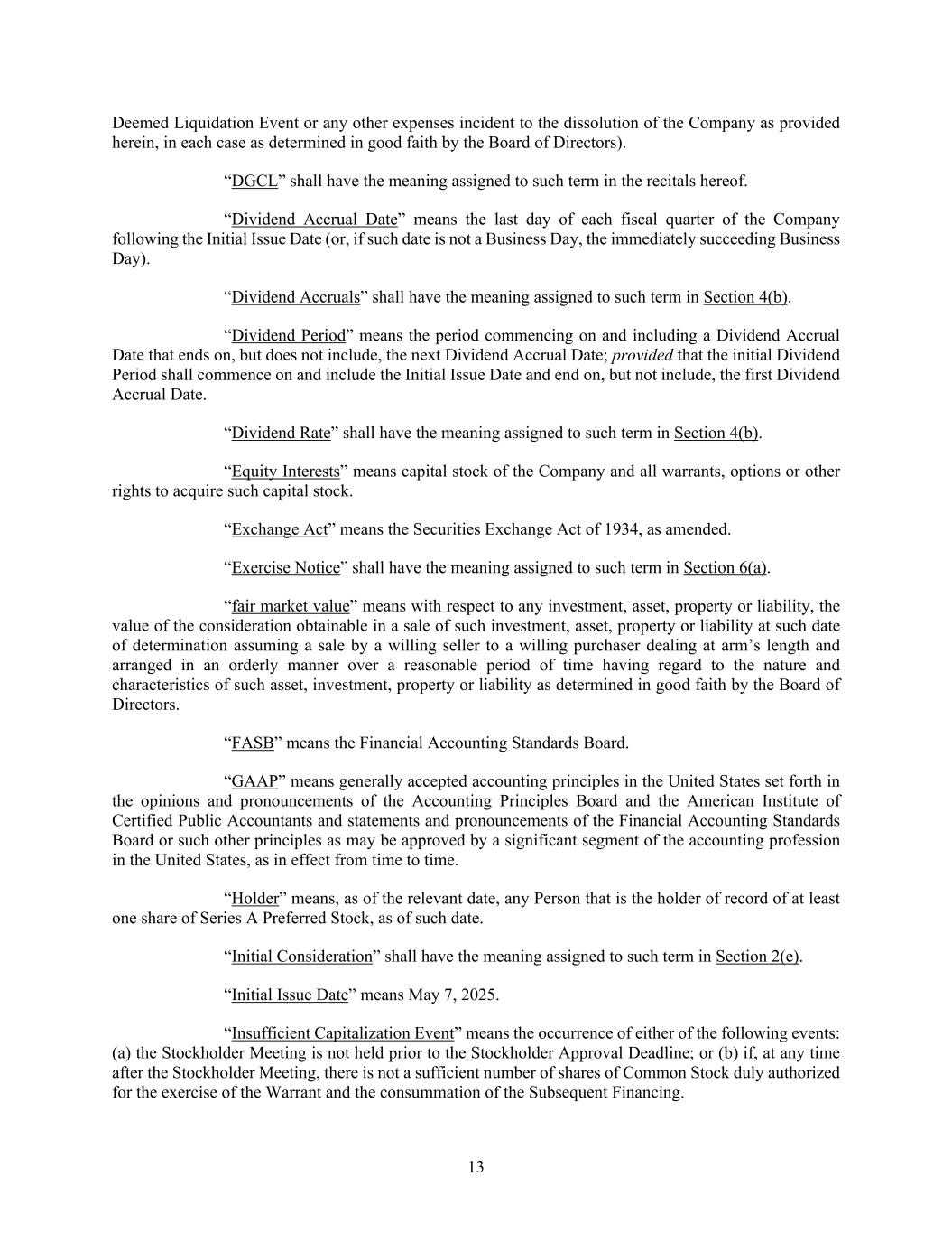 13 Deemed Liquidation Event or any other expenses incident to the dissolution of the Company as provided herein, in each case as determined in good faith by the Board of Directors). “DGCL” shall have the meaning assigned to such term in the recitals hereof. “Dividend Accrual Date” means the last day of each fiscal quarter of the Company following the Initial Issue Date (or, if such date is not a Business Day, the immediately succeeding Business Day). “Dividend Accruals” shall have the meaning assigned to such term in Section 4(b). “Dividend Period” means the period commencing on and including a Dividend Accrual Date that ends on, but does not include, the next Dividend Accrual Date; provided that the initial Dividend Period shall commence on and include the Initial Issue Date and end on, but not include, the first Dividend Accrual Date. “Dividend Rate” shall have the meaning assigned to such term in Section 4(b). “Equity Interests” means capital stock of the Company and all warrants, options or other rights to acquire such capital stock. “Exchange Act” means the Securities Exchange Act of 1934, as amended. “Exercise Notice” shall have the meaning assigned to such term in Section 6(a). “fair market value” means with respect to any investment, asset, property or liability, the value of the consideration obtainable in a sale of such investment, asset, property or liability at such date of determination assuming a sale by a willing seller to a willing purchaser dealing at arm’s length and arranged in an orderly manner over a reasonable period of time having regard to the nature and characteristics of such asset, investment, property or liability as determined in good faith by the Board of Directors. “FASB” means the Financial Accounting Standards Board. “GAAP” means generally accepted accounting principles in the United States set forth in the opinions and pronouncements of the Accounting Principles Board and the American Institute of Certified Public Accountants and statements and pronouncements of the Financial Accounting Standards Board or such other principles as may be approved by a significant segment of the accounting profession in the United States, as in effect from time to time. “Holder” means, as of the relevant date, any Person that is the holder of record of at least one share of Series A Preferred Stock, as of such date. “Initial Consideration” shall have the meaning assigned to such term in Section 2(e). “Initial Issue Date” means May 7, 2025. “Insufficient Capitalization Event” means the occurrence of either of the following events: (a) the Stockholder Meeting is not held prior to the Stockholder Approval Deadline; or (b) if, at any time after the Stockholder Meeting, there is not a sufficient number of shares of Common Stock duly authorized for the exercise of the Warrant and the consummation of the Subsequent Financing.