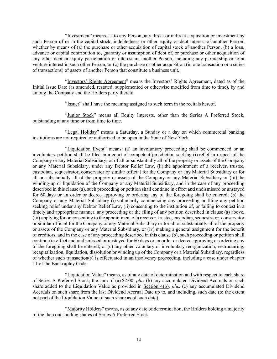 14 “Investment” means, as to any Person, any direct or indirect acquisition or investment by such Person of or in the capital stock, indebtedness or other equity or debt interest of another Person, whether by means of (a) the purchase or other acquisition of capital stock of another Person, (b) a loan, advance or capital contribution to, guaranty or assumption of debt of, or purchase or other acquisition of any other debt or equity participation or interest in, another Person, including any partnership or joint venture interest in such other Person, or (c) the purchase or other acquisition (in one transaction or a series of transactions) of assets of another Person that constitute a business unit. “Investors’ Rights Agreement” means the Investors’ Rights Agreement, dated as of the Initial Issue Date (as amended, restated, supplemented or otherwise modified from time to time), by and among the Company and the Holders party thereto. “Issuer” shall have the meaning assigned to such term in the recitals hereof. “Junior Stock” means all Equity Interests, other than the Series A Preferred Stock, outstanding at any time or from time to time. “Legal Holiday” means a Saturday, a Sunday or a day on which commercial banking institutions are not required or authorized to be open in the State of New York. “Liquidation Event” means: (a) an involuntary proceeding shall be commenced or an involuntary petition shall be filed in a court of competent jurisdiction seeking (i) relief in respect of the Company or any Material Subsidiary, or of all or substantially all of the property or assets of the Company or any Material Subsidiary, under any Debtor Relief Law, (ii) the appointment of a receiver, trustee, custodian, sequestrator, conservator or similar official for the Company or any Material Subsidiary or for all or substantially all of the property or assets of the Company or any Material Subsidiary or (iii) the winding-up or liquidation of the Company or any Material Subsidiary, and in the case of any proceeding described in this clause (a), such proceeding or petition shall continue in effect and undismissed or unstayed for 60 days or an order or decree approving or ordering any of the foregoing shall be entered; (b) the Company or any Material Subsidiary (i) voluntarily commencing any proceeding or filing any petition seeking relief under any Debtor Relief Law, (ii) consenting to the institution of, or failing to contest in a timely and appropriate manner, any proceeding or the filing of any petition described in clause (a) above, (iii) applying for or consenting to the appointment of a receiver, trustee, custodian, sequestrator, conservator or similar official for the Company or any Material Subsidiary or for all or substantially all of the property or assets of the Company or any Material Subsidiary, or (iv) making a general assignment for the benefit of creditors, and in the case of any proceeding described in this clause (b), such proceeding or petition shall continue in effect and undismissed or unstayed for 60 days or an order or decree approving or ordering any of the foregoing shall be entered; or (c) any other voluntary or involuntary reorganization, restructuring, recapitalization, liquidation, dissolution or winding up of the Company or a Material Subsidiary, regardless of whether such transaction(s) is effectuated in an insolvency proceeding, including a case under chapter 11 of the Bankruptcy Code. “Liquidation Value” means, as of any date of determination and with respect to each share of Series A Preferred Stock, the sum of (a) $2.00, plus (b) any accumulated Dividend Accruals on such share added to the Liquidation Value as provided in Section 4(b), plus (c) any accumulated Dividend Accruals on such share from the last Dividend Accrual Date up to, and including, such date (to the extent not part of the Liquidation Value of such share as of such date). “Majority Holders” means, as of any date of determination, the Holders holding a majority of the then outstanding shares of Series A Preferred Stock.