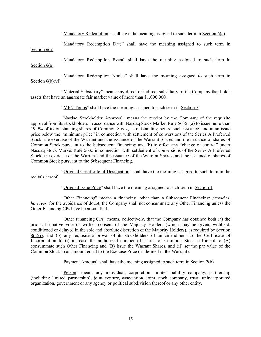 15 “Mandatory Redemption” shall have the meaning assigned to such term in Section 6(a). “Mandatory Redemption Date” shall have the meaning assigned to such term in Section 6(a). “Mandatory Redemption Event” shall have the meaning assigned to such term in Section 6(a). “Mandatory Redemption Notice” shall have the meaning assigned to such term in Section 6(b)(vi). “Material Subsidiary” means any direct or indirect subsidiary of the Company that holds assets that have an aggregate fair market value of more than $1,000,000. “MFN Terms” shall have the meaning assigned to such term in Section 7. “Nasdaq Stockholder Approval” means the receipt by the Company of the requisite approval from its stockholders in accordance with Nasdaq Stock Market Rule 5635: (a) to issue more than 19.9% of its outstanding shares of Common Stock, as outstanding before such issuance, and at an issue price below the “minimum price” in connection with settlement of conversions of the Series A Preferred Stock, the exercise of the Warrant and the issuance of the Warrant Shares and the issuance of shares of Common Stock pursuant to the Subsequent Financing; and (b) to effect any “change of control” under Nasdaq Stock Market Rule 5635 in connection with settlement of conversions of the Series A Preferred Stock, the exercise of the Warrant and the issuance of the Warrant Shares, and the issuance of shares of Common Stock pursuant to the Subsequent Financing. “Original Certificate of Designation” shall have the meaning assigned to such term in the recitals hereof. “Original Issue Price” shall have the meaning assigned to such term in Section 1. “Other Financing” means a financing, other than a Subsequent Financing; provided, however, for the avoidance of doubt, the Company shall not consummate any Other Financing unless the Other Financing CPs have been satisfied. “Other Financing CPs” means, collectively, that the Company has obtained both (a) the prior affirmative vote or written consent of the Majority Holders (which may be given, withheld, conditioned or delayed in the sole and absolute discretion of the Majority Holders), as required by Section 8(a)(i), and (b) any requisite approval of its stockholders of an amendment to the Certificate of Incorporation to (i) increase the authorized number of shares of Common Stock sufficient to (A) consummate such Other Financing and (B) issue the Warrant Shares, and (ii) set the par value of the Common Stock to an amount equal to the Exercise Price (as defined in the Warrant). “Payment Amount” shall have the meaning assigned to such term in Section 2(b). “Person” means any individual, corporation, limited liability company, partnership (including limited partnership), joint venture, association, joint stock company, trust, unincorporated organization, government or any agency or political subdivision thereof or any other entity.