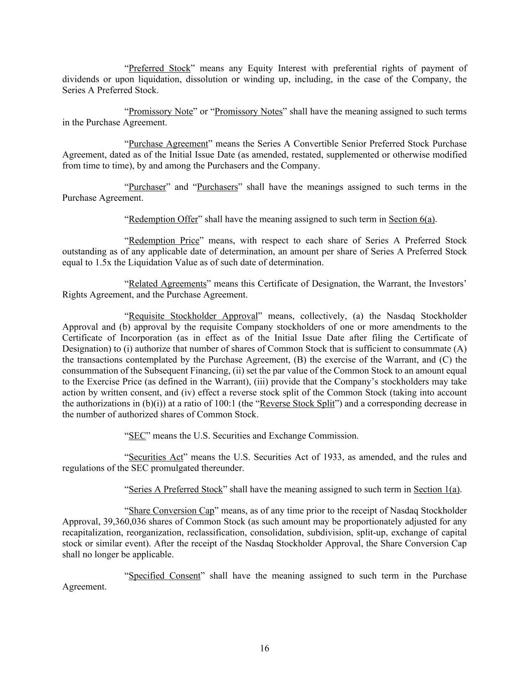 16 “Preferred Stock” means any Equity Interest with preferential rights of payment of dividends or upon liquidation, dissolution or winding up, including, in the case of the Company, the Series A Preferred Stock. “Promissory Note” or “Promissory Notes” shall have the meaning assigned to such terms in the Purchase Agreement. “Purchase Agreement” means the Series A Convertible Senior Preferred Stock Purchase Agreement, dated as of the Initial Issue Date (as amended, restated, supplemented or otherwise modified from time to time), by and among the Purchasers and the Company. “Purchaser” and “Purchasers” shall have the meanings assigned to such terms in the Purchase Agreement. “Redemption Offer” shall have the meaning assigned to such term in Section 6(a). “Redemption Price” means, with respect to each share of Series A Preferred Stock outstanding as of any applicable date of determination, an amount per share of Series A Preferred Stock equal to 1.5x the Liquidation Value as of such date of determination. “Related Agreements” means this Certificate of Designation, the Warrant, the Investors’ Rights Agreement, and the Purchase Agreement. “Requisite Stockholder Approval” means, collectively, (a) the Nasdaq Stockholder Approval and (b) approval by the requisite Company stockholders of one or more amendments to the Certificate of Incorporation (as in effect as of the Initial Issue Date after filing the Certificate of Designation) to (i) authorize that number of shares of Common Stock that is sufficient to consummate (A) the transactions contemplated by the Purchase Agreement, (B) the exercise of the Warrant, and (C) the consummation of the Subsequent Financing, (ii) set the par value of the Common Stock to an amount equal to the Exercise Price (as defined in the Warrant), (iii) provide that the Company’s stockholders may take action by written consent, and (iv) effect a reverse stock split of the Common Stock (taking into account the authorizations in (b)(i)) at a ratio of 100:1 (the “Reverse Stock Split”) and a corresponding decrease in the number of authorized shares of Common Stock. “SEC” means the U.S. Securities and Exchange Commission. “Securities Act” means the U.S. Securities Act of 1933, as amended, and the rules and regulations of the SEC promulgated thereunder. “Series A Preferred Stock” shall have the meaning assigned to such term in Section 1(a). “Share Conversion Cap” means, as of any time prior to the receipt of Nasdaq Stockholder Approval, 39,360,036 shares of Common Stock (as such amount may be proportionately adjusted for any recapitalization, reorganization, reclassification, consolidation, subdivision, split-up, exchange of capital stock or similar event). After the receipt of the Nasdaq Stockholder Approval, the Share Conversion Cap shall no longer be applicable. “Specified Consent” shall have the meaning assigned to such term in the Purchase Agreement.