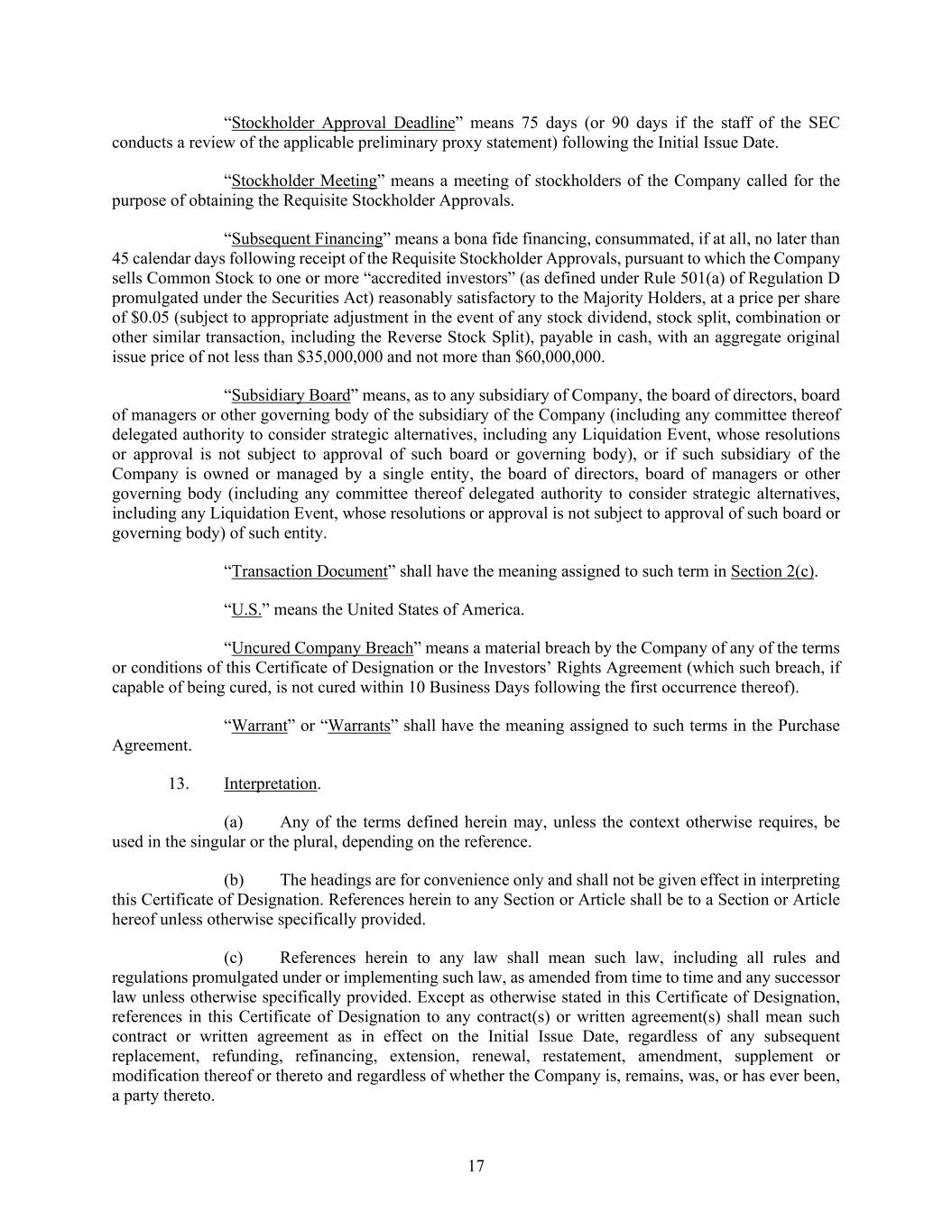 17 “Stockholder Approval Deadline” means 75 days (or 90 days if the staff of the SEC conducts a review of the applicable preliminary proxy statement) following the Initial Issue Date. “Stockholder Meeting” means a meeting of stockholders of the Company called for the purpose of obtaining the Requisite Stockholder Approvals. “Subsequent Financing” means a bona fide financing, consummated, if at all, no later than 45 calendar days following receipt of the Requisite Stockholder Approvals, pursuant to which the Company sells Common Stock to one or more “accredited investors” (as defined under Rule 501(a) of Regulation D promulgated under the Securities Act) reasonably satisfactory to the Majority Holders, at a price per share of $0.05 (subject to appropriate adjustment in the event of any stock dividend, stock split, combination or other similar transaction, including the Reverse Stock Split), payable in cash, with an aggregate original issue price of not less than $35,000,000 and not more than $60,000,000. “Subsidiary Board” means, as to any subsidiary of Company, the board of directors, board of managers or other governing body of the subsidiary of the Company (including any committee thereof delegated authority to consider strategic alternatives, including any Liquidation Event, whose resolutions or approval is not subject to approval of such board or governing body), or if such subsidiary of the Company is owned or managed by a single entity, the board of directors, board of managers or other governing body (including any committee thereof delegated authority to consider strategic alternatives, including any Liquidation Event, whose resolutions or approval is not subject to approval of such board or governing body) of such entity. “Transaction Document” shall have the meaning assigned to such term in Section 2(c). “U.S.” means the United States of America. “Uncured Company Breach” means a material breach by the Company of any of the terms or conditions of this Certificate of Designation or the Investors’ Rights Agreement (which such breach, if capable of being cured, is not cured within 10 Business Days following the first occurrence thereof). “Warrant” or “Warrants” shall have the meaning assigned to such terms in the Purchase Agreement. 13. Interpretation. (a) Any of the terms defined herein may, unless the context otherwise requires, be used in the singular or the plural, depending on the reference. (b) The headings are for convenience only and shall not be given effect in interpreting this Certificate of Designation. References herein to any Section or Article shall be to a Section or Article hereof unless otherwise specifically provided. (c) References herein to any law shall mean such law, including all rules and regulations promulgated under or implementing such law, as amended from time to time and any successor law unless otherwise specifically provided. Except as otherwise stated in this Certificate of Designation, references in this Certificate of Designation to any contract(s) or written agreement(s) shall mean such contract or written agreement as in effect on the Initial Issue Date, regardless of any subsequent replacement, refunding, refinancing, extension, renewal, restatement, amendment, supplement or modification thereof or thereto and regardless of whether the Company is, remains, was, or has ever been, a party thereto.