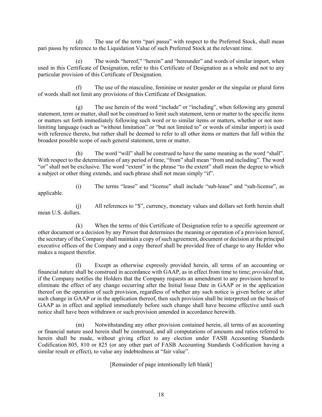 18 (d) The use of the term “pari passu” with respect to the Preferred Stock, shall mean pari passu by reference to the Liquidation Value of such Preferred Stock at the relevant time. (e) The words “hereof,” “herein” and “hereunder” and words of similar import, when used in this Certificate of Designation, refer to this Certificate of Designation as a whole and not to any particular provision of this Certificate of Designation. (f) The use of the masculine, feminine or neuter gender or the singular or plural form of words shall not limit any provisions of this Certificate of Designation. (g) The use herein of the word “include” or “including”, when following any general statement, term or matter, shall not be construed to limit such statement, term or matter to the specific items or matters set forth immediately following such word or to similar items or matters, whether or not non- limiting language (such as “without limitation” or “but not limited to” or words of similar import) is used with reference thereto, but rather shall be deemed to refer to all other items or matters that fall within the broadest possible scope of such general statement, term or matter. (h) The word “will” shall be construed to have the same meaning as the word “shall”. With respect to the determination of any period of time, “from” shall mean “from and including”. The word “or” shall not be exclusive. The word “extent” in the phrase “to the extent” shall mean the degree to which a subject or other thing extends, and such phrase shall not mean simply “if”. (i) The terms “lease” and “license” shall include “sub-lease” and “sub-license”, as applicable. (j) All references to “$”, currency, monetary values and dollars set forth herein shall mean U.S. dollars. (k) When the terms of this Certificate of Designation refer to a specific agreement or other document or a decision by any Person that determines the meaning or operation of a provision hereof, the secretary of the Company shall maintain a copy of such agreement, document or decision at the principal executive offices of the Company and a copy thereof shall be provided free of charge to any Holder who makes a request therefor. (l) Except as otherwise expressly provided herein, all terms of an accounting or financial nature shall be construed in accordance with GAAP, as in effect from time to time; provided that, if the Company notifies the Holders that the Company requests an amendment to any provision hereof to eliminate the effect of any change occurring after the Initial Issue Date in GAAP or in the application thereof on the operation of such provision, regardless of whether any such notice is given before or after such change in GAAP or in the application thereof, then such provision shall be interpreted on the basis of GAAP as in effect and applied immediately before such change shall have become effective until such notice shall have been withdrawn or such provision amended in accordance herewith. (m) Notwithstanding any other provision contained herein, all terms of an accounting or financial nature used herein shall be construed, and all computations of amounts and ratios referred to herein shall be made, without giving effect to any election under FASB Accounting Standards Codification 805, 810 or 825 (or any other part of FASB Accounting Standards Codification having a similar result or effect), to value any indebtedness at “fair value”. [Remainder of page intentionally left blank]