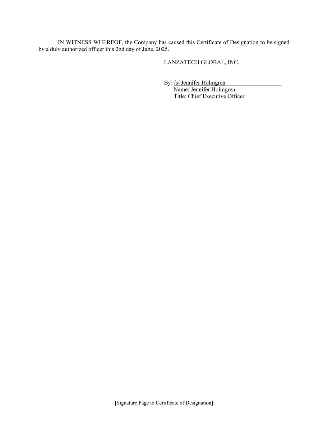 [Signature Page to Certificate of Designation] IN WITNESS WHEREOF, the Company has caused this Certificate of Designation to be signed by a duly authorized officer this 2nd day of June, 2025. LANZATECH GLOBAL, INC. By: /s/ Jennifer Holmgren___________________ Name: Jennifer Holmgren Title: Chief Executive Officer