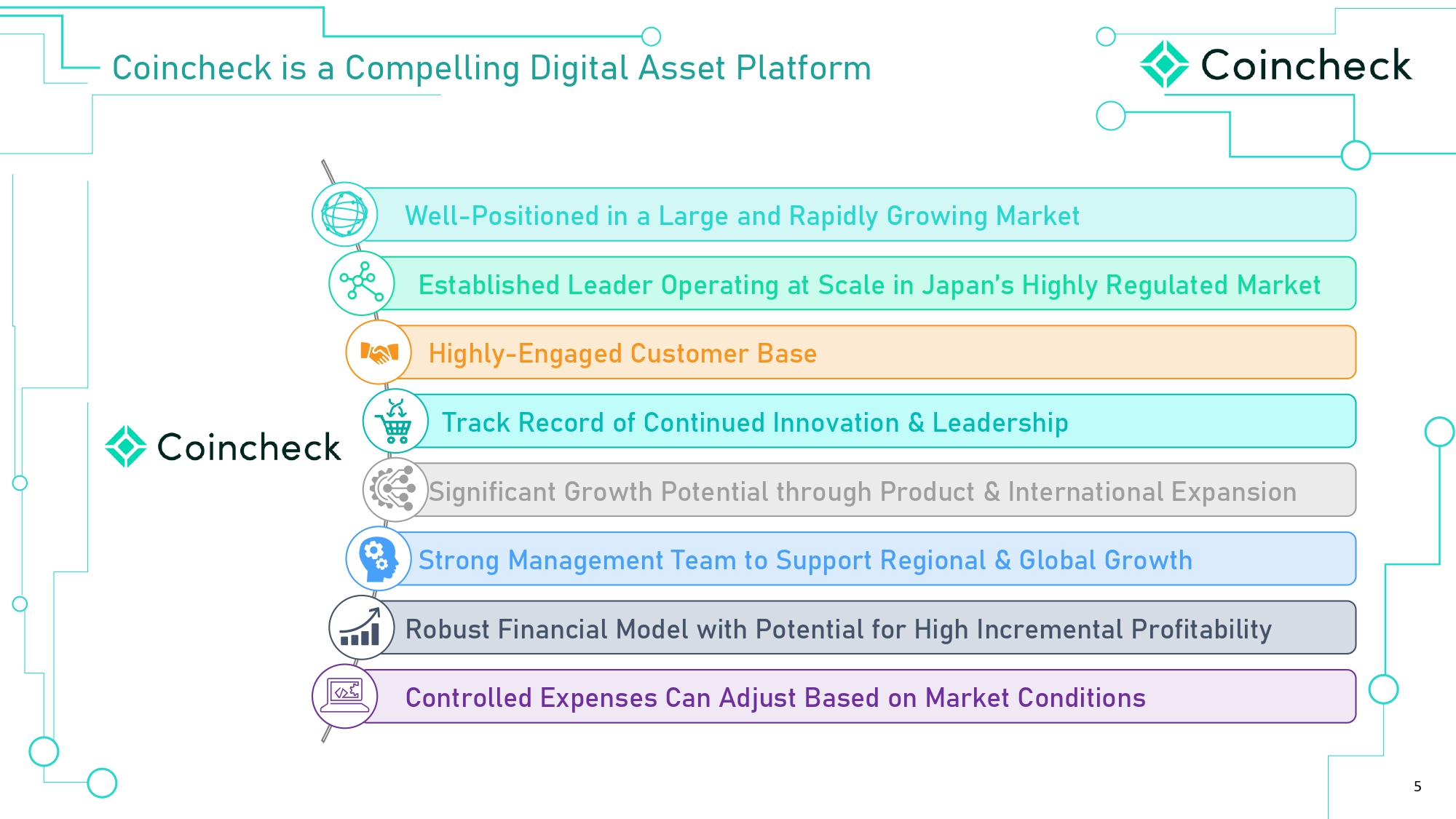 4 I› Ȩ ã­› =‚Ø©›Üã ØöÕãÈ V¼‚ã¨ÈØÁÜ ¯Â 9‚Õ‚Â d­› ȯ­›¹ IÕÕÈØãç¯ãö Providing Japanese Customers & Institutions with Direct Access to the Global Crypto Economy Sou rc e : C ompa ny fi l in g s Note: Figures in JPY converted to USD based on exchange rate of 0.006607 as of 3/31/2024; Coincheck FY ended 3/31, Q'1 25 based on the 3 - month period ended June 30, 2024; 1 As of Jun - 2024; Does not include NFTs; 2 LTM figures represent 12 months ended Jun - 2024; Does not include NFTs; 3 Coincheck is also known as the Crypto Asset segment in Monex filings; 4 Represents J - GAAP accounting of customer assets which is calculated as the sum of crypto currencies deposited by customers and fiat currency deposited by customers; 5 EBITDA is a non - IFRS metric. Please refer to slide 17 for a reconciliation to its most comparable IFRS metric Broad Product Set x ›•¯‚㛕 ØöÕãÈ›õ­‚©› ¨ÈØ Ø›ã‚¯¼ çÜãÈÁ›ØÜ x dØ‚•¯Â© Õ¼‚ã¨ÈØÁ¨ÈØ ÕØÈ¨›ÜܯÈ‚¼ ãØ‚•›ØÜ x C(d Á‚ع›ãÕ¼‚› x YÈŽçÜã ÜÕØ›‚• ʣ ނܛ• Žçܯ›ÜÜ ÁÈ•›¼ ô¯ã­ ÕÈã›Â㯂¼ ¨ÈØ ­¯©­ ¯ÂØ›Á›Âゼ ÕØÈ¨¯ã‚ޝ¼¯ãö x d­ÈØÈç©­ ö›ã Ü›‚Á¼›ÜÜ :y ‚• B= ÕØÈ›•çØ›Ü ‚• ÈŽȂؕ¯Â© Strong track record of growth and “first crypto account” status 2.0M+ accounts 1 30 supported cryp t o ass e ts 1 $4.9B custome r ass e t s 1, 4 $1.8B L T M Q’ 1 2 5 M a rketpla c e trading value 2 27% F Y 2 4 YoY rev en u e growth 3 $30mm LT M Q’ 1 2 5 EB I T D A 2 , 5