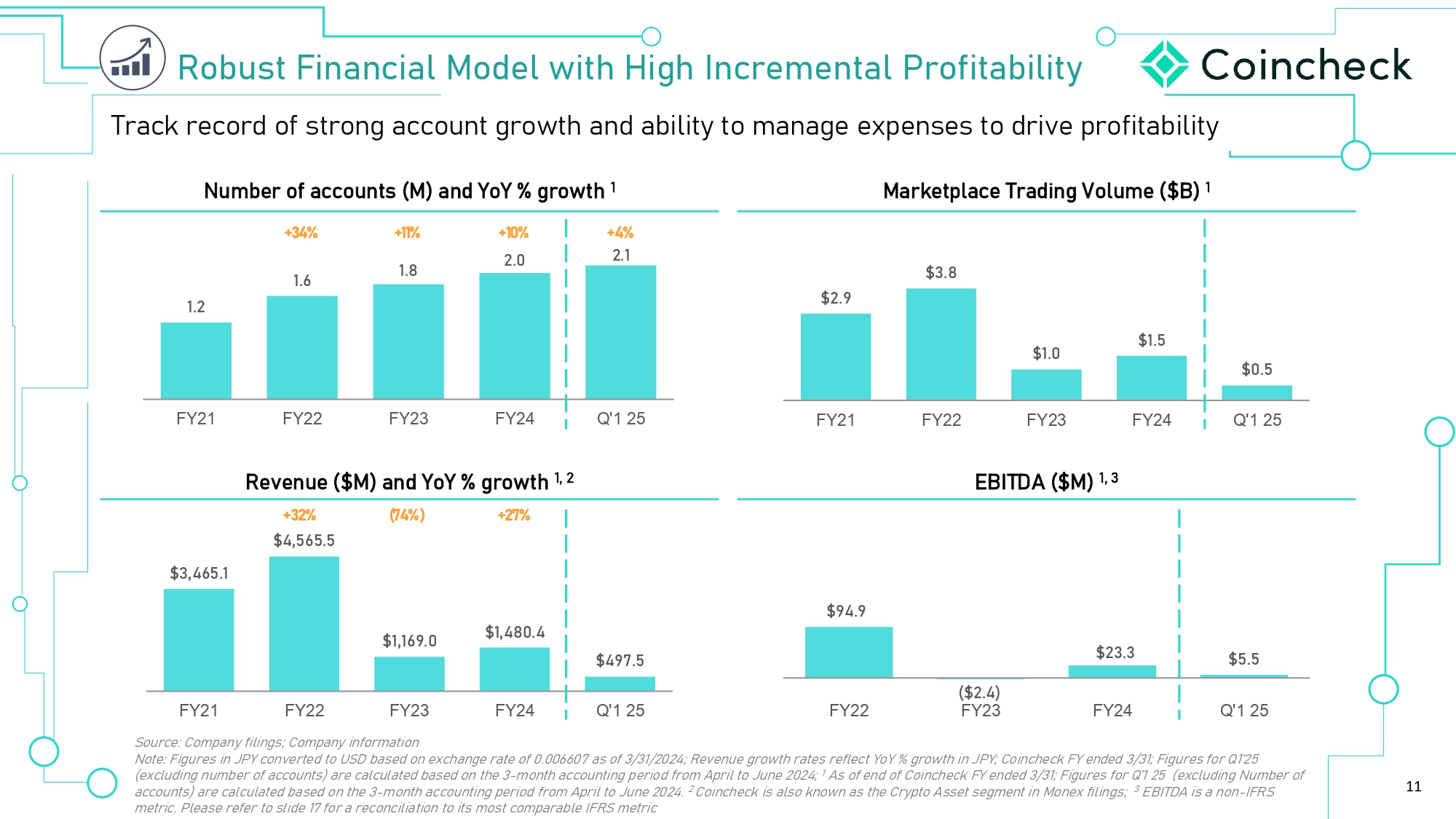 10 IçØ Y›ó›Âç› BÈ•›¼ Sou rc e : C ompa ny fi l in g s Note: Figures in JPY converted to USD based on exchange rate of 0.006607 as of 3/31/2024; All figures for Coincheck FY24, being the 12 months ended 3/31/2024 T r ansa c t i on Revenue 92.5% of Total Revenue Transaction Volume (Marketplace) Sp r ead 3.42% Av e r ag e Spre a d $1.5B Total FY24 Volume X Total Revenue Non - Transaction Revenue NFTs Initial Exchange Offering Wholesale services Cryptocurrency subscriptions Deposit and Withdrawal Fees (Crypto + Fiat) 7.5% of Total Revenue