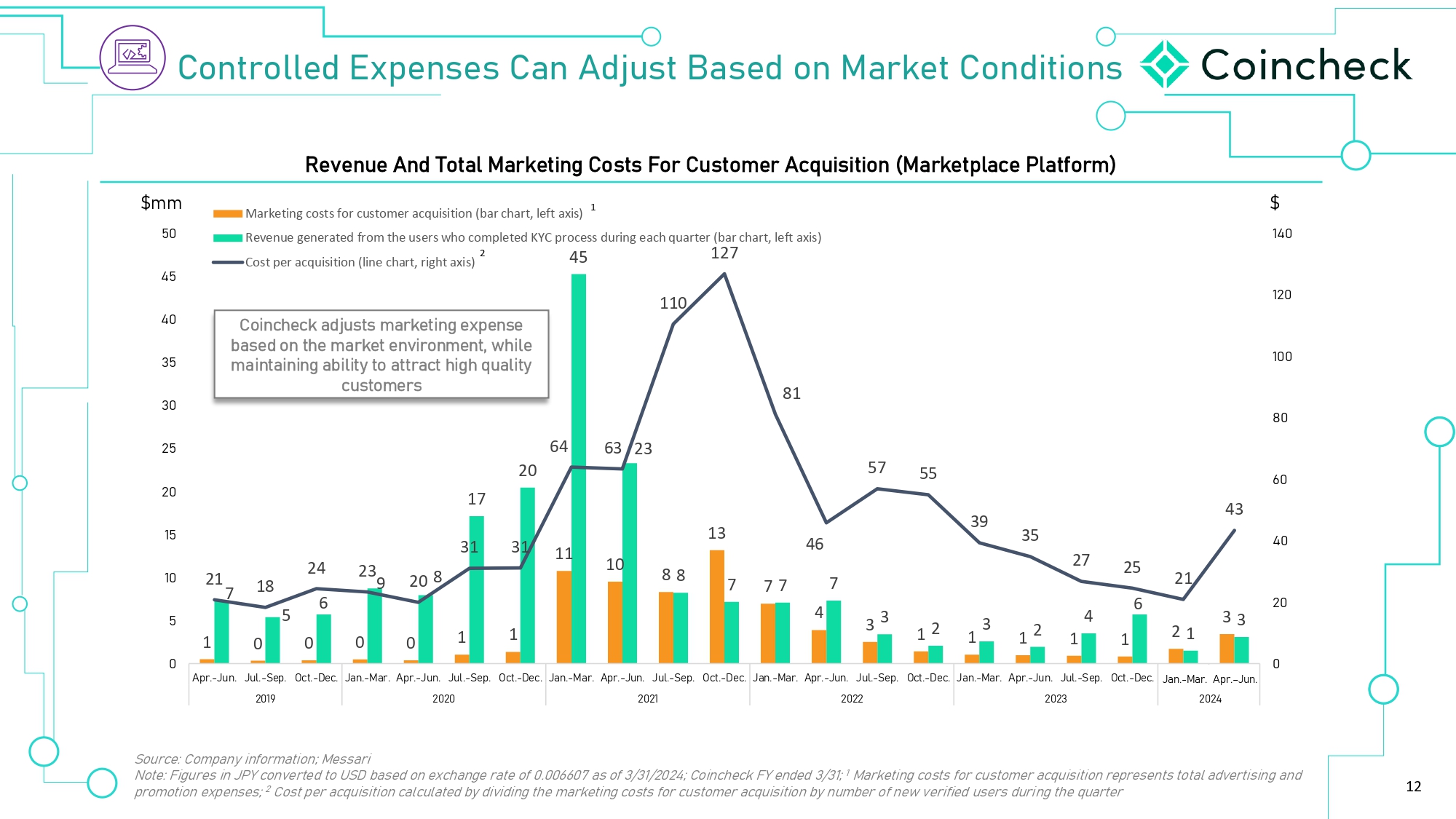 12 1 0 0 0 0 1 11 10 13 4 1 1 1 1 1 1 7 5 6 9 8 17 20 8 8 45 7 7 7 7 3 3 2 3 2 4 6 2 1 3 3 21 18 24 23 20 31 31 64 63 23 110 127 81 46 57 55 39 35 27 25 21 43 ɶ ɸɶ ɺɶ ɼɶ ɾɶ ɷ ɶ ɶ ɷɸɶ ˚ ɷɺɶ ɶ ɻ ɷɶ ɷɻ ɸɶ ɸɻ ɹɶ ɹɻ ɺɶ ɺɻ ˚ Á Á ɻɶ ÕØʒ ʣ 9çÂʒ 9ç¼ʒ ʣ ]›Õʒ Iãʒ ʣ ›ʒ 9‚Âʒ ʣ B‚Øʒ ÕØʒ ʣ 9çÂʒ 9ç¼ʒ ʣ ]›Õʒ Iãʒ ʣ ›ʒ 9‚Âʒ ʣ B‚Øʒ ÕØʒ ʣ 9çÂʒ 9ç¼ʒ ʣ ]›Õʒ Iãʒ ʣ ›ʒ 9‚Âʒ ʣ B‚Øʒ ÕØʒ ʣ 9çÂʒ 9ç¼ʒ ʣ ]›Õʒ Iãʒ ʣ ›ʒ 9‚Âʒ ʣ B‚Øʒ ÕØʒ ʣ 9çÂʒ 9ç¼ʒ ʣ ]›Õʒ Iãʒ ʣ ›ʒ 9‚Âʒ ʣ B‚Øʒ ÕØʒ ʡ 9çÂʒ ɸɶɷɿ ɸɶɸɶ ɸɶɸɷ ɸɶɸɸ ɸɶɸɹ ɸɶɸɺ Marketing costs for customer acquisition (bar chart, left axis) 1 Revenue generated from the users who completed KYC process during each quarter (bar chart, left axis) 2 Cost per acquisition (line chart, right axis) ÈÂãØÈ¼¼›• õÕ›ÂÜ›Ü ‚ •¸çÜã ‚Ü›• È B‚ع›ã È•¯ã¯ÈÂÜ Source: Company information; Messari Note: Figures in JPY converted to USD based on exchange rate of 0.006607 as of 3/31/2024; Coincheck FY ended 3/31; 1 Marketing costs for customer acquisition represents total advertising and promotion expenses; 2 Cost per acquisition calculated by dividing the marketing costs for customer acquisition by number of new verified users during the quarter Y›ó›Âç› Â• dÈゼ B‚ع›ã¯Â© ÈÜãÜ (ÈØ çÜãÈÁ›Ø ×ç¯Ü¯ã¯È ʞB‚ع›ãÕ¼‚› V¼‚ã¨ÈØÁʟ ȯ­›¹ ‚•¸çÜãÜ Á‚ع›ã¯Â©›õÕ›ÂÜ› ނܛ• È 㭛 Á‚ع›ã ›Âó¯ØÈÂÁ›Âãʍ ô­¯¼› Á‚¯Âク¯© ‚ޝ¼¯ãö ãÈ ‚ããØ‚ã ­¯©­ ×炼¯ãö çÜãÈÁ›ØÜ