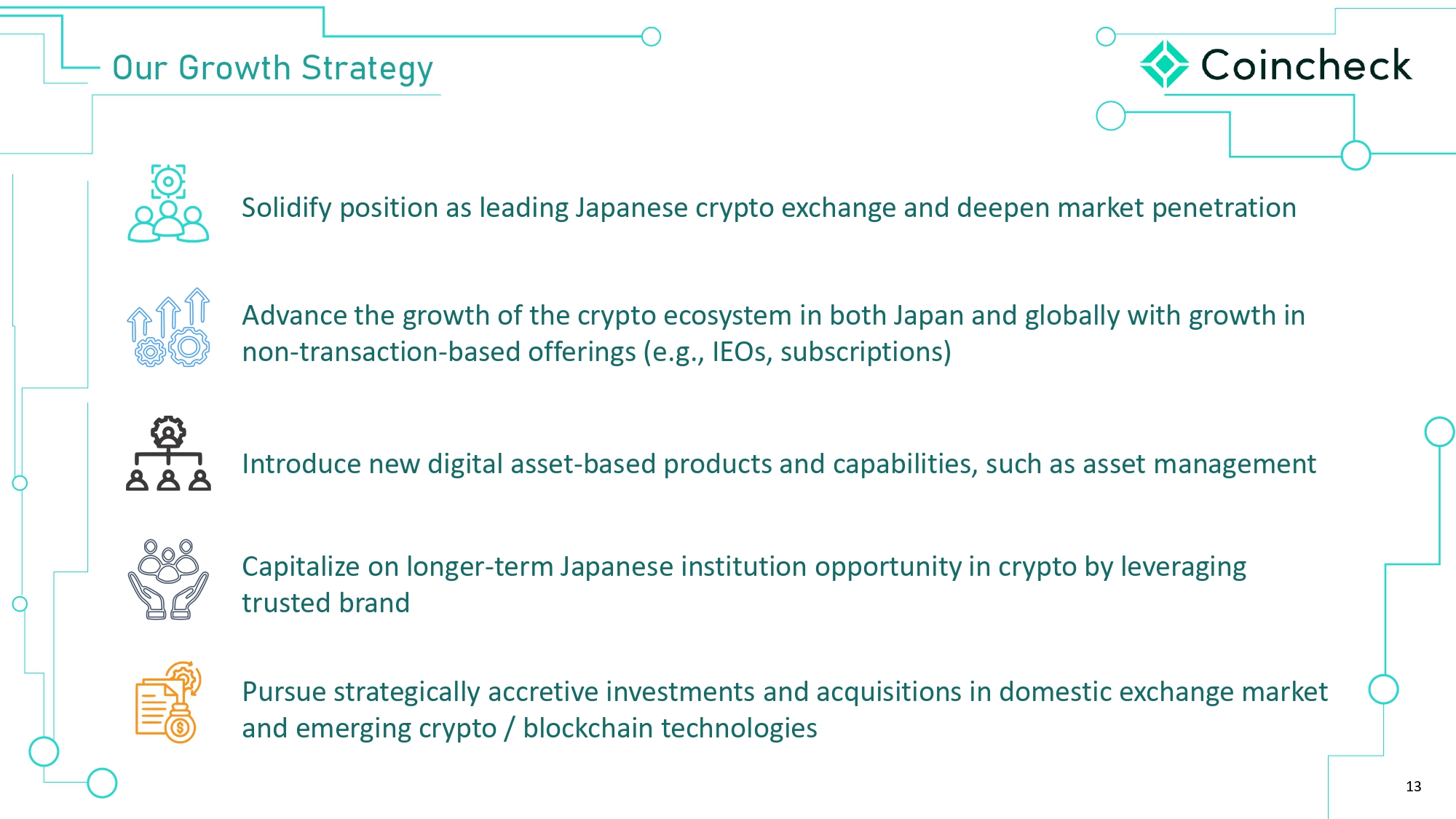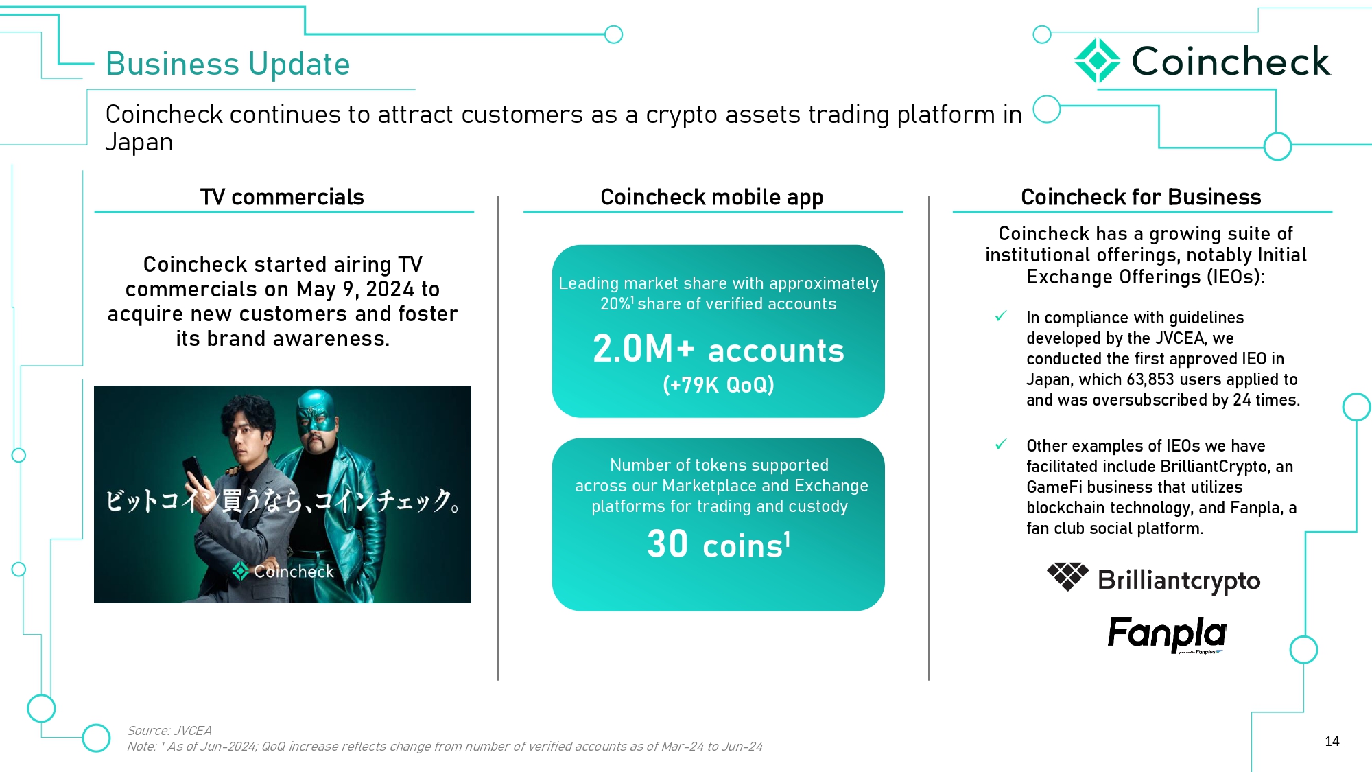 13 IçØ *ØÈôã­ ]ãØ‚ã›©ö Solidify position as leading Japanese crypto exchange and deepen market penetration Advance the growth of the crypto ecosystem in both Japan and globally with growth in non - transaction - based offerings (e.g., IEOs, subscriptions) Introduce new digital asset - based products and capabilities, such as asset management Capitalize on longer - term Japanese institution opportunity in crypto by leveraging trusted brand Pursue strategically accretive investments and acquisitions in domestic exchange market and emerging crypto / blockchain technologies