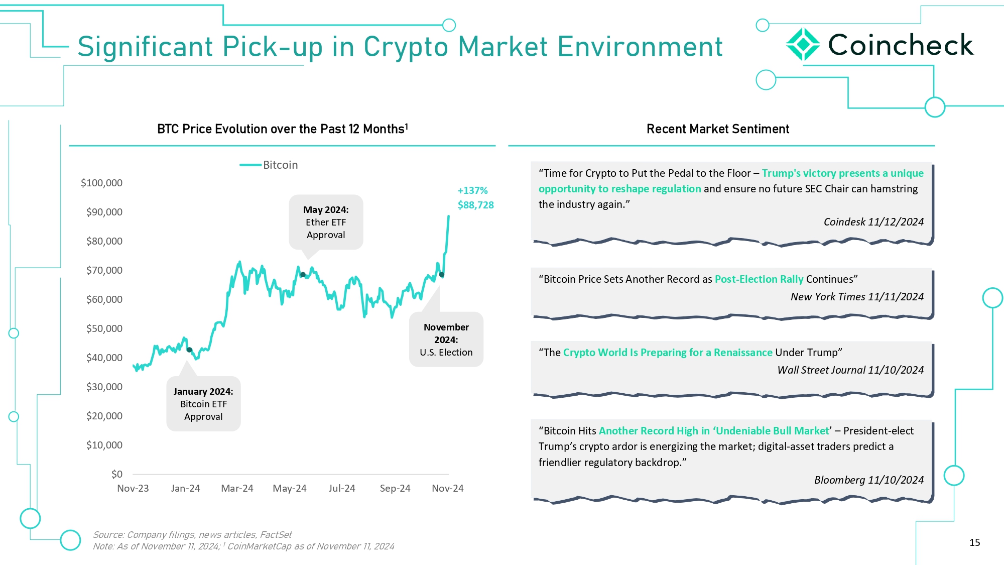 15 ]¯©Â¯¨¯‚Âã V¯¹ ʣ çÕ ¯Â ØöÕãÈ B‚ع›ã Âó¯ØÈÂÁ›Âã d Vد› óȼçã¯È Èó›Ø ã­› V‚Üã ɷɸ BÈÂã­Ü ɷ Source: Company filings, news articles, FactSet Note: As of November 11, 2024; 1 CoinMarketCap as of November 11, 2024 $0 $10,000 $20,000 $30,000 $40,000 $50,000 $60,000 $70,000 $80,000 $90,000 $100,000 No v - 2 3 Ja n - 2 4 M a r - 2 4 M a y - 2 4 Jul - 24 S ep - 2 4 No v - 2 4 B it c o in +137% $88,728 J anua r y 202 4 : Bitcoin ETF Approval May 20 2 4: Et h e r E T F Approval No v ember 2024: U.S. Election Y››Âã B‚ع›ã ]›Âã¯Á›Âã “Time for Crypto to Put the Pedal to the Floor – Trump's victory presents a unique opportunity to reshape regulation and ensure no future SEC Chair can hamstring the industry again.” Coindesk 11/12/2024 “Bitcoin Price Sets Another Record as Post - Election Rally Continues” New York Times 11/11/2024 “The Crypto World Is Preparing for a Renaissance Under Trump” Wall Street Journal 11/10/2024 “Bitcoin Hits Another Record High in ‘Undeniable Bull Market ’ – President - elect Trump’s crypto ardor is energizing the market; digital - asset traders predict a friendlier regulatory backdrop.” Bloomberg 11/10/2024