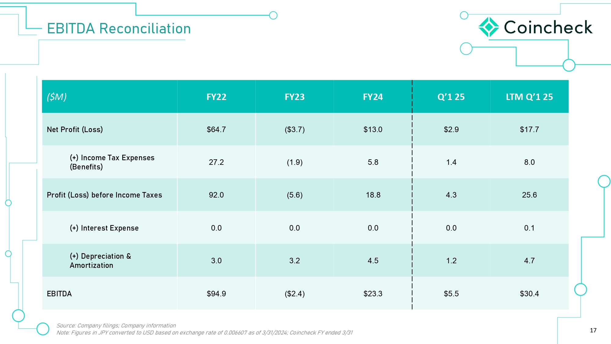 17 0d Y›È¯¼¯‚ã¯È LTM Q’1 25 Q’1 25 FY24 FY23 FY22 ($M) $17.7 $2.9 $13.0 ($3.7) $64.7 C›ã VØÈ¨¯ã ʞ=ÈÜÜʟ 8.0 1.4 5.8 (1.9) 27.2 ʞ˟ʟ 0ÈÁ› d‚õ õÕ›ÂÜ›Ü ʞ›Â›¨¯ãÜʟ 25.6 4.3 18.8 (5.6) 92.0 VØÈ¨¯ã ʞ=ÈÜÜʟ Ž›¨ÈØ› 0ÈÁ› d‚õ›Ü 0.1 0.0 0.0 0.0 0.0 ʞ˟ʟ 0Âã›Ø›Üã õÕ›ÂÜ› 4.7 1.2 4.5 3.2 3.0 ʞ˟ʟ ›ÕØ›¯‚ã¯È ˬ ÁÈØã¯ú‚ã¯È $30.4 $5.5 $23.3 ($2.4) $94.9 0d Source: Company filings; Company information Note: Figures in JPY converted to USD based on exchange rate of 0.006607 as of 3/31/2024; Coincheck FY ended 3/31