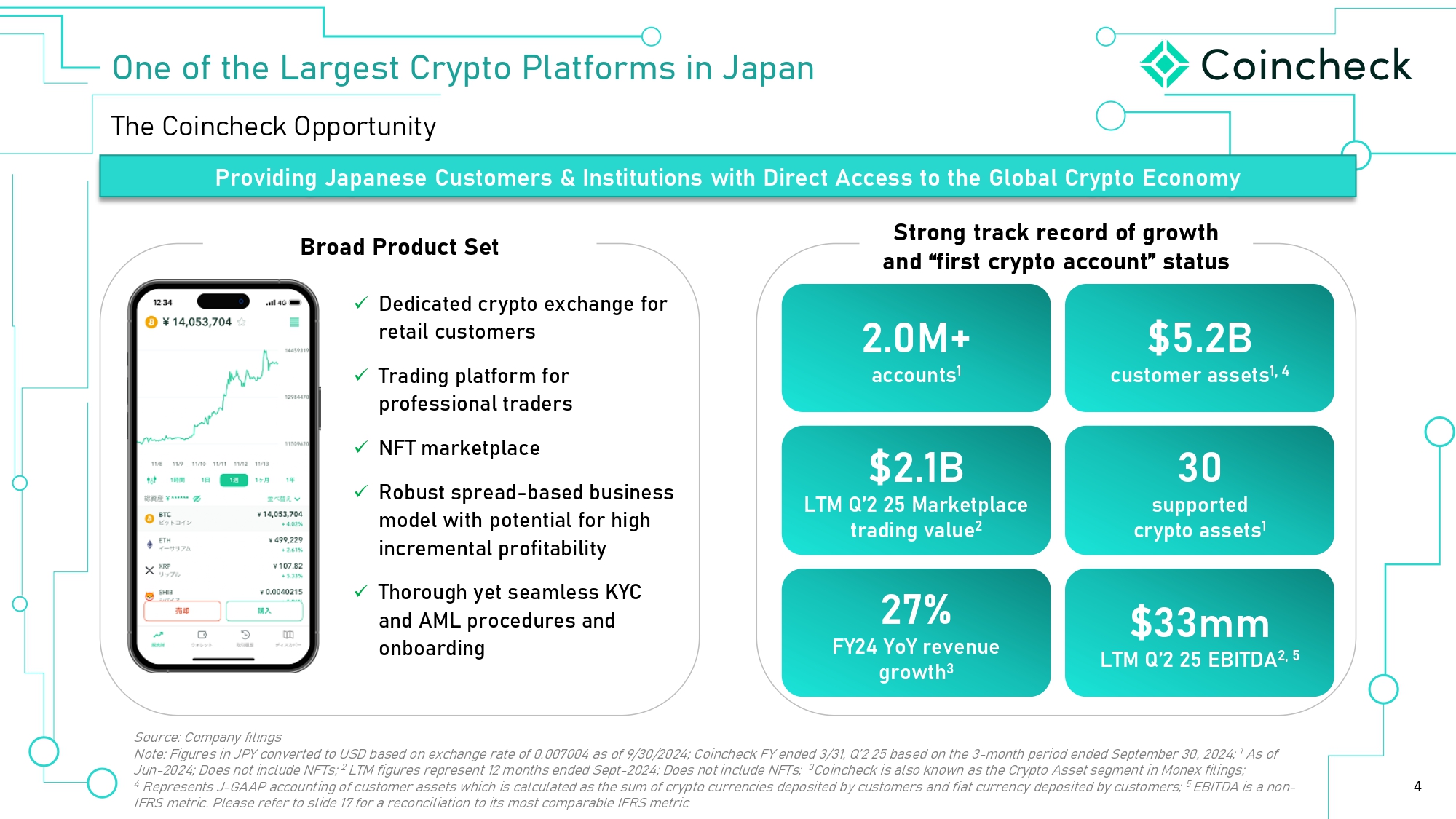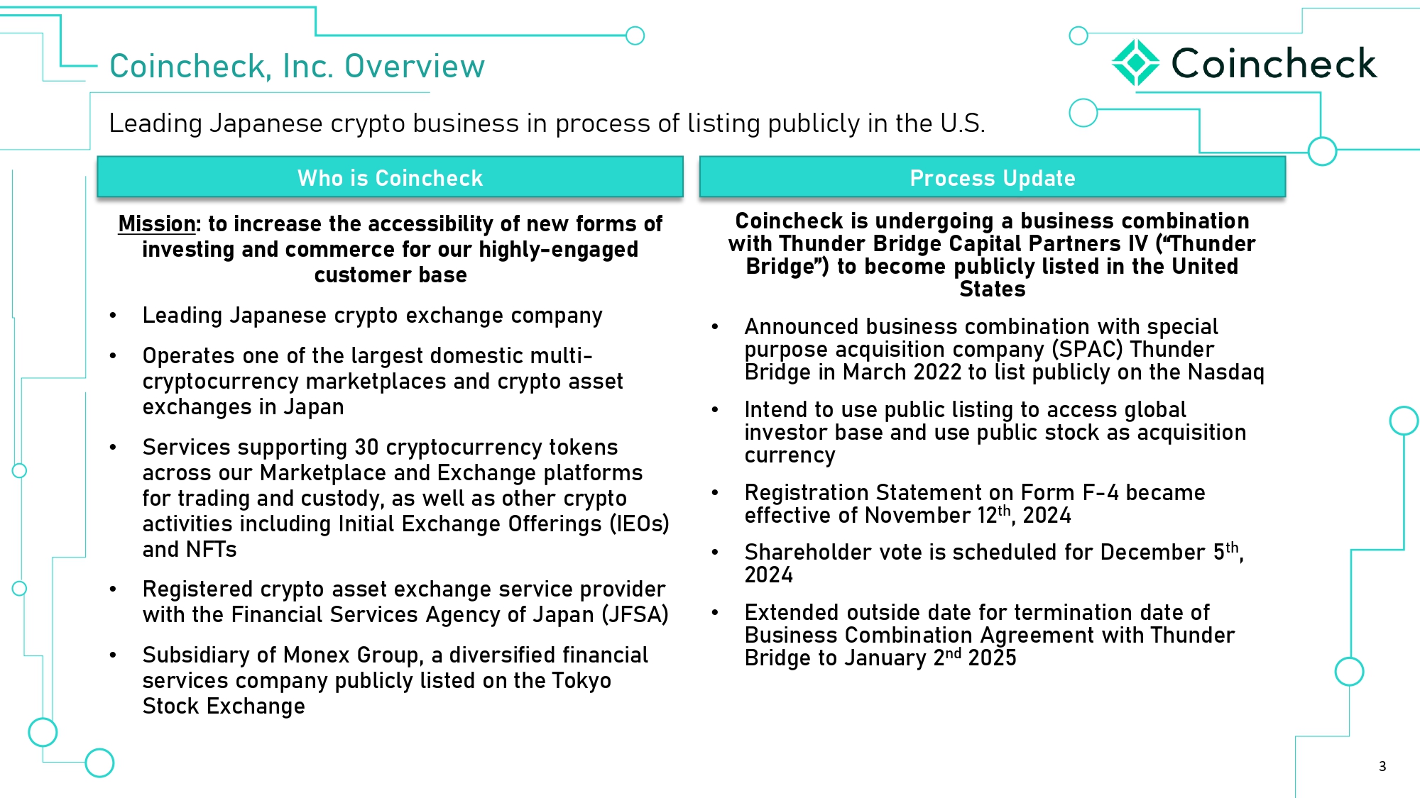 3 ȯ­›¹ʍ 0ʒ Ió›Øó¯›ô Mission : to increase the accessibility of new forms of investing and commerce for our highly - engaged customer base • =›‚•¯Â© 9‚Ղ›ܛ ØöÕãÈ ›õ­‚©› ÈÁÕ‚Âö • I՛؂ã›Ü È› Ȩ ã­› ¼‚Ø©›Üã •ÈÁ›Ü㯐 Áç¼ã¯ ʣ ØöÕãÈçØØ›Âö Á‚ع›ãÕ¼‚›Ü ‚• ØöÕãÈ ‚Üܛ㠛õ­‚©›Ü ¯Â 9‚Õ‚Â • ]›Øó¯›Ü ÜçÕÕÈØã¯Â© ɹɶ ØöÕãÈçØØ›Âö ãȹ›ÂÜ ‚ØÈÜÜ ÈçØ B‚ع›ãÕ¼‚› ‚• õ­‚©› Õ¼‚ã¨ÈØÁÜ ¨ÈØ ãØ‚•¯Â© ‚• çÜãÈ•öʍ ‚Ü ô›¼¼ ‚Ü Èã­›Ø ØöÕãÈ ‚ã¯ó¯ã¯›Ü ¯Â¼ç•¯Â© 0¯㯂¼ õ­‚©› I¨¨›Ø¯Â©Ü ʞ0IÜʟ ‚• C(dÜ • Y›©¯Üã›Ø›• ØöÕãÈ ‚Üܛ㠛õ­‚©› Ü›Øó¯› ÕØÈó¯•›Ø ô¯ã­ ã­› (¯Â‚¯‚¼ ]›Øó¯›Ü ©›Âö Ȩ 9‚Õ‚Â ʞ9(]ʟ • ]çŽÜ¯•¯‚Øö Ȩ BÈ›õ *ØÈçÕʍ ‚ •¯ó›ØÜ¯¨¯›• ¨¯Â‚¯‚¼Ü›Øó¯›Ü ÈÁÕ‚Âö Õ玼¯¼ö ¼¯Ü㛕 È 㭛 dȹöÈ]ãȐ¹ õ­‚©› =›‚•¯Â© 9‚Ղ›ܛ ØöÕãÈ Žçܯ›ÜÜ ¯Â ÕØÈ›ÜÜ È¨ ¼¯Üã¯Â© Õ玼¯¼ö ¯Â ã­› hʒ]ʒ Who is Coincheck Process Update Coincheck is undergoing a business combination with Thunder Bridge Capital Partners IV (“Thunder Bridge”) to become publicly listed in the United States • ÂÂÈ琛• Žçܯ›ÜÜ ÈÁŽ¯Â‚ã¯È ô¯ã­ ÜÕ›¯‚¼ ÕçØÕÈÜ› ‚×ç¯Ü¯ã¯È ÈÁÕ‚Âö ʞ]Vʟ d­ç•›Ø د•©› ¯Â B‚ؐ­ ɸɶɸɸ ãÈ ¼¯Üã Õ玼¯¼ö È 㭛 C‚Ü•‚× • 0Âã›Â• ãÈ çÜ› Õ玼¯ ¼¯Üã¯Â© ãÈ ‚›ÜÜ ©¼ÈŽ‚¼ ¯Âó›ÜãÈØ ނܛ ‚• çÜ› Õ玼¯ ÜãȐ¹ ‚Ü ‚×ç¯Ü¯ã¯È çØØ›Âö • Y›©¯ÜãØ‚ã¯È ]ã‚ã›Á›Âã È (ÈØÁ ( ʣ ɺ Ž›‚Á› ›¨¨›ã¯ó› Ȩ CÈó›ÁŽ›Ø ɷɸ ã­ ʍ ɸɶɸɺ • ]­‚Ø›­È¼•›Ø óÈã› ¯Ü ܐ­›•ç¼›• ¨ÈØ ››ÁŽ›Ø ɻ ã­ ʍ ɸɶɸɺ • õã›Â•›• Èçãܯ•› •‚ã› ¨ÈØ ã›ØÁ¯Â‚ã¯È •‚㛠Ȩ çܯ›ÜÜ ÈÁŽ¯Â‚ã¯È ©Ø››Á›Âã ô¯ã­ d­ç•›ØØ¯•©› ãÈ 9‚Âç‚Øö ɸ • ɸɶɸɻ
