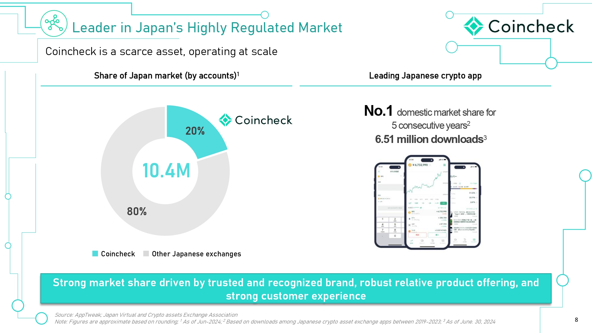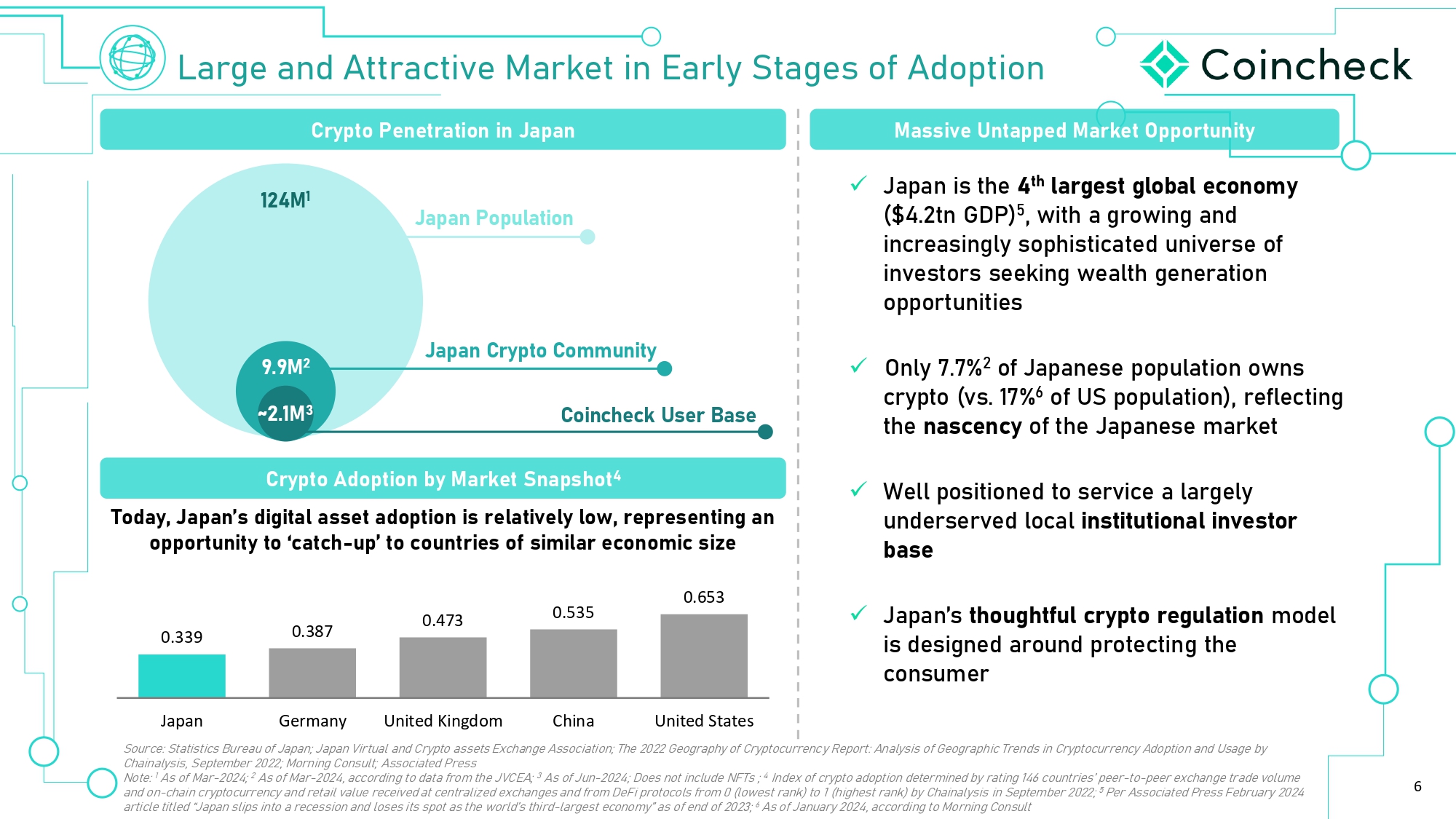 6 =‚Ø©› ‚• ããØ‚ã¯ó› B‚ع›ã ¯Â ‚ؼö ]ã‚©›Ü Ȩ •ÈÕã¯È x 9‚Õ‚Â ¯Ü ã­› 4 th largest global economy ʞ˚ɺʒɸã *Vʟ ɻ ʍ ô¯ã­ ‚ ©ØÈô¯Â© ‚•¯ÂØ›‚ܯ©¼ö ÜÈÕ­¯Ü㯐‚㛕 ç¯ó›ØÜ› Ȩ ¯Âó›ÜãÈØÜ Ü››¹¯Â© ô›‚¼ã­ ©›Â›Ø‚ã¯ÈÂÈÕÕÈØãçÂ¯ã¯›Ü x I¼ö ɽʒɽ˩ ɸ Ȩ 9‚Ղ›ܛ ÕÈÕ缂ã¯È ÈôÂÜ ØöÕãÈ ʞóÜʒ ɷɽ˩ ɼ Ȩ h] ÕÈÕ缂ã¯ÈÂʟʍ Ø›¨¼›ã¯Â© ã­› nascency Ȩ ã­› 9‚Ղ›ܛ Á‚ع›ã x w›¼¼ ÕÈܯã¯È›• ãÈ Ü›Øó¯› ‚ ¼‚Ø©›¼ö ç•›ØÜ›Øó›• ¼È‚¼ institutional investor base x 9‚Õ‚ÂʭÜ thoughtful crypto regulation ÁÈ•›¼ ¯Ü •›Ü¯©Â›• ‚ØÈç• ÕØÈ㛐ã¯Â© ã­› ÈÂÜçÁ›Ø Crypto Penetration in Japan Massive Untapped Market Opportunity Japan Germany United Kingdom China United States Source: Statistics Bureau of Japan; Japan Virtual and Crypto assets Exchange Association; The 2022 Geography of Cryptocurrency Report: Analysis of Geographic Trends in Cryptocurrency Adoption and Usage by Chainalysis, September 2022; Morning Consult; Associated Press Note: 1 As of Mar - 2024; 2 As of Mar - 2024, according to data from the JVCEA; 3 As of Jun - 2024; Does not include NFTs ; 4 Index of crypto adoption determined by rating 146 countries’ peer - to - peer exchange trade volume and on - chain cryptocurrency and retail value received at centralized exchanges and from DeFi protocols from 0 (lowest rank) to 1 (highest rank) by Chainalysis in September 2022; 5 Per Associated Press February 2024 article titled “Japan slips into a recession and loses its spot as the world’s third - largest economy” as of end of 2023; 6 As of January 2024, according to Morning Consult 9.9M 2 124M 1 Japan Population Japan Crypto Community ~2.1M 3 Coincheck User Base Crypto Adoption by Market Snapshot 4 Today, Japan’s digital asset adoption is relatively low, representing an opportunity to ‘catch - up’ to countries of similar economic size 0.339 0.387 0.473 0.535 0.653
