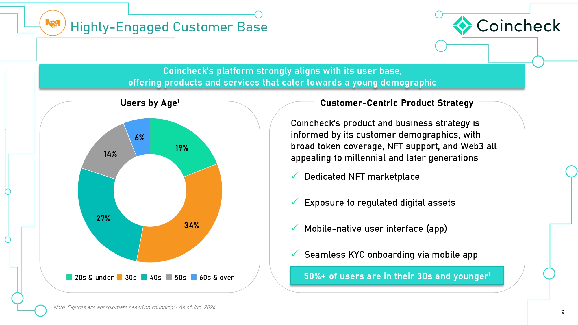 8 =›‚•›Ø ¯Â 9‚Õ‚ÂʭÜ .¯©­¼ö Y›©ç¼‚㛕 B‚ع›ã ȯ­›¹ ¯Ü ‚ ܐ‚ؐ› ‚ÜÜ›ãʍ È՛؂ã¯Â© ‚ã ܐ‚¼› =›‚•¯Â© 9‚Ղ›ܛ ØöÕãÈ ‚ÕÕ ]­‚Ø› Ȩ 9‚Õ‚Â Á‚ع›ã ʞŽö ‚ÈçÂãÜʟ ɷ Strong market share driven by trusted and recognized brand, robust relative product offering, and strong customer experience Source: AppTweak; Japan Virtual and Crypto assets Exchange Association Note: Figures are approximate based on rounding; 1 As of Jun - 2024; 2 Based on downloads among Japanese crypto asset exchange apps between 2019 - 2023; 3 As of June. 30, 2024 ■ ȯ­›¹ ˛ Iã­›Ø 9‚Ղ›ܛ ›õ­‚©›Ü 20% 80% 10.4M No.1 domestic market share for 5 consecutive years 2 6.51 million downloads 3