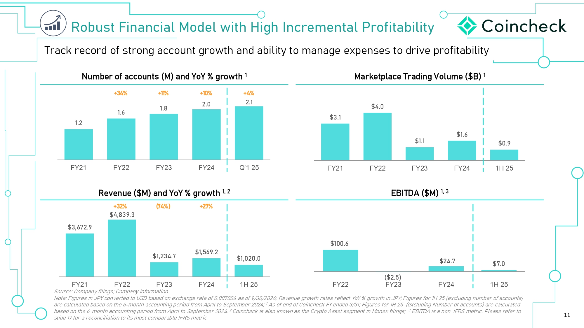 10 IçØ Y›ó›Âç› BÈ•›¼ Source: Company filings Note: Figures in JPY converted to USD based on exchange rate of 0.007004 as of 9/30/2024; All figures for Coincheck FY24, being the 12 months ended 3/31/2024 Transaction Revenue 92.5% of Total Revenue Transaction Volume (Marketplace) Spread 3.42% Average Spread $1.6B Total FY24 Volume X Total Revenue Non - Transaction Revenue NFTs Initial Exchange Offering Wholesale services Cryptocurrency subscriptions Deposit and Withdrawal Fees (Crypto + Fiat) 7.5% of Total Revenue