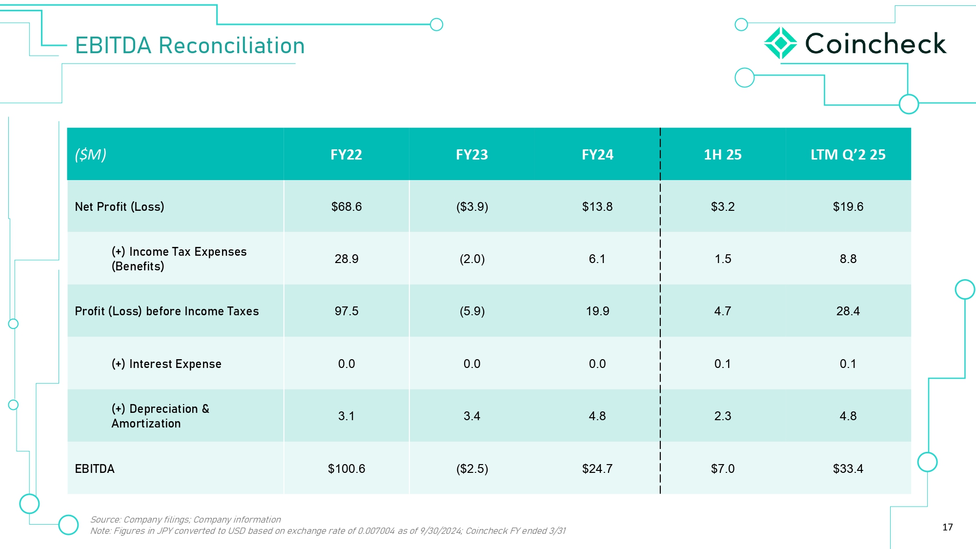 17 0d Y›È¯¼¯‚ã¯È LTM Q’2 25 1H 25 FY24 FY23 FY22 ($M) $19.6 $3.2 $13.8 ($3.9) $68.6 C›ã VØÈ¨¯ã ʞ=ÈÜÜʟ 8.8 1.5 6.1 (2.0) 28.9 ʞ˟ʟ 0ÈÁ› d‚õ õÕ›ÂÜ›Ü ʞ›Â›¨¯ãÜʟ 28.4 4.7 19.9 (5.9) 97.5 VØÈ¨¯ã ʞ=ÈÜÜʟ Ž›¨ÈØ› 0ÈÁ› d‚õ›Ü 0.1 0.1 0.0 0.0 0.0 ʞ˟ʟ 0Âã›Ø›Üã õÕ›ÂÜ› 4.8 2.3 4.8 3.4 3.1 ʞ˟ʟ ›ÕØ›¯‚ã¯È ˬ ÁÈØã¯ú‚ã¯È $33.4 $7.0 $24.7 ($2.5) $100.6 0d Source: Company filings; Company information Note: Figures in JPY converted to USD based on exchange rate of 0.007004 as of 9/30/2024; Coincheck FY ended 3/31
