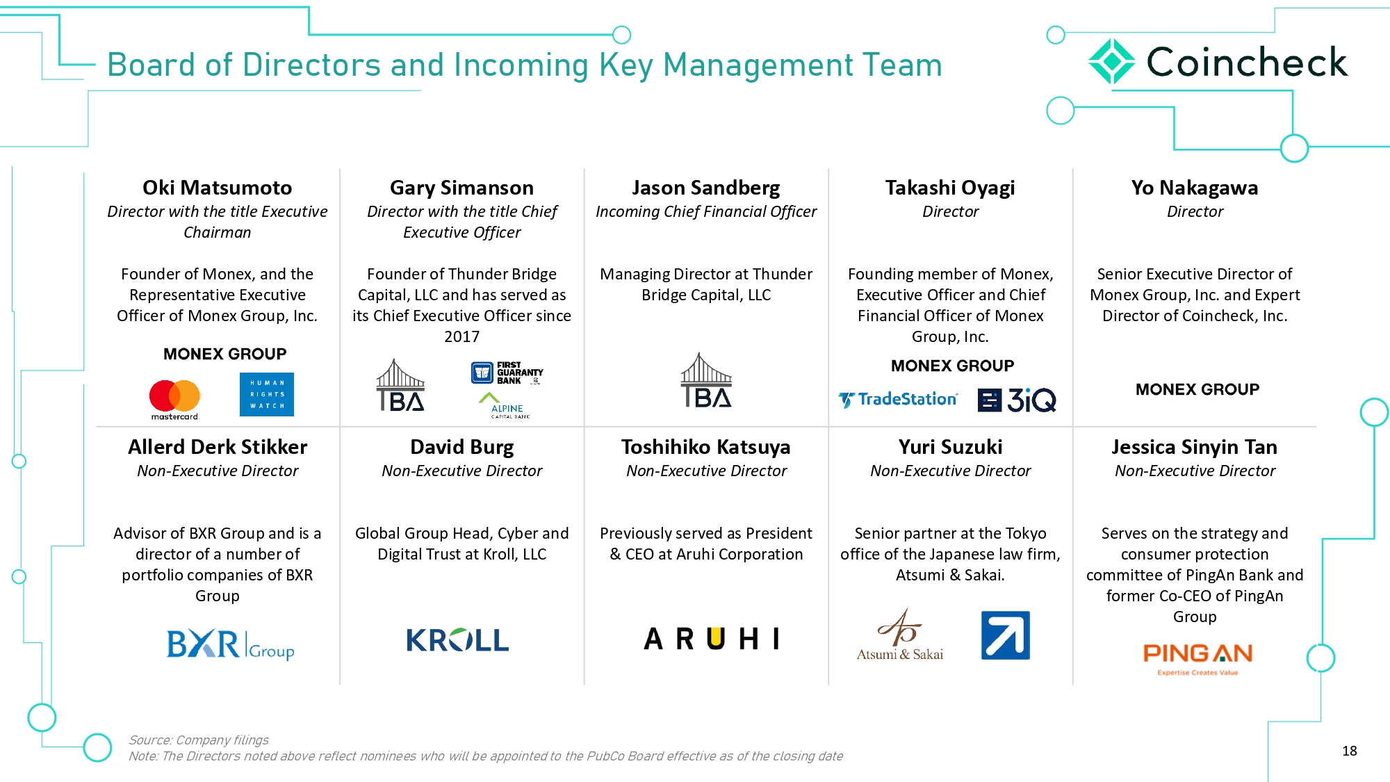 Yo Nakagawa Director Senior Executive Director of Monex Group, Inc. and Expert Director of Coincheck, Inc. Takashi Oyagi Director Founding member of Monex, Executive Officer and Chief Financial Officer of Monex Group, Inc. Jason Sandberg Incoming Chief Financial Officer Managing Director at Thunder Bridge Capital, LLC Gary Simanson Director with the title Chief Executive Officer Founder of Thunder Bridge Capital, LLC and has served as its Chief Executive Officer since 2017 Oki Matsumoto Director with the title Executive Chairman Founder of Monex, and the Representative Executive Officer of Monex Group, Inc . Jessica Sinyin Tan Non - Executive Director Serves on the strategy and consumer protection committee of PingAn Bank and former Co - CEO of PingAn Group Yuri Suzuki Non - Executive Director Senior partner at the Tokyo office of the Japanese law firm, Atsumi & Sakai. Toshihiko Katsuya Non - Executive Director Previously served as President & CEO at Aruhi Corporation David Burg Non - Executive Director Global Group Head, Cyber and Digital Trust at Kroll, LLC Allerd Derk Stikker Non - Executive Director Advisor of BXR Group and is a director of a number of portfolio companies of BXR Group Source: Company filings Note: The Directors noted above reflect nominees who will be appointed to the PubCo Board effective as of the closing date 18 Ȃؕ Ȩ ¯Ø›ãÈØÜ ‚• 0ÈÁ¯Â© :›ö B‚‚©›Á›Âã d›‚Á