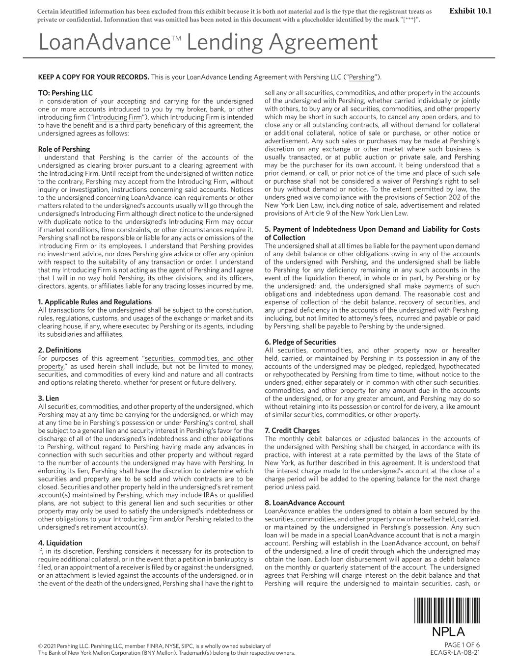 PAGE 1 OF 6 ECAGR-LA-08-21 © 2021 Pershing LLC. Pershing LLC, member FINRA, NYSE, SIPC, is a wholly owned subsidiary of The Bank of New York Mellon Corporation (BNY Mellon). Trademark(s) belong to their respective owners. KEEP A COPY FOR YOUR RECORDS. This is your LoanAdvance Lending Agreement with Pershing LLC (“Pershing”). TO: Pershing LLC In consideration of your accepting and carrying for the undersigned one or more accounts introduced to you by my broker, bank, or other introducing firm (“Introducing Firm”), which Introducing Firm is intended to have the benefit and is a third party beneficiary of this agreement, the undersigned agrees as follows: Role of Pershing I understand that Pershing is the carrier of the accounts of the undersigned as clearing broker pursuant to a clearing agreement with the Introducing Firm. Until receipt from the undersigned of written notice to the contrary, Pershing may accept from the Introducing Firm, without inquiry or investigation, instructions concerning said accounts. Notices to the undersigned concerning LoanAdvance loan requirements or other matters related to the undersigned’s accounts usually will go through the undersigned’s Introducing Firm although direct notice to the undersigned with duplicate notice to the undersigned’s Introducing Firm may occur if market conditions, time constraints, or other circumstances require it. Pershing shall not be responsible or liable for any acts or omissions of the Introducing Firm or its employees. I understand that Pershing provides no investment advice, nor does Pershing give advice or offer any opinion with respect to the suitability of any transaction or order. I understand that my Introducing Firm is not acting as the agent of Pershing and I agree that I will in no way hold Pershing, its other divisions, and its officers, directors, agents, or affiliates liable for any trading losses incurred by me. 1. Applicable Rules and Regulations All transactions for the undersigned shall be subject to the constitution, rules, regulations, customs, and usages of the exchange or market and its clearing house, if any, where executed by Pershing or its agents, including its subsidiaries and affiliates. 2. Definitions For purposes of this agreement “securities, commodities, and other property,” as used herein shall include, but not be limited to money, securities, and commodities of every kind and nature and all contracts and options relating thereto, whether for present or future delivery. 3. Lien All securities, commodities, and other property of the undersigned, which Pershing may at any time be carrying for the undersigned, or which may at any time be in Pershing’s possession or under Pershing’s control, shall be subject to a general lien and security interest in Pershing’s favor for the discharge of all of the undersigned’s indebtedness and other obligations to Pershing, without regard to Pershing having made any advances in connection with such securities and other property and without regard to the number of accounts the undersigned may have with Pershing. In enforcing its lien, Pershing shall have the discretion to determine which securities and property are to be sold and which contracts are to be closed. Securities and other property held in the undersigned’s retirement account(s) maintained by Pershing, which may include IRAs or qualified plans, are not subject to this general lien and such securities or other property may only be used to satisfy the undersigned’s indebtedness or other obligations to your Introducing Firm and/or Pershing related to the undersigned’s retirement account(s). 4. Liquidation If, in its discretion, Pershing considers it necessary for its protection to require additional collateral, or in the event that a petition in bankruptcy is filed, or an appointment of a receiver is filed by or against the undersigned, or an attachment is levied against the accounts of the undersigned, or in the event of the death of the undersigned, Pershing shall have the right to sell any or all securities, commodities, and other property in the accounts of the undersigned with Pershing, whether carried individually or jointly with others, to buy any or all securities, commodities, and other property which may be short in such accounts, to cancel any open orders, and to close any or all outstanding contracts, all without demand for collateral or additional collateral, notice of sale or purchase, or other notice or advertisement. Any such sales or purchases may be made at Pershing’s discretion on any exchange or other market where such business is usually transacted, or at public auction or private sale, and Pershing may be the purchaser for its own account. It being understood that a prior demand, or call, or prior notice of the time and place of such sale or purchase shall not be considered a waiver of Pershing’s right to sell or buy without demand or notice. To the extent permitted by law, the undersigned waive compliance with the provisions of Section 202 of the New York Lien Law, including notice of sale, advertisement and related provisions of Article 9 of the New York Lien Law. 5. Payment of Indebtedness Upon Demand and Liability for Costs of Collection The undersigned shall at all times be liable for the payment upon demand of any debit balance or other obligations owing in any of the accounts of the undersigned with Pershing, and the undersigned shall be liable to Pershing for any deficiency remaining in any such accounts in the event of the liquidation thereof, in whole or in part, by Pershing or by the undersigned; and, the undersigned shall make payments of such obligations and indebtedness upon demand. The reasonable cost and expense of collection of the debit balance, recovery of securities, and any unpaid deficiency in the accounts of the undersigned with Pershing, including, but not limited to attorney’s fees, incurred and payable or paid by Pershing