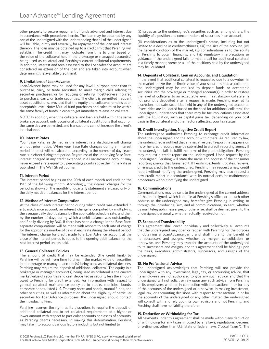 LoanAdvanceTM Lending Agreement PAGE 2 OF 6 ECAGR-LA-08-21 © 2021 Pershing LLC. Pershing LLC, member FINRA, NYSE, SIPC, is a wholly owned subsidiary of The Bank of New York Mellon Corporation (BNY Mellon). Trademark(s) belong to their respective owners. other property to secure repayment of funds advanced and interest due in accordance with procedures herein. The loan may be obtained by any one of the undersigned with the understanding that all of the undersigned will be liable, jointly and severally, for repayment of the loan and interest thereon. The loan may be obtained up to a credit limit that Pershing will establish. The credit limit may fluctuate from time to time, based on the value of the collateral held in the brokerage or managed account(s) being used as collateral and Pershing’s current collateral requirements. In addition, interest and fees assessed to the LoanAdvance account are considered an extension of the loan and are taken into account when determining the available credit limit. 9. Limitations of LoanAdvance LoanAdvance loans may be used for any lawful purpose other than to purchase, carry, or trade securities, to meet margin calls relating to securities purchases, or for reducing or retiring indebtedness incurred to purchase, carry, or trade securities. The client is permitted frequent asset substitutions, provided that the equity and collateral remains at an acceptable level. Note: Mutual fund purchases and sales must be within the same family of funds in order to get immediate release on collateral. NOTE: In addition, when the collateral and loan are held within the same brokerage account, only occasional collateral substitutions that occur on the same day are permitted, and transactions cannot increase the client’s loan balance. 10. Interest Rates Your Base Rate, as defined in the interest rate disclosure,will change without prior notice. When your Base Rate changes during an interest period, interest will be calculated according to the number of days each rate is in effect during that period. Regardless of the underlying Base Rate, interest charged in any credit extended in a LoanAdvance account may never exceed a rate equal to 3 percentage points above the Prime Rate as published in The Wall Street Journal. 11. Interest Period The interest period begins on the 20th of each month and ends on the 19th of the following month. Accordingly, the interest charges for the period as shown on the monthly or quarterly statement are based only on the daily net debit balances for the interest period. 12. Method of Interest Computation At the close of each interest period during which credit was extended in a LoanAdvance account, an interest charge is computed by multiplying the average daily debit balance by the applicable schedule rate, and then by the number of days during which a debit balance was outstanding, and finally dividing by 360. If there has been a change in the Base Rate, separate computations will be made with respect to each rate of charge for the appropriate number of days at each rate during the interest period. The interest charge for credit made to a LoanAdvance account at the close of the interest period is added to the opening debit balance for the next interest period unless paid. 13. General Collateral Policies The amount of credit that may be extended (the credit limit) by Pershing will be set from time to time. If the market value of securities in a brokerage or managed account(s) being used as collateral declines, Pershing may require the deposit of additional collateral. The equity in a brokerage or managed account(s) being used as collateral is the current market value of securities and cash deposited as security less the amount owed to Pershing for credit extended. For information with respect to general collateral maintenance policy as to stocks, municipal bonds, corporate bonds, listed U.S. Treasury notes and bonds, mutual funds, and other securities, as well as information about the eligibility of particular securities for LoanAdvance purposes, the undersigned should contact the Introducing Firm. Pershing reserves the right, at its discretion, to require the deposit of additional collateral and to set collateral requirements at a higher or lower amount with respect to particular accounts or classes of accounts, as Pershing deems necessary. In making this determination, Pershing may take into account various factors including but not limited to (i) issues as to the undersigned’s securities such as, among others, the liquidity of a position and concentrations of securities in an account, (ii) considerations as to the undersigned’s status, including but not limited to a decline in creditworthiness, (iii) the size of the account, (iv) the general condition of the market, (v) considerations as to the ability of Pershing to obtain financing, and (vi) regulatory interpretations or guidance. If the undersigned fails to meet a call for additional collateral in a timely manner, some or all of the positions held by the undersigned may be liquidated. 14. Deposits of Collateral, Lien on Accounts, and Liquidation In the event that additional collateral is requested due to a downturn in the market and/or the decline in value of your securities held as collateral, the undersigned may be required to deposit funds or acceptable securities into the brokerage or managed account(s) in order to restore the level of collateral to an acceptable level. If satisfactory collateral is not promptly deposited after a request is made, Pershing may, at its discretion, liquidate securities held in any of the undersigned accounts. If securities are liquidated based on the need for additional collateral, the undersigned understands that there may be tax implications associated with the liquidation, such as capital gains tax, depending on your cost basis in the collateral and other factors affecting your tax status. 15. Credit Investigation, Negative Credit Report The