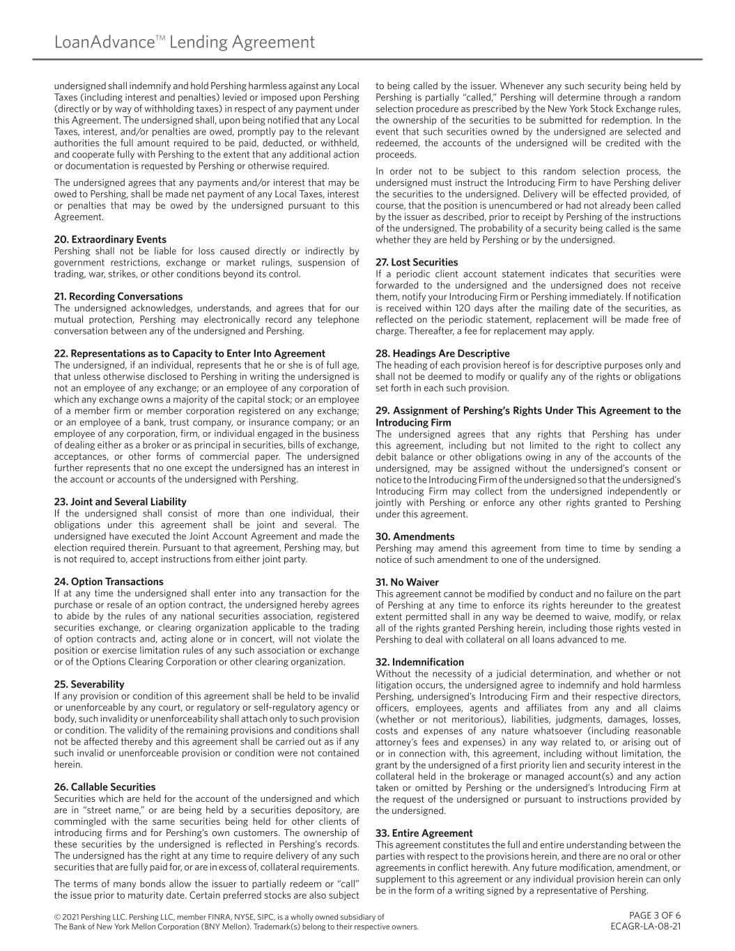 LoanAdvanceTM Lending Agreement PAGE 3 OF 6 ECAGR-LA-08-21 © 2021 Pershing LLC. Pershing LLC, member FINRA, NYSE, SIPC, is a wholly owned subsidiary of The Bank of New York Mellon Corporation (BNY Mellon). Trademark(s) belong to their respective owners. undersigned shall indemnify and hold Pershing harmless against any Local Taxes (including interest and penalties) levied or imposed upon Pershing (directly or by way of withholding taxes) in respect of any payment under this Agreement. The undersigned shall, upon being notified that any Local Taxes, interest, and/or penalties are owed, promptly pay to the relevant authorities the full amount required to be paid, deducted, or withheld, and cooperate fully with Pershing to the extent that any additional action or documentation is requested by Pershing or otherwise required. The undersigned agrees that any payments and/or interest that may be owed to Pershing, shall be made net payment of any Local Taxes, interest or penalties that may be owed by the undersigned pursuant to this Agreement. 20. Extraordinary Events Pershing shall not be liable for loss caused directly or indirectly by government restrictions, exchange or market rulings, suspension of trading, war, strikes, or other conditions beyond its control. 21. Recording Conversations The undersigned acknowledges, understands, and agrees that for our mutual protection, Pershing may electronically record any telephone conversation between any of the undersigned and Pershing. 22. Representations as to Capacity to Enter Into Agreement The undersigned, if an individual, represents that he or she is of full age, that unless otherwise disclosed to Pershing in writing the undersigned is not an employee of any exchange; or an employee of any corporation of which any exchange owns a majority of the capital stock; or an employee of a member firm or member corporation registered on any exchange; or an employee of a bank, trust company, or insurance company; or an employee of any corporation, firm, or individual engaged in the business of dealing either as a broker or as principal in securities, bills of exchange, acceptances, or other forms of commercial paper. The undersigned further represents that no one except the undersigned has an interest in the account or accounts of the undersigned with Pershing. 23. Joint and Several Liability If the undersigned shall consist of more than one individual, their obligations under this agreement shall be joint and several. The undersigned have executed the Joint Account Agreement and made the election required therein. Pursuant to that agreement, Pershing may, but is not required to, accept instructions from either joint party. 24. Option Transactions If at any time the undersigned shall enter into any transaction for the purchase or resale of an option contract, the undersigned hereby agrees to abide by the rules of any national securities association, registered securities exchange, or clearing organization applicable to the trading of option contracts and, acting alone or in concert, will not violate the position or exercise limitation rules of any such association or exchange or of the Options Clearing Corporation or other clearing organization. 25. Severability If any provision or condition of this agreement shall be held to be invalid or unenforceable by any court, or regulatory or self-regulatory agency or body, such invalidity or unenforceability shall attach only to such provision or condition. The validity of the remaining provisions and conditions shall not be affected thereby and this agreement shall be carried out as if any such invalid or unenforceable provision or condition were not contained herein. 26. Callable Securities Securities which are held for the account of the undersigned and which are in “street name,” or are being held by a securities depository, are commingled with the same securities being held for other clients of introducing firms and for Pershing’s own customers. The ownership of these securities by the undersigned is reflected in Pershing’s records. The undersigned has the right at any time to require delivery of any such securities that are fully paid for, or are in excess of, collateral requirements. The terms of many bonds allow the issuer to partially redeem or “call” the issue prior to maturity date. Certain preferred stocks are also subject to being called by the issuer. Whenever any such security being held by Pershing is partially “called,” Pershing will determine through a random selection procedure as prescribed by the New York Stock Exchange rules, the ownership of the securities to be submitted for redemption. In the event that such securities owned by the undersigned are selected and redeemed, the accounts of the undersigned will be credited with the proceeds. In order not to be subject to this random selection process, the undersigned must instruct the Introducing Firm to have Pershing deliver the securities to the undersigned. Delivery will be effected provided, of course, that the position is unencumbered or had not already been called by the issuer as described, prior to receipt by Pershing of the instructions of the undersigned. The probability of a security being called is the same whether they are held by Pershing or by the undersigned. 27. Lost Securities If a periodic client account statement indicates that securities were forwarded to the undersigned and the undersigned does not receive them, notify your Introducing Firm or Pershing immediately. If notification is received within 120 days after the mailing date of the securities, as reflected on the periodic statement, replacement will be made free of charge. Thereafter, a fee for replacement may apply. 28. Headings Are Descriptive The heading of each provision hereof is for descriptive purposes only and shall not be deemed to modify or qualify any of the rights or obligations set forth in each such provision. 29. Assignment of Persh