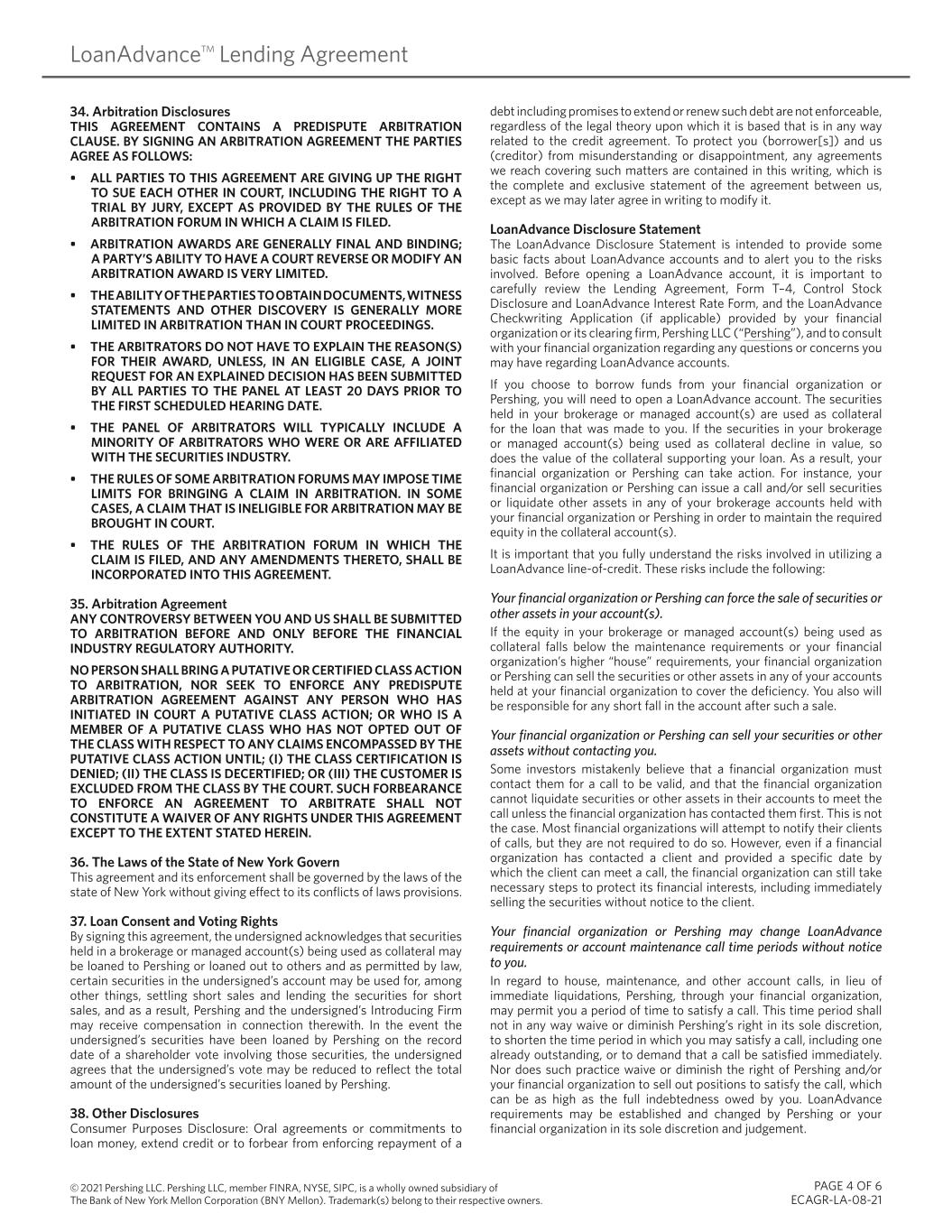 LoanAdvanceTM Lending Agreement PAGE 4 OF 6 ECAGR-LA-08-21 © 2021 Pershing LLC. Pershing LLC, member FINRA, NYSE, SIPC, is a wholly owned subsidiary of The Bank of New York Mellon Corporation (BNY Mellon). Trademark(s) belong to their respective owners. 34. Arbitration Disclosures THIS AGREEMENT CONTAINS A PREDISPUTE ARBITRATION CLAUSE. BY SIGNING AN ARBITRATION AGREEMENT THE PARTIES AGREE AS FOLLOWS: • ALL PARTIES TO THIS AGREEMENT ARE GIVING UP THE RIGHT TO SUE EACH OTHER IN COURT, INCLUDING THE RIGHT TO A TRIAL BY JURY, EXCEPT AS PROVIDED BY THE RULES OF THE ARBITRATION FORUM IN WHICH A CLAIM IS FILED. • ARBITRATION AWARDS ARE GENERALLY FINAL AND BINDING; A PARTY’S ABILITY TO HAVE A COURT REVERSE OR MODIFY AN ARBITRATION AWARD IS VERY LIMITED. • THE ABILITY OF THE PARTIES TO OBTAIN DOCUMENTS, WITNESS STATEMENTS AND OTHER DISCOVERY IS GENERALLY MORE LIMITED IN ARBITRATION THAN IN COURT PROCEEDINGS. • THE ARBITRATORS DO NOT HAVE TO EXPLAIN THE REASON(S) FOR THEIR AWARD, UNLESS, IN AN ELIGIBLE CASE, A JOINT REQUEST FOR AN EXPLAINED DECISION HAS BEEN SUBMITTED BY ALL PARTIES TO THE PANEL AT LEAST 20 DAYS PRIOR TO THE FIRST SCHEDULED HEARING DATE. • THE PANEL OF ARBITRATORS WILL TYPICALLY INCLUDE A MINORITY OF ARBITRATORS WHO WERE OR ARE AFFILIATED WITH THE SECURITIES INDUSTRY. • THE RULES OF SOME ARBITRATION FORUMS MAY IMPOSE TIME LIMITS FOR BRINGING A CLAIM IN ARBITRATION. IN SOME CASES, A CLAIM THAT IS INELIGIBLE FOR ARBITRATION MAY BE BROUGHT IN COURT. • THE RULES OF THE ARBITRATION FORUM IN WHICH THE CLAIM IS FILED, AND ANY AMENDMENTS THERETO, SHALL BE INCORPORATED INTO THIS AGREEMENT. 35. Arbitration Agreement ANY CONTROVERSY BETWEEN YOU AND US SHALL BE SUBMITTED TO ARBITRATION BEFORE AND ONLY BEFORE THE FINANCIAL INDUSTRY REGULATORY AUTHORITY. NO PERSON SHALL BRING A PUTATIVE OR CERTIFIED CLASS ACTION TO ARBITRATION, NOR SEEK TO ENFORCE ANY PREDISPUTE ARBITRATION AGREEMENT AGAINST ANY PERSON WHO HAS INITIATED IN COURT A PUTATIVE CLASS ACTION; OR WHO IS A MEMBER OF A PUTATIVE CLASS WHO HAS NOT OPTED OUT OF THE CLASS WITH RESPECT TO ANY CLAIMS ENCOMPASSED BY THE PUTATIVE CLASS ACTION UNTIL; (I) THE CLASS CERTIFICATION IS DENIED; (II) THE CLASS IS DECERTIFIED; OR (III) THE CUSTOMER IS EXCLUDED FROM THE CLASS BY THE COURT. SUCH FORBEARANCE TO ENFORCE AN AGREEMENT TO ARBITRATE SHALL NOT CONSTITUTE A WAIVER OF ANY RIGHTS UNDER THIS AGREEMENT EXCEPT TO THE EXTENT STATED HEREIN. 36. The Laws of the State of New York Govern This agreement and its enforcement shall be governed by the laws of the state of New York without giving effect to its conflicts of laws provisions. 37. Loan Consent and Voting Rights By signing this agreement, the undersigned acknowledges that securities held in a brokerage or managed account(s) being used as collateral may be loaned to Pershing or loaned out to others and as permitted by law, certain securities in the undersigned’s account may be used for, among other things, settling short sales and lending the securities for short sales, and as a result, Pershing and the undersigned’s Introducing Firm may receive compensation in connection therewith. In the event the undersigned’s securities have been loaned by Pershing on the record date of a shareholder vote involving those securities, the undersigned agrees that the undersigned’s vote may be reduced to reflect the total amount of the undersigned’s securities loaned by Pershing. 38. Other Disclosures Consumer Purposes Disclosure: Oral agreements or commitments to loan money, extend credit or to forbear from enforcing repayment of a debt including promises to extend or renew such debt are not enforceable, regardless of the legal theory upon which it is based that is in any way related to the credit agreement. To protect you (borrower[s]) and us (creditor) from misunderstanding or disappointment, any agreements we reach covering such matters are contained in this writing, which is the complete and exclusive statement of the agreement between us, except as we may later agree in writing to modify it. LoanAdvance Disclosure Statement The LoanAdvance Disclosure Statement is intended to provide some basic facts about LoanAdvance accounts and to alert you to the risks involved. Before opening a LoanAdvance account, it is important to carefully review the Lending Agreement, Form T–4, Control Stock Disclosure and LoanAdvance Interest Rate Form, and the LoanAdvance Checkwriting Application (if applicable) provided by your financial organization or its clearing firm, Pershing LLC (“Pershing”), and to consult with your financial organization regarding any questions or concerns you may have regarding LoanAdvance accounts. If you choose to borrow funds from your financial organization or Pershing, you will need to open a LoanAdvance account. The securities held in your brokerage or managed account(s) are used as collateral for the loan that was made to you. If the securities in your brokerage or managed account(s) being used as collateral decline in value, so does the value of the collateral supporting your loan. As a result, your financial organization or Pershing can take action. For instance, your financial organization or Pershing can issue a call and/or sell securities or liquidate other assets in any of your brokerage accounts held with your financial organization or Pershing in order to maintain the required equity in the collateral account(s). It is important that you fully understand the risks involved in utilizing a LoanAdvance line-of-credit. These risks include the following: Your financial organization or Pershing can force the sale of securities or other assets in your account(s). If the equity in your brokerage or managed account(s) being used as collateral falls below the maintenance requirements or your financial organization’s higher “house” requirements, your financial organization or Pershing can sell the securities or other assets in any of your accounts held at your fin