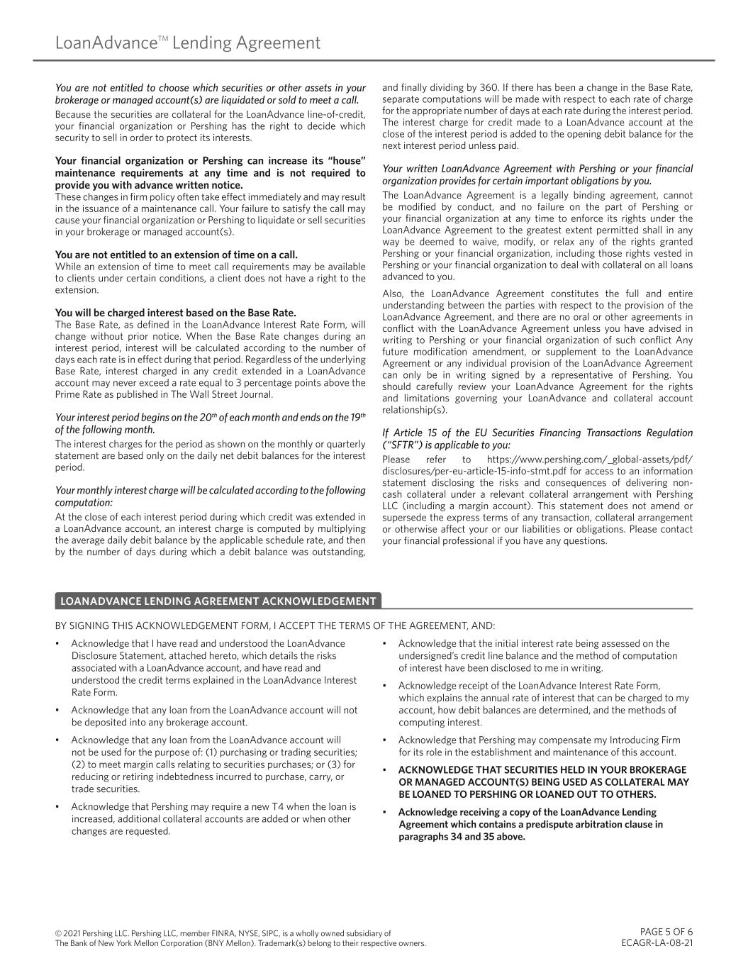 LoanAdvanceTM Lending Agreement PAGE 5 OF 6 ECAGR-LA-08-21 © 2021 Pershing LLC. Pershing LLC, member FINRA, NYSE, SIPC, is a wholly owned subsidiary of The Bank of New York Mellon Corporation (BNY Mellon). Trademark(s) belong to their respective owners. You are not entitled to choose which securities or other assets in your brokerage or managed account(s) are liquidated or sold to meet a call. Because the securities are collateral for the LoanAdvance line-of-credit, your financial organization or Pershing has the right to decide which security to sell in order to protect its interests. Your financial organization or Pershing can increase its “house” maintenance requirements at any time and is not required to provide you with advance written notice. These changes in firm policy often take effect immediately and may result in the issuance of a maintenance call. Your failure to satisfy the call may cause your financial organization or Pershing to liquidate or sell securities in your brokerage or managed account(s). You are not entitled to an extension of time on a call. While an extension of time to meet call requirements may be available to clients under certain conditions, a client does not have a right to the extension. You will be charged interest based on the Base Rate. The Base Rate, as defined in the LoanAdvance Interest Rate Form, will change without prior notice. When the Base Rate changes during an interest period, interest will be calculated according to the number of days each rate is in effect during that period. Regardless of the underlying Base Rate, interest charged in any credit extended in a LoanAdvance account may never exceed a rate equal to 3 percentage points above the Prime Rate as published in The Wall Street Journal. Your interest period begins on the 20th of each month and ends on the 19th of the following month. The interest charges for the period as shown on the monthly or quarterly statement are based only on the daily net debit balances for the interest period. Your monthly interest charge will be calculated according to the following computation: At the close of each interest period during which credit was extended in a LoanAdvance account, an interest charge is computed by multiplying the average daily debit balance by the applicable schedule rate, and then by the number of days during which a debit balance was outstanding, and finally dividing by 360. If there has been a change in the Base Rate, separate computations will be made with respect to each rate of charge for the appropriate number of days at each rate during the interest period. The interest charge for credit made to a LoanAdvance account at the close of the interest period is added to the opening debit balance for the next interest period unless paid. Your written LoanAdvance Agreement with Pershing or your financial organization provides for certain important obligations by you. The LoanAdvance Agreement is a legally binding agreement, cannot be modified by conduct, and no failure on the part of Pershing or your financial organization at any time to enforce its rights under the LoanAdvance Agreement to the greatest extent permitted shall in any way be deemed to waive, modify, or relax any of the rights granted Pershing or your financial organization, including those rights vested in Pershing or your financial organization to deal with collateral on all loans advanced to you. Also, the LoanAdvance Agreement constitutes the full and entire understanding between the parties with respect to the provision of the LoanAdvance Agreement, and there are no oral or other agreements in conflict with the LoanAdvance Agreement unless you have advised in writing to Pershing or your financial organization of such conflict Any future modification amendment, or supplement to the LoanAdvance Agreement or any individual provision of the LoanAdvance Agreement can only be in writing signed by a representative of Pershing. You should carefully review your LoanAdvance Agreement for the rights and limitations governing your LoanAdvance and collateral account relationship(s). If Article 15 of the EU Securities Financing Transactions Regulation (“SFTR”) is applicable to you: Please refer to https://www.pershing.com/_global-assets/pdf/ disclosures/per-eu-article-15-info-stmt.pdf for access to an information statement disclosing the risks and consequences of delivering non- cash collateral under a relevant collateral arrangement with Pershing LLC (including a margin account). This statement does not amend or supersede the express terms of any transaction, collateral arrangement or otherwise affect your or our liabilities or obligations. Please contact your financial professional if you have any questions. LOANADVANCE LENDING AGREEMENT ACKNOWLEDGEMENT BY SIGNING THIS ACKNOWLEDGEMENT FORM, I ACCEPT THE TERMS OF THE AGREEMENT, AND: • Acknowledge that I have read and understood the LoanAdvance Disclosure Statement, attached hereto, which details the risks associated with a LoanAdvance account, and have read and understood the credit terms explained in the LoanAdvance Interest Rate Form. • Acknowledge that any loan from the LoanAdvance account will not be deposited into any brokerage account. • Acknowledge that any loan from the LoanAdvance account will not be used for the purpose of: (1) purchasing or trading securities; (2) to meet margin calls relating to securities purchases; or (3) for reducing or retiring indebtedness incurred to purchase, carry, or trade securities. • Acknowledge that Pershing may require a new T4 when the loan is increased, additional collateral accounts are added or when other changes are requested. • Acknowledge that the initial interest rate being assessed on the undersigned’s credit line balance and the method of computation of interest have been disclosed to me in writing. • Acknowledge receipt of the LoanAdvance Interest Rate Form, which explains the annual rate of interest 