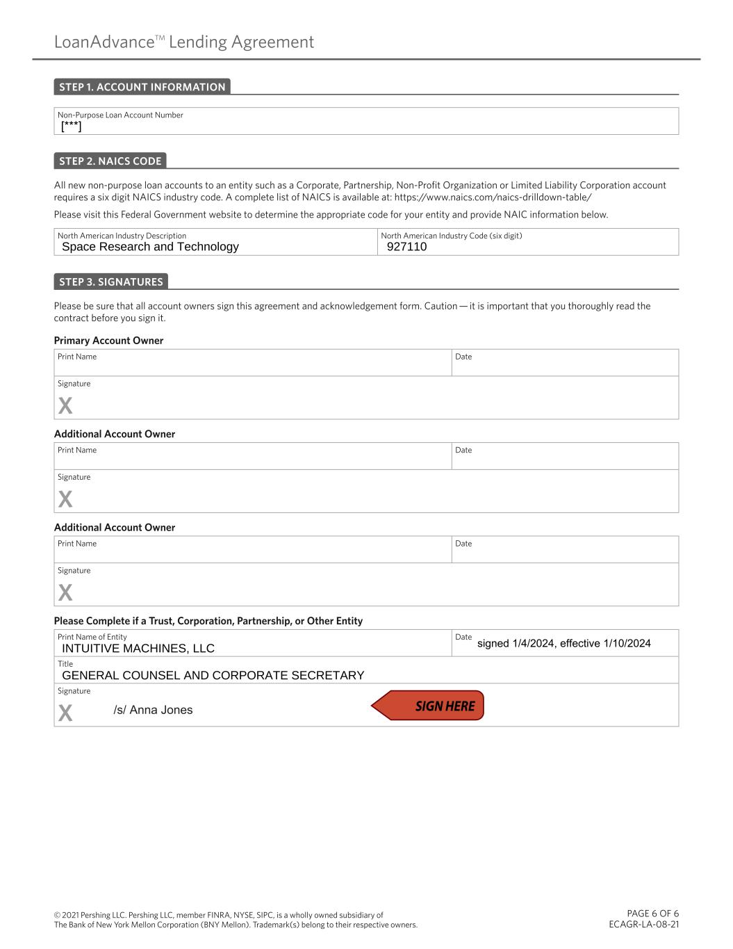 LoanAdvanceTM Lending Agreement PAGE 6 OF 6 ECAGR-LA-08-21 © 2021 Pershing LLC. Pershing LLC, member FINRA, NYSE, SIPC, is a wholly owned subsidiary of The Bank of New York Mellon Corporation (BNY Mellon). Trademark(s) belong to their respective owners. STEP 1. ACCOUNT INFORMATION Non-Purpose Loan Account Number STEP 2. NAICS CODE All new non-purpose loan accounts to an entity such as a Corporate, Partnership, Non-Profit Organization or Limited Liability Corporation account requires a six digit NAICS industry code. A complete list of NAICS is available at: https://www.naics.com/naics-drilldown-table/ Please visit this Federal Government website to determine the appropriate code for your entity and provide NAIC information below. North American Industry Description North American Industry Code (six digit) STEP 3. SIGNATURES Please be sure that all account owners sign this agreement and acknowledgement form. Caution — it is important that you thoroughly read the contract before you sign it. Primary Account Owner Print Name Date Signature X Additional Account Owner Print Name Date Signature X Additional Account Owner Print Name Date Signature X Please Complete if a Trust, Corporation, Partnership, or Other Entity Print Name of Entity Date Title Signature X [***] Space Research and Technology 927110 INTUITIVE MACHINES, LLC GENERAL COUNSEL AND CORPORATE SECRETARY signed 1/4/2024, effective 1/10/2024 /s/ Anna Jones